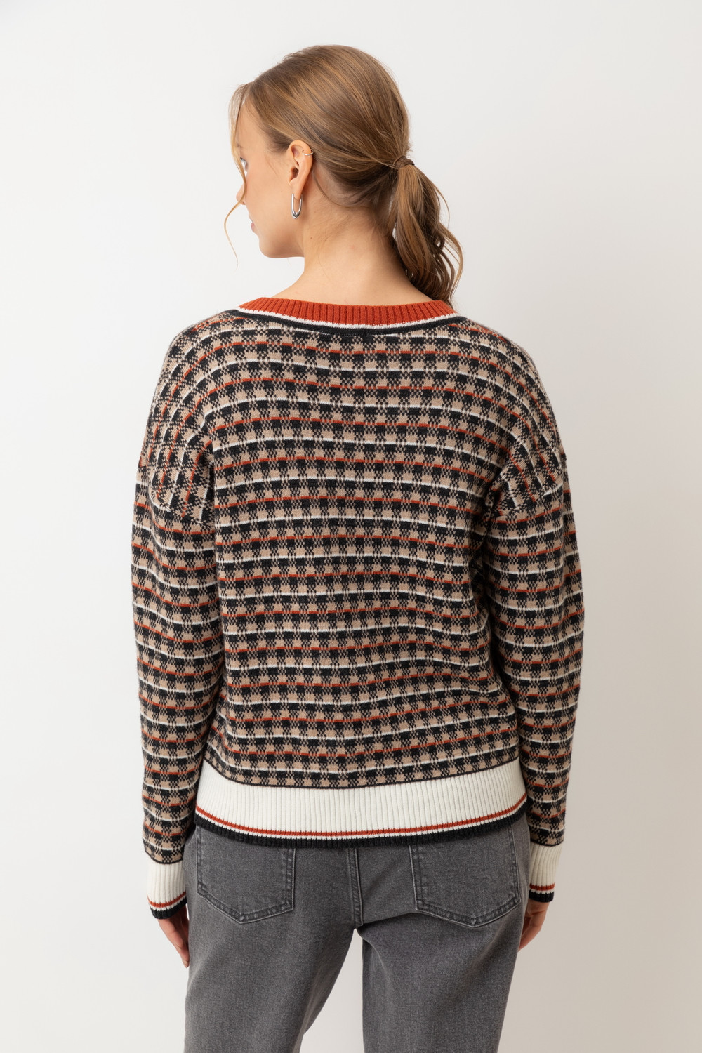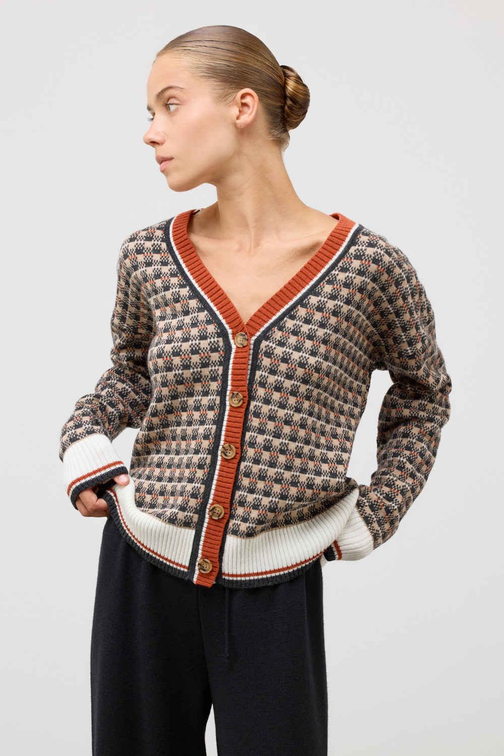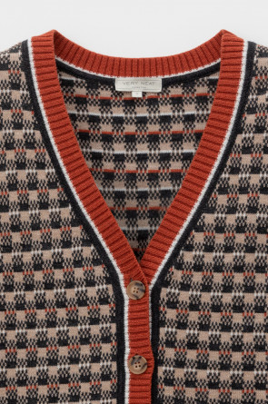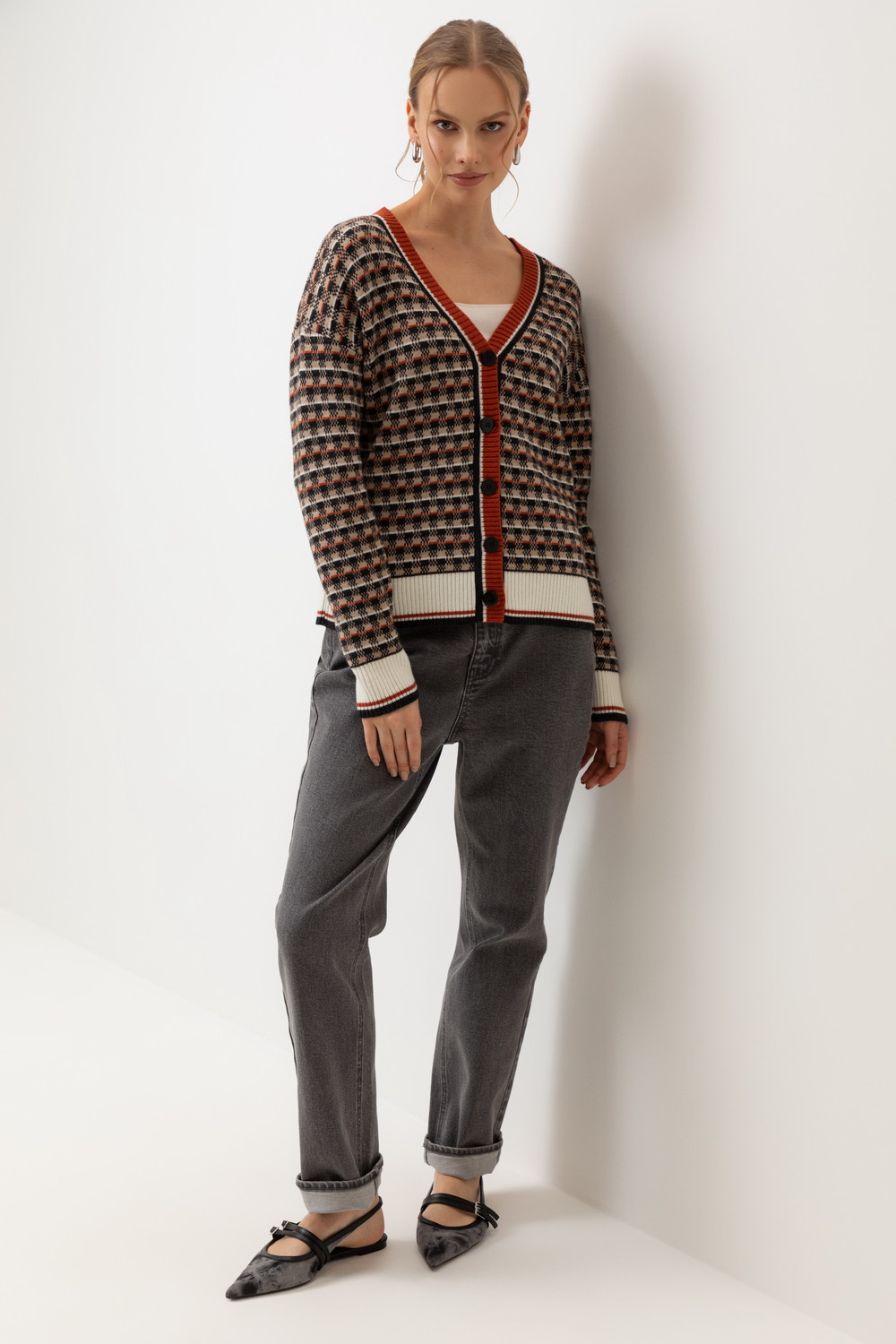 Элегантный кардиган в кантри-стиле изготовлен из высококачественной пряжи с применением передовой технологии смешанных волокон. Изысканное сочетание шерсти и акрила создает непревзойденный комфорт: модель деликатно подчеркивает силуэт, обеспечивает нежное прикосновение к коже и сохраняет безупречный внешний вид.
