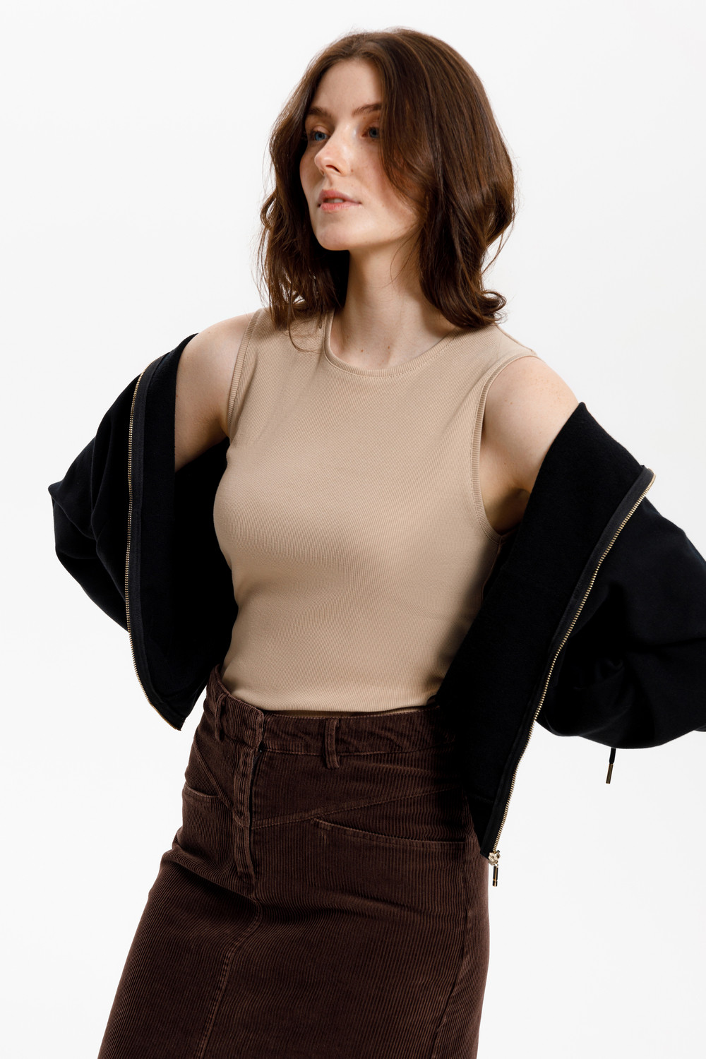 Базовым элементом гардероба является топ из эластичного трикотажа в рубчик. Широкое плечо и высокий вырез делают изделие комфортным и универсальным в носке.