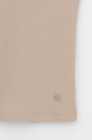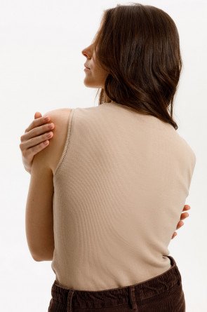 Базовым элементом гардероба является топ из эластичного трикотажа в рубчик. Широкое плечо и высокий вырез делают изделие комфортным и универсальным в носке.