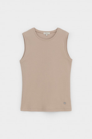 Базовым элементом гардероба является топ из эластичного трикотажа в рубчик. Широкое плечо и высокий вырез делают изделие комфортным и универсальным в носке.