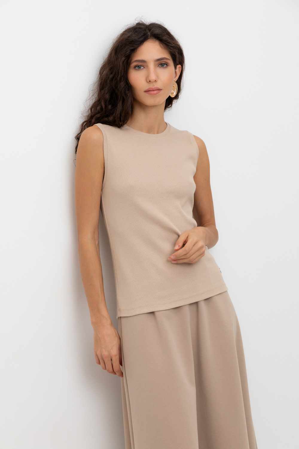 Базовым элементом гардероба является топ из эластичного трикотажа в рубчик. Широкое плечо и высокий вырез делают изделие комфортным и универсальным в носке.