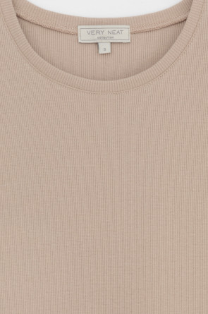 Базовым элементом гардероба является топ из эластичного трикотажа в рубчик. Широкое плечо и высокий вырез делают изделие комфортным и универсальным в носке.