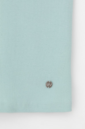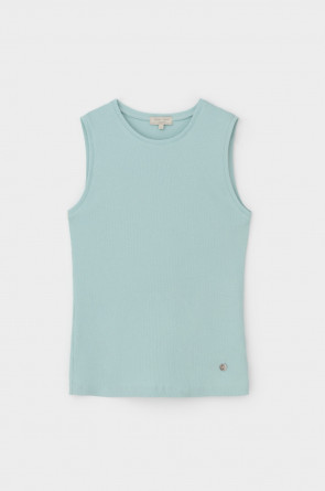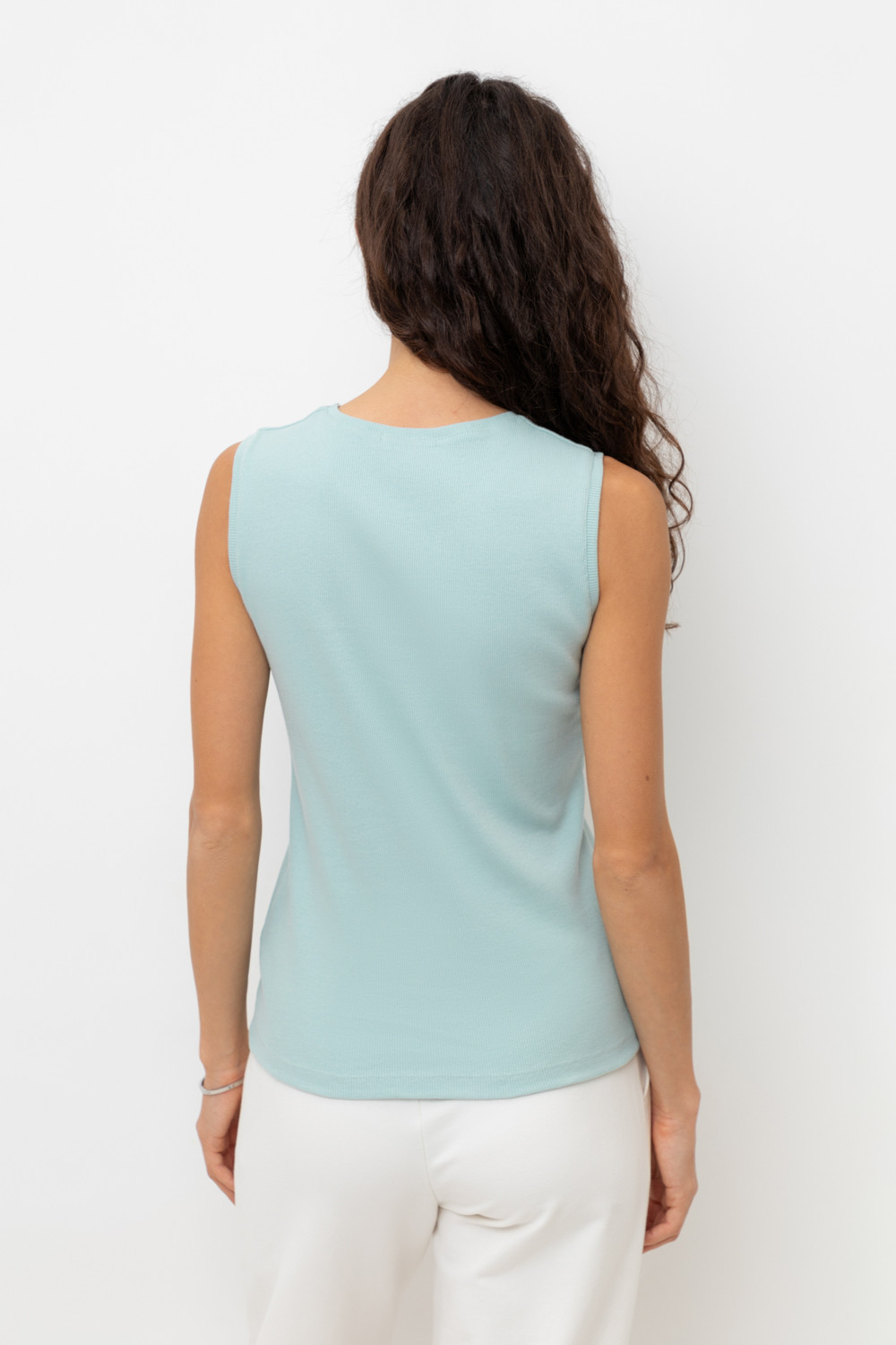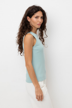 Базовым элементом гардероба является топ из эластичного трикотажа в рубчик. Широкое плечо и высокий вырез делают изделие комфортным и универсальным в носке.