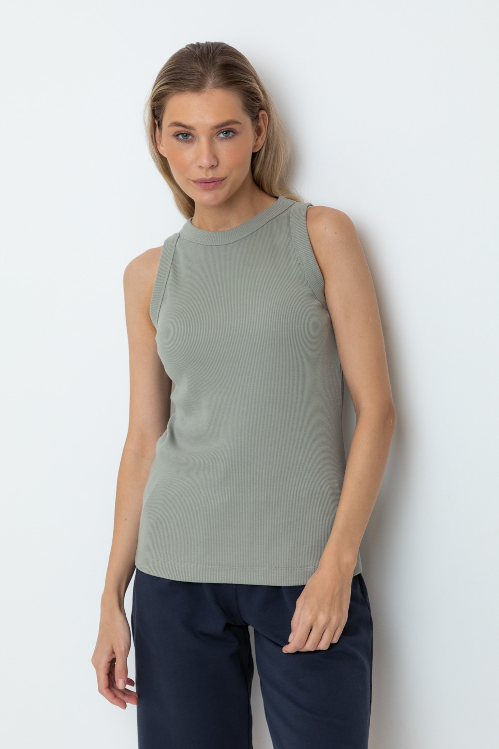 Базовая майка из трикотажного полотна в рубчик с добавлением эластана.