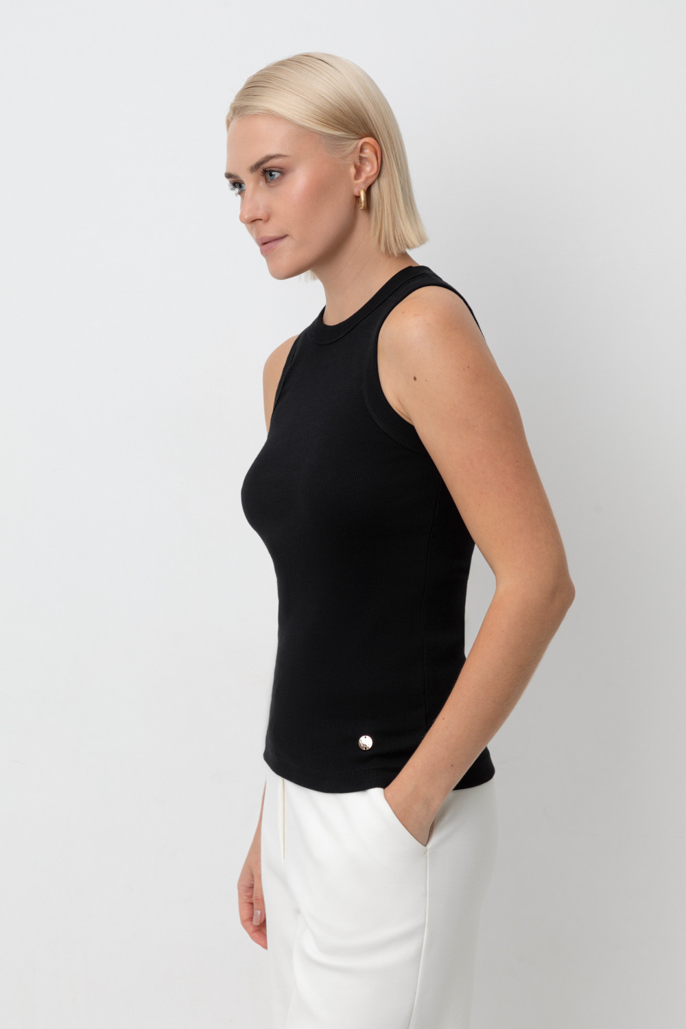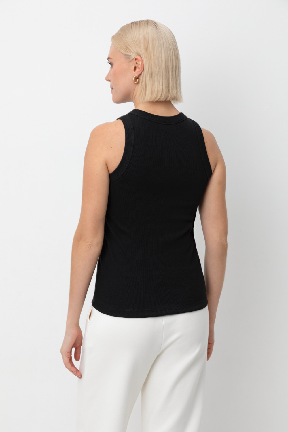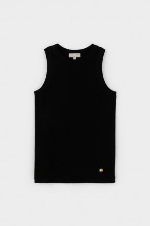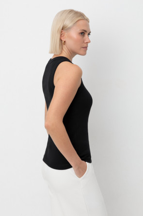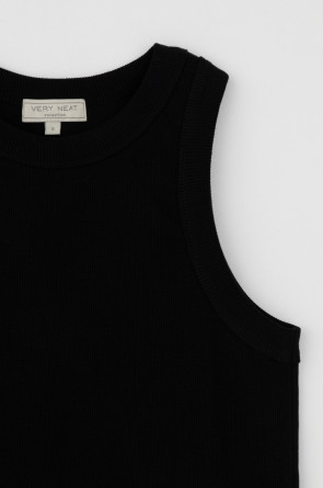Классическим элементом гардероба является базовый топ в рубчик. Бретели стандартной ширины, круглый вырез и добавление эластана делают изделие комфортным в носке и универсальным в повседневной жизни. Темный оттенок позволяет выбирать его в качестве базы под любой образ.