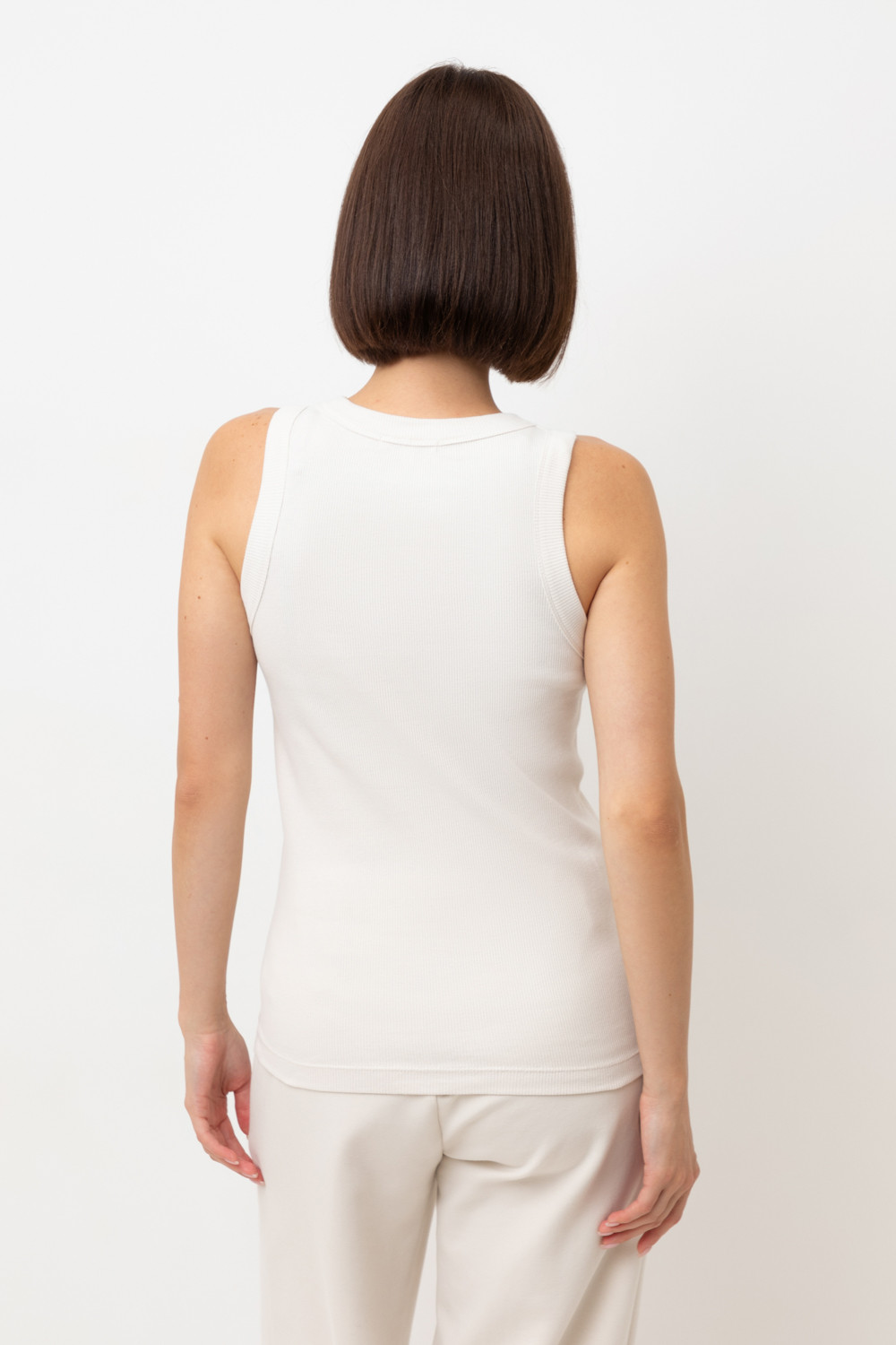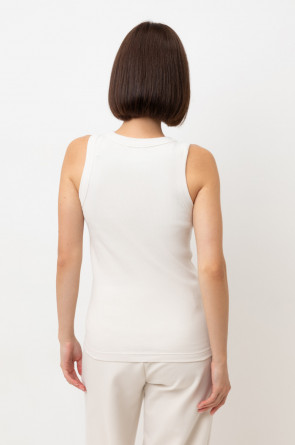 Классическим элементом гардероба является базовый топ в рубчик. Бретели стандартной ширины, круглый вырез и добавление эластана делают изделие комфортным в носке и универсальным в повседневной жизни. Молочный цвет позволяет выбирать его в качестве базы под любой образ.