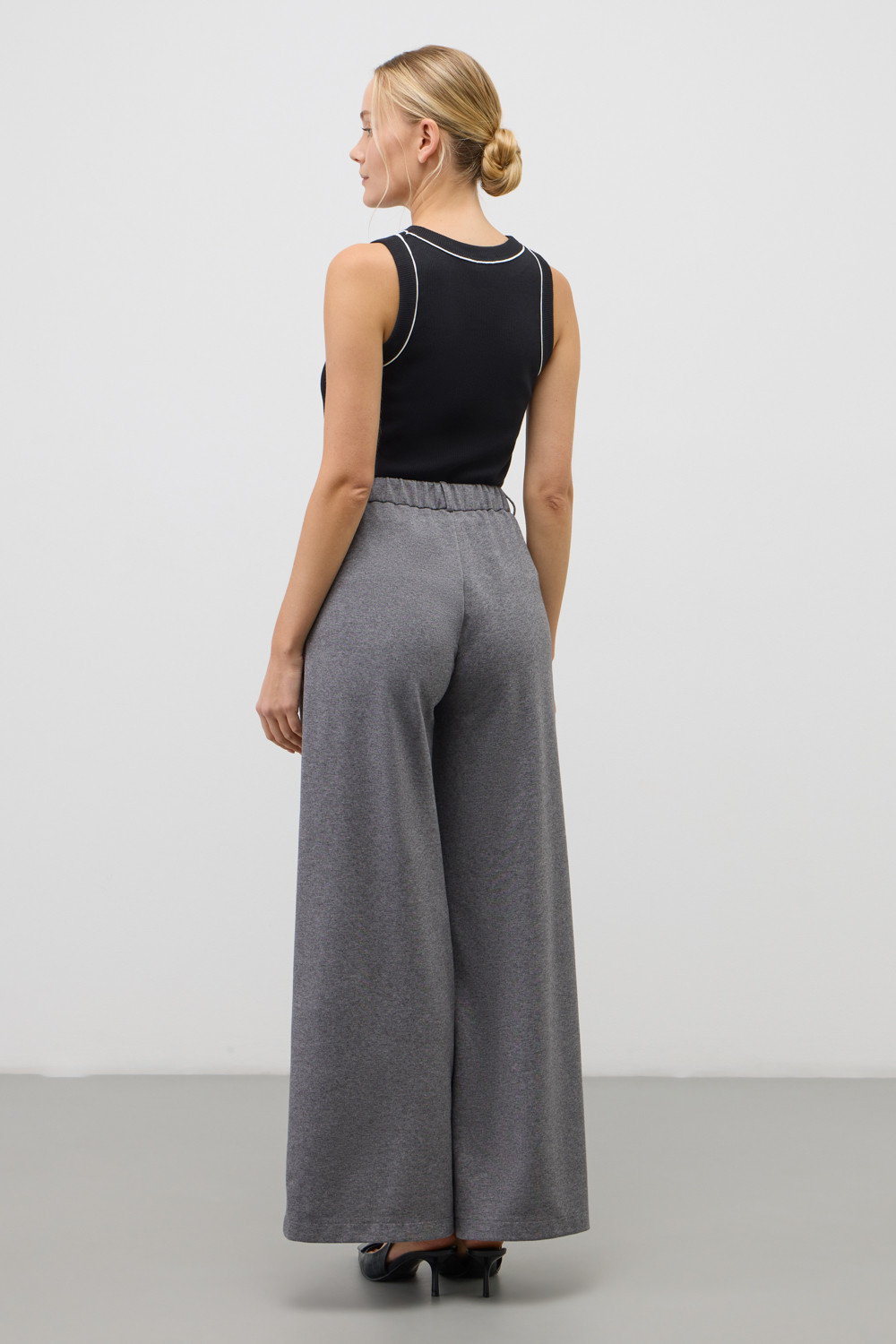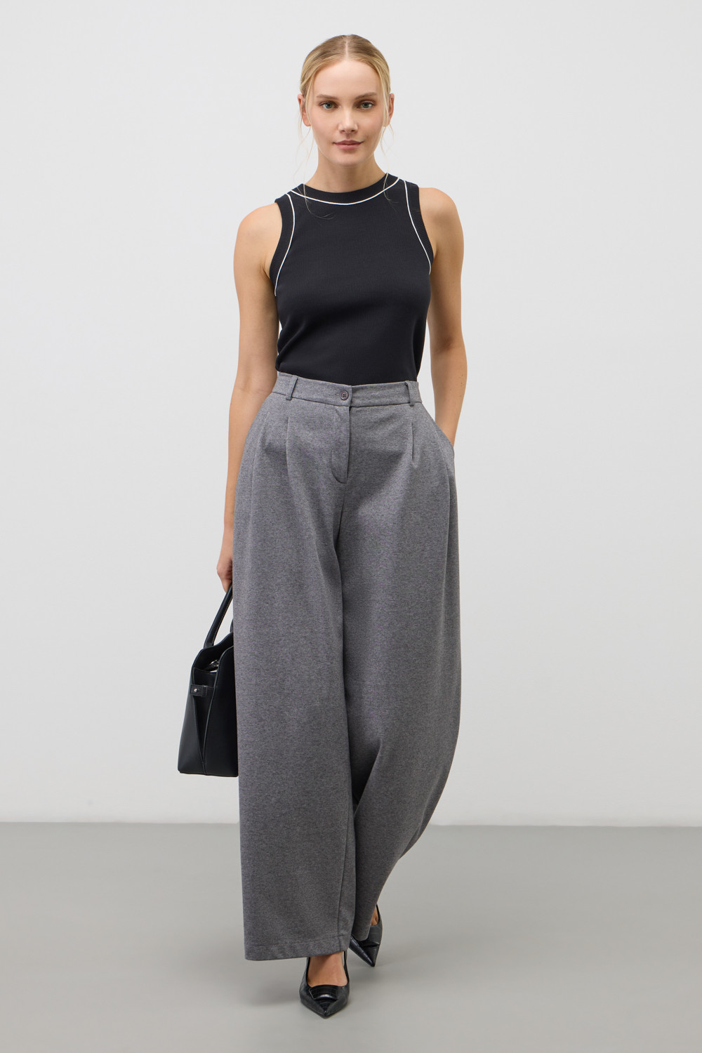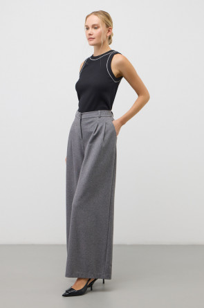 Классическим элементом гардероба является базовый топ в рубчик. Дополняет изделие отделка атласным кантом. Широкие бретели и высокий вырез делают топ комфортным в носке и универсальным в повседневной жизни.