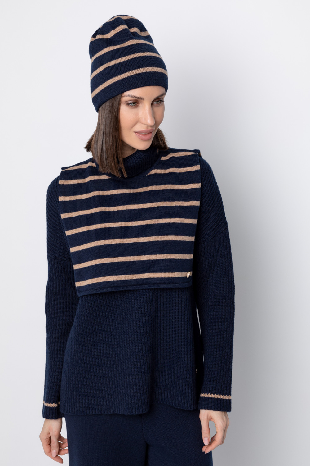 Уютная вязаная манишка с высоким воротником из шерсти и акрила. Шерсть в составе хорошо удерживает тепло, а волокна акрила делают изделие мягким и предотвращают деформацию и появление катышек. Лаконичный крой хорошо сочетается с верхней одеждой.
