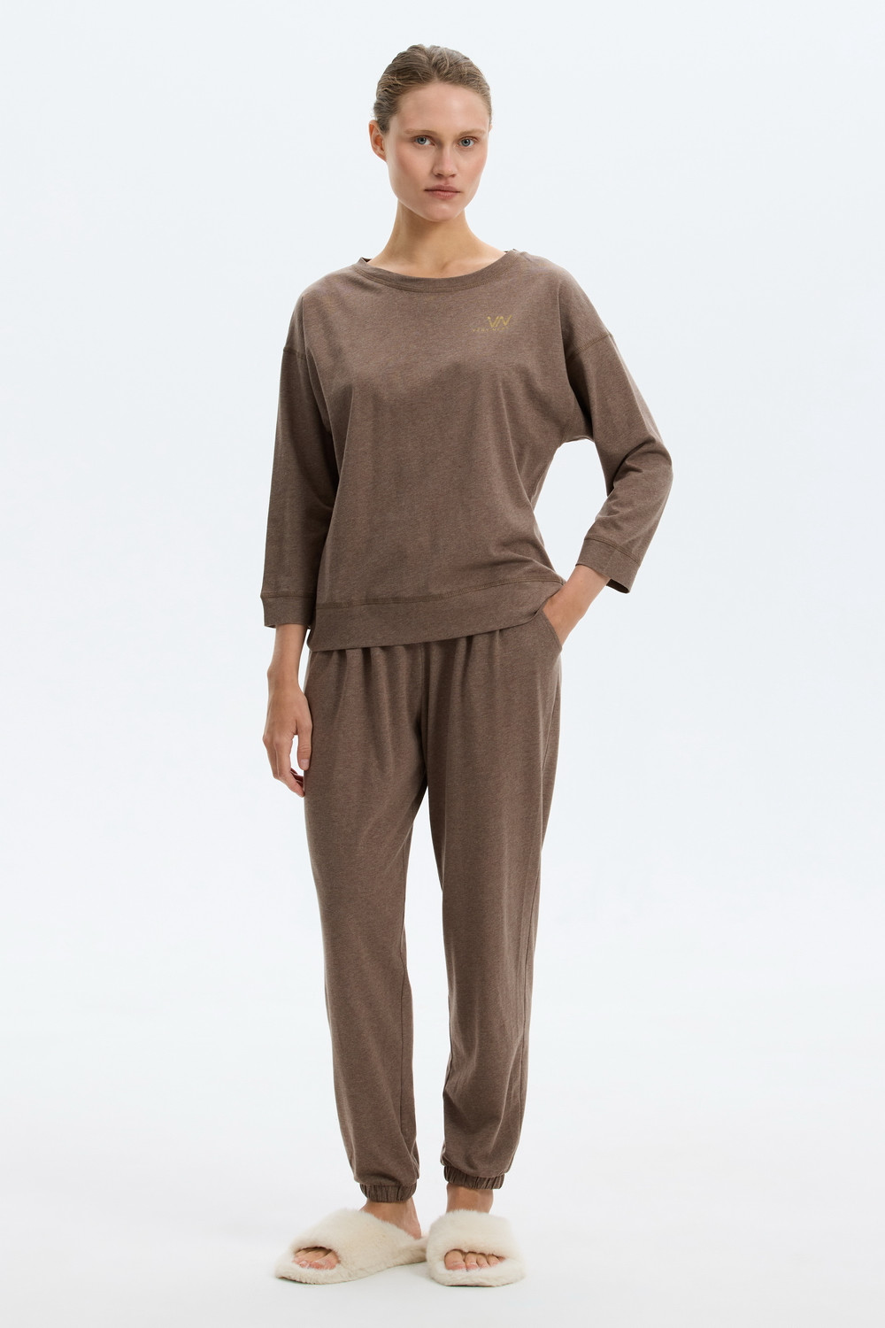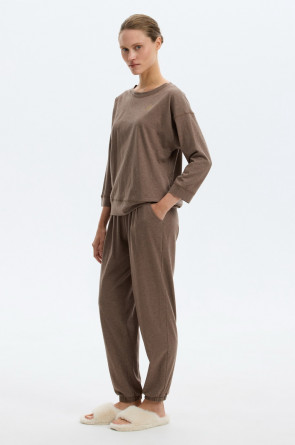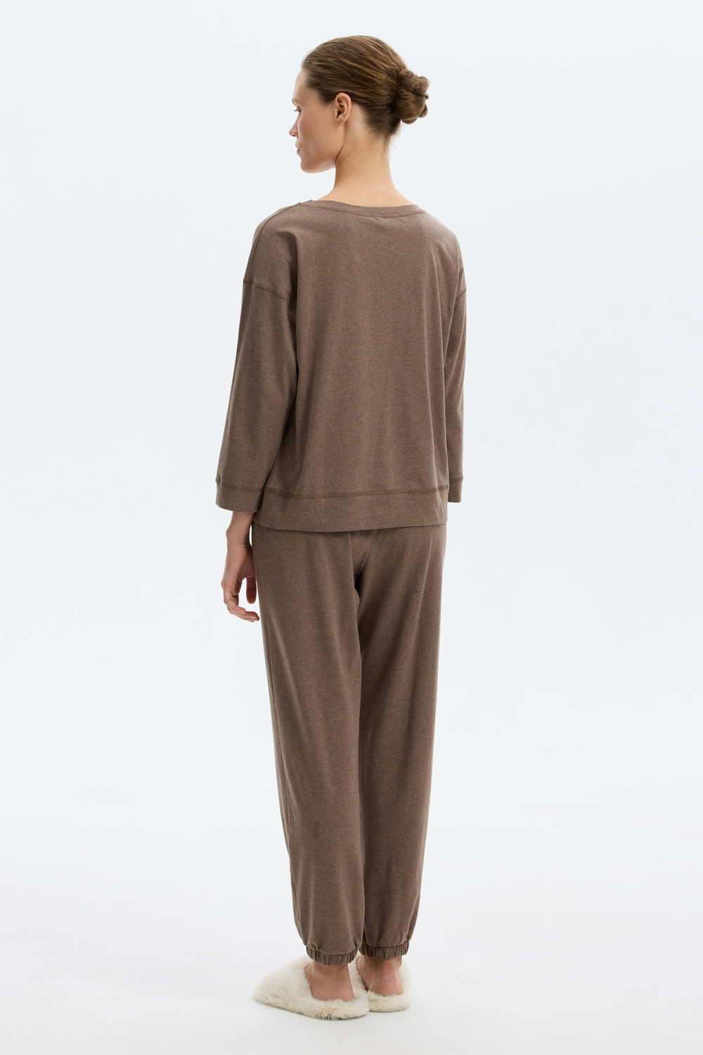 Домашний уют с комплектом из высококачественного хлопка. Зауженный крой брюк и джемпер со спущенным плечом созданы для придания максимального комфорта.
