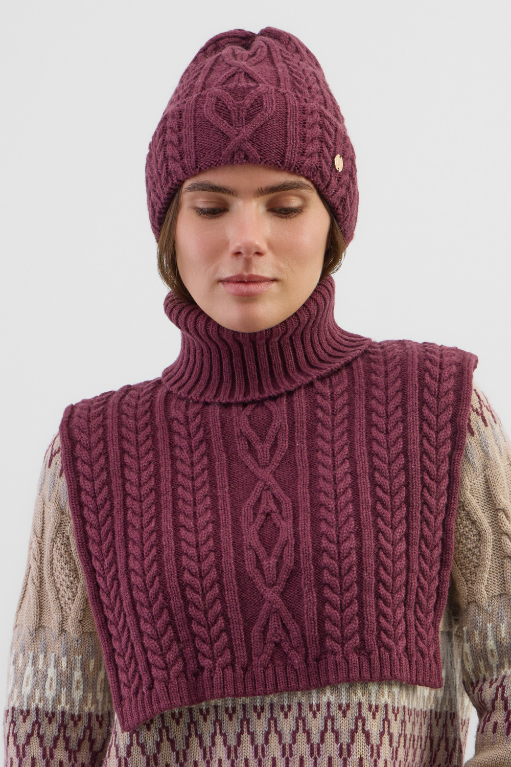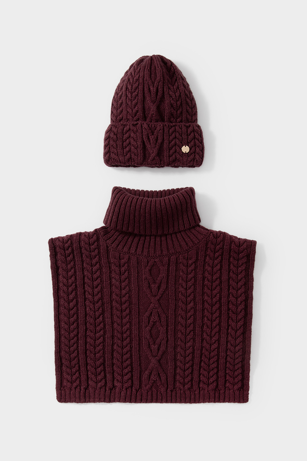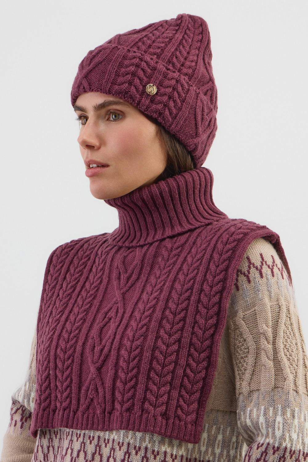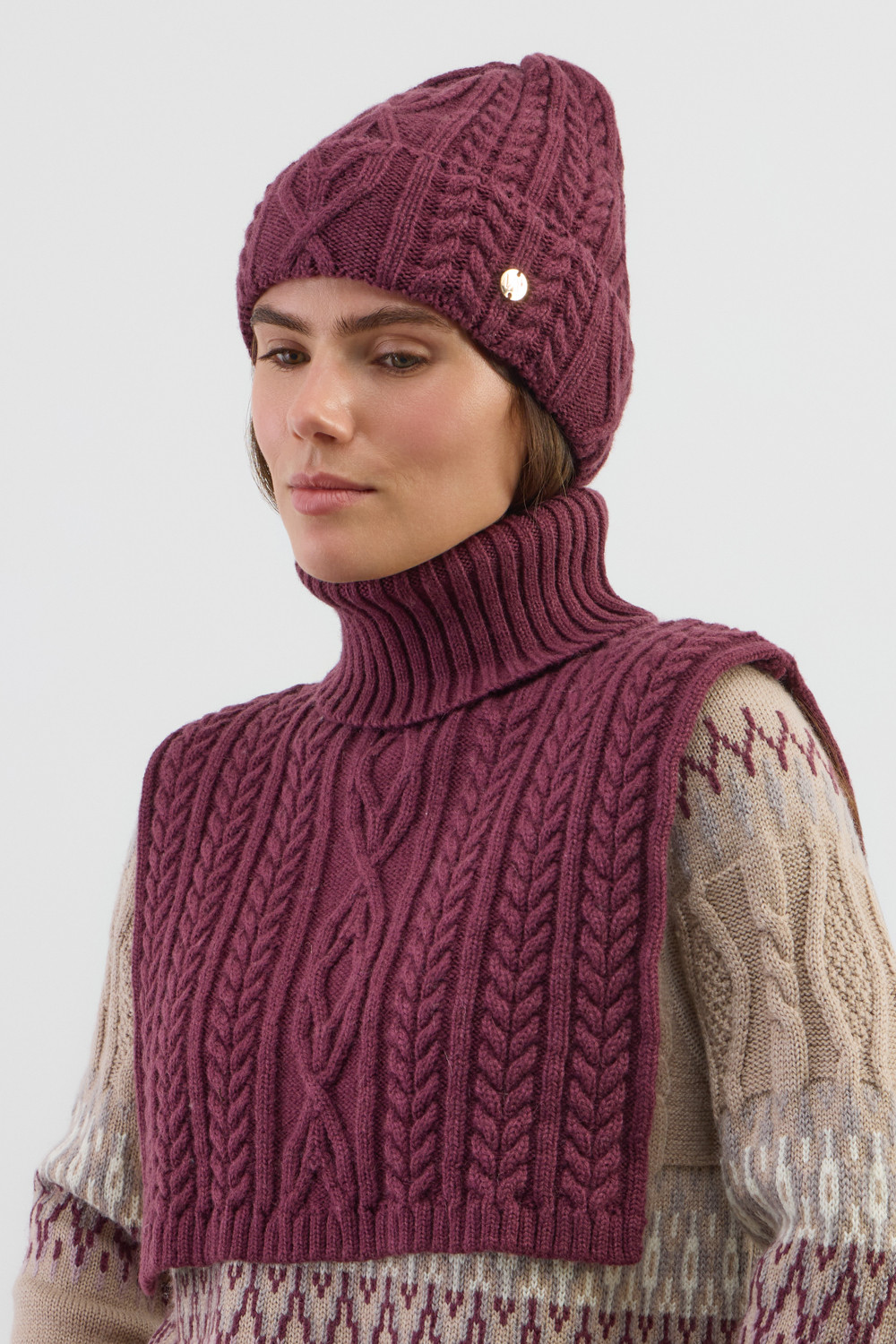 Комплект мягкая шапка с отворотом и теплая манишка. Шерсть хорошо сохраняет тепло, а волокна акрила придают изделиям мягкость. Все вязаные изделия проходят дополнительную влажно-тепловую обработку по итальянской технологии, что гарантирует минимальную усадку во время носки.