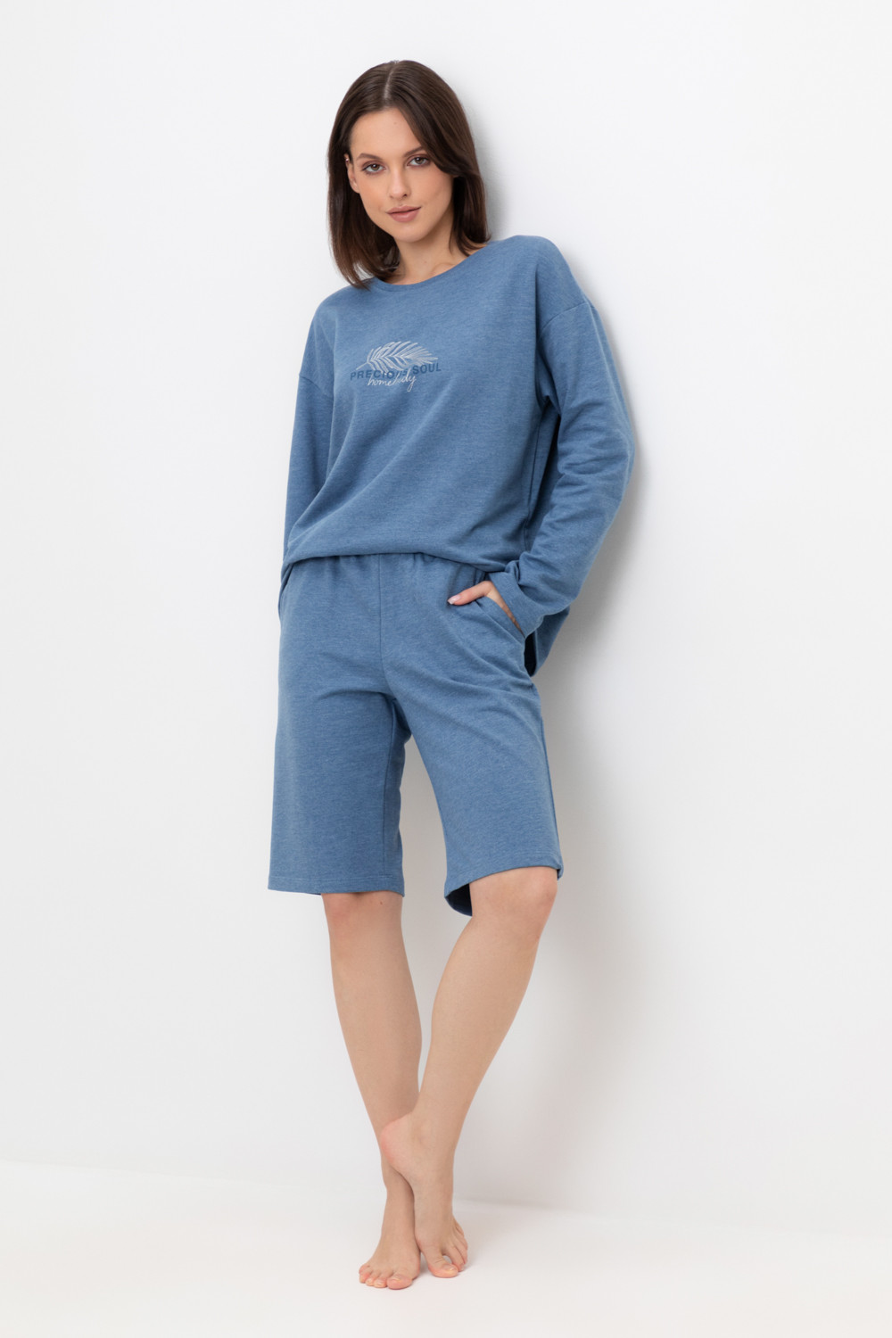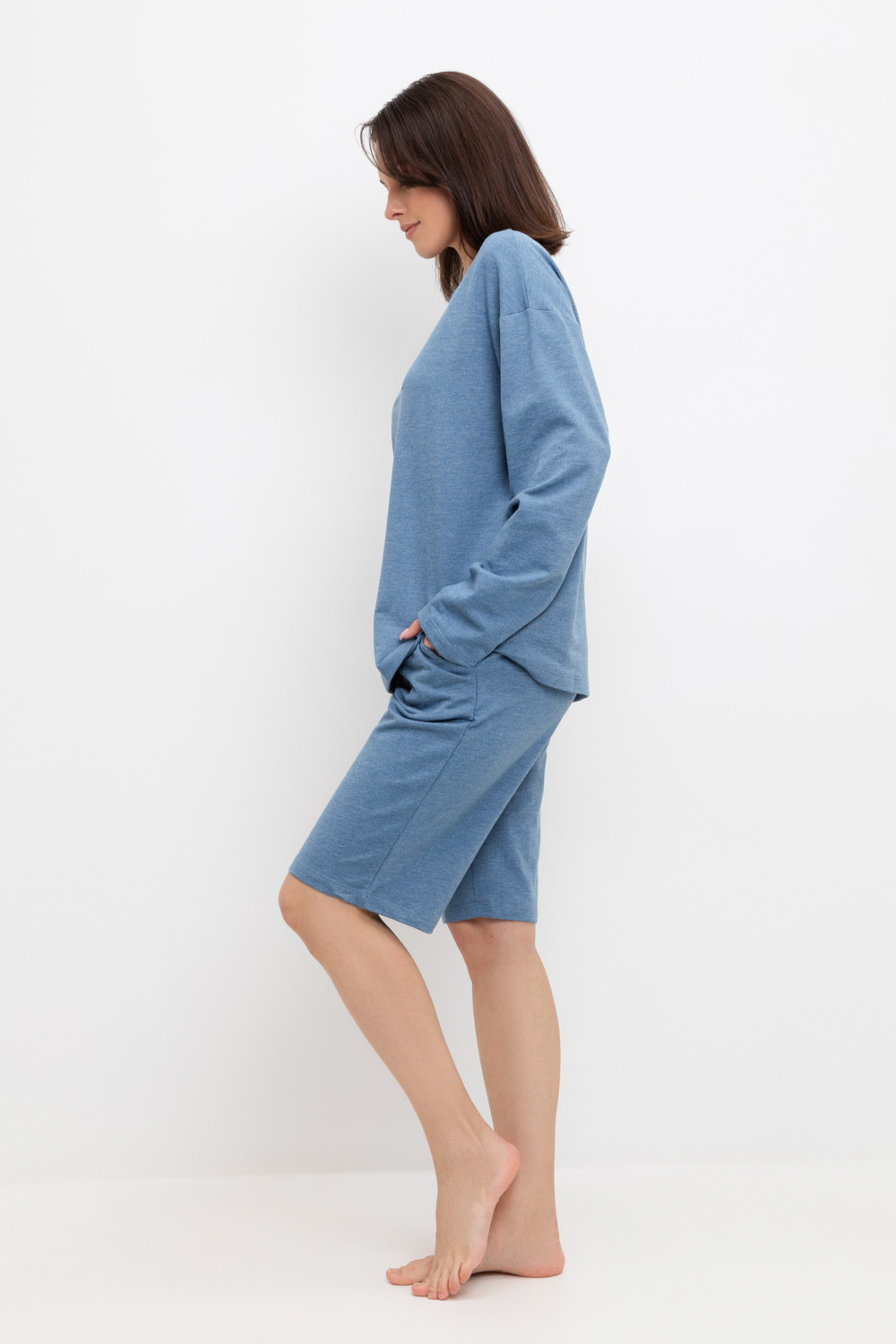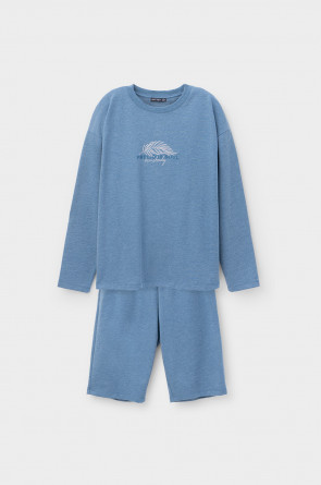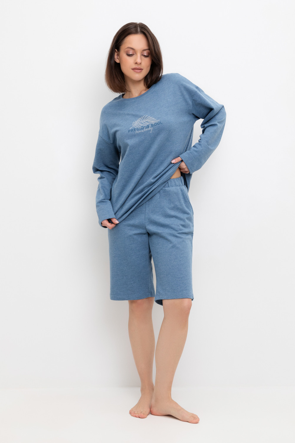 Уютный комплект для комфортного отдыха из меланжевого футера на основе натурального хлопка. Джемпер с длинными рукавами и спущенной линией плеча украшен лаконичным принтом. Шорты с боковыми карманами и мягким поясом на резинке удобно садятся по фигуре. Свободный силуэт не сковывает движения. Гладкий материал приятен к телу и позволяет коже дышать.