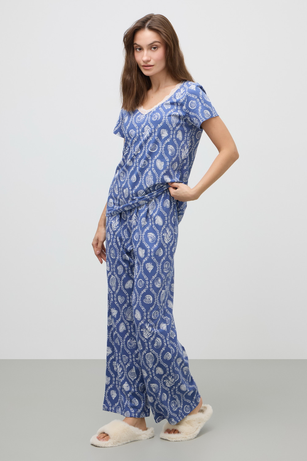 Комплект из высококачественного гребенного хлопка. Футболку дополняет вырез, обработанный мягким, эластичным кружевом.