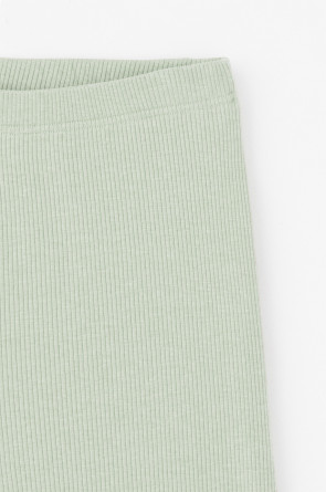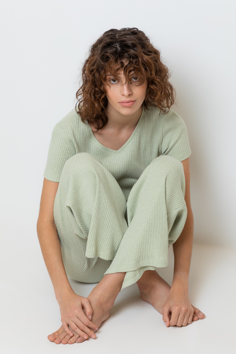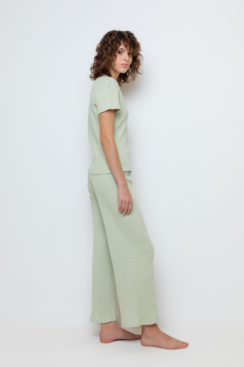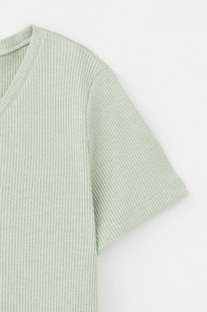 Комплект для комфортного сна из меланжевого трикотажа в рубчик. Свободная футболка с V- образным вырезом. Брюки с мягким поясом на резинке удобно садятся по фигуре. Низ футболки и брюк обработан микрооверлоком.