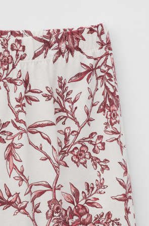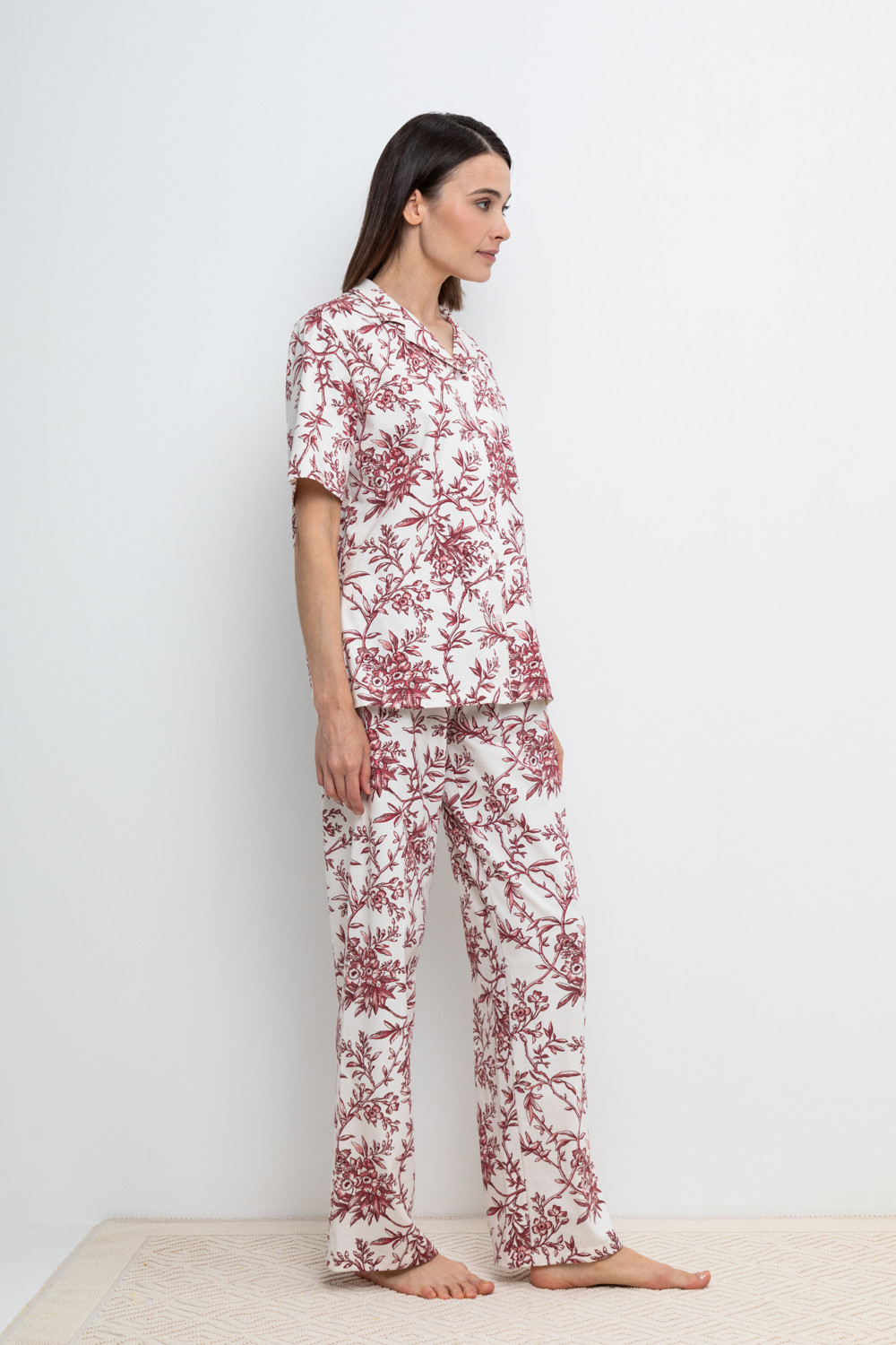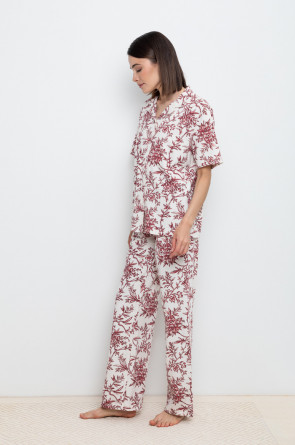 Комплект для комфортного сна из набивного трикотажа с нежным рисунком из 100% натурального хлопка. Рубашка с короткими рукавами на пуговицах . Брюки с мягким поясом на резинке. Гладкий материал приятен к телу, не теряет форму и позволяет коже дышать.