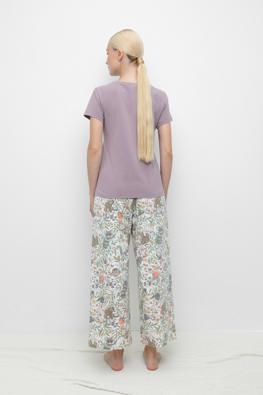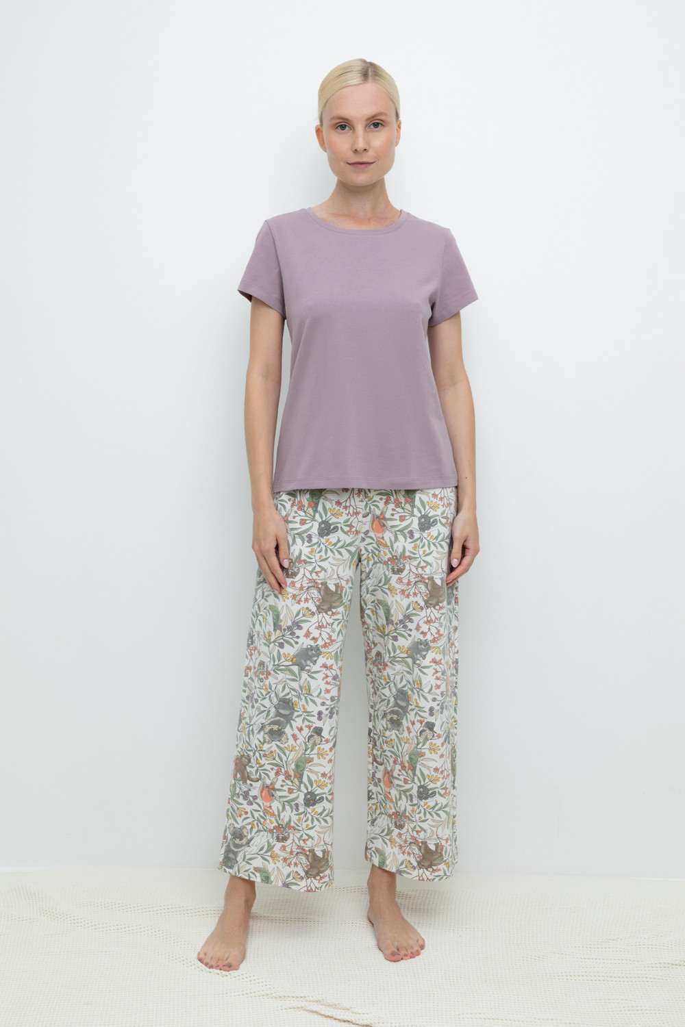 Комплект для сна и отдыха из натурального хлопка с добавлением лайкры. Футболка стандартной длины комфортно садится по фигуре. Укороченные просторные брюки из набивного трикотажа с мягким поясом на резинке.
