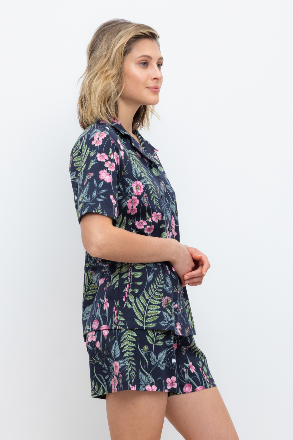 Комплект для комфортного сна из набивного трикотажа с нежным рисунком из 100% натурального хлопка. Рубашка с короткими рукавами на пуговицах. Шорты с мягким поясом на резинке. Гладкий материал приятен к телу, не теряет форму и позволяет коже дышать.