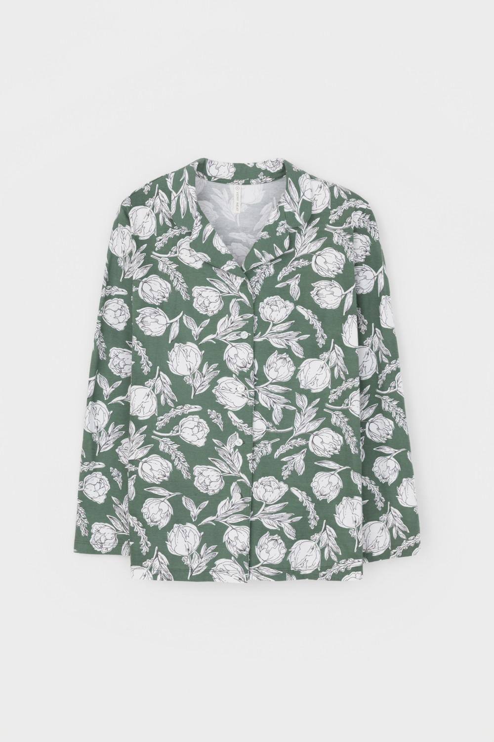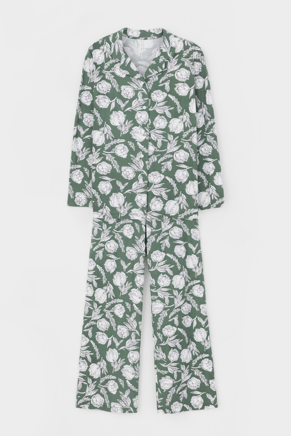 Комплект для комфортного сна и отдыха из набивного трикотажа из 100% натурального хлопка. Рубашка с длинными рукавами на пуговицах. Брюки с мягким поясом на резинке. Гладкий материал приятен к телу, не теряет форму и позволяет коже дышать.