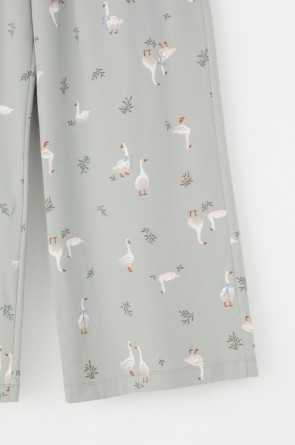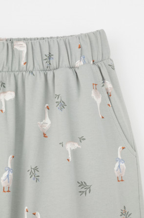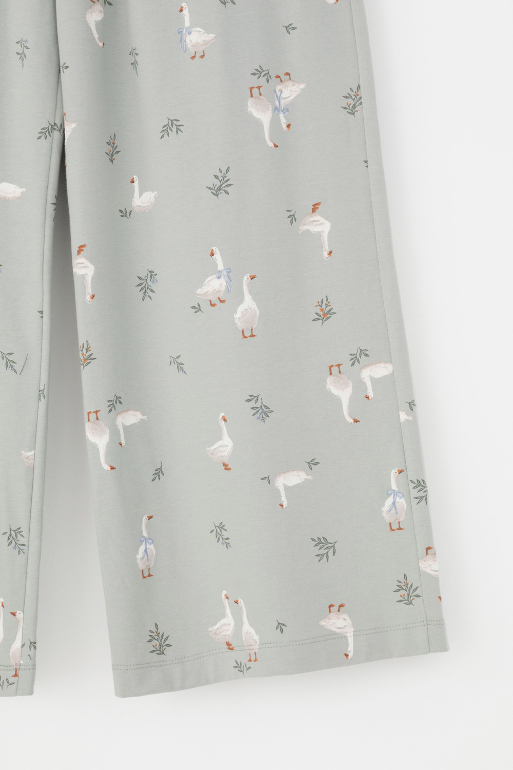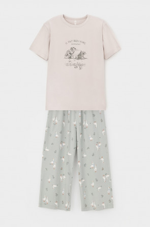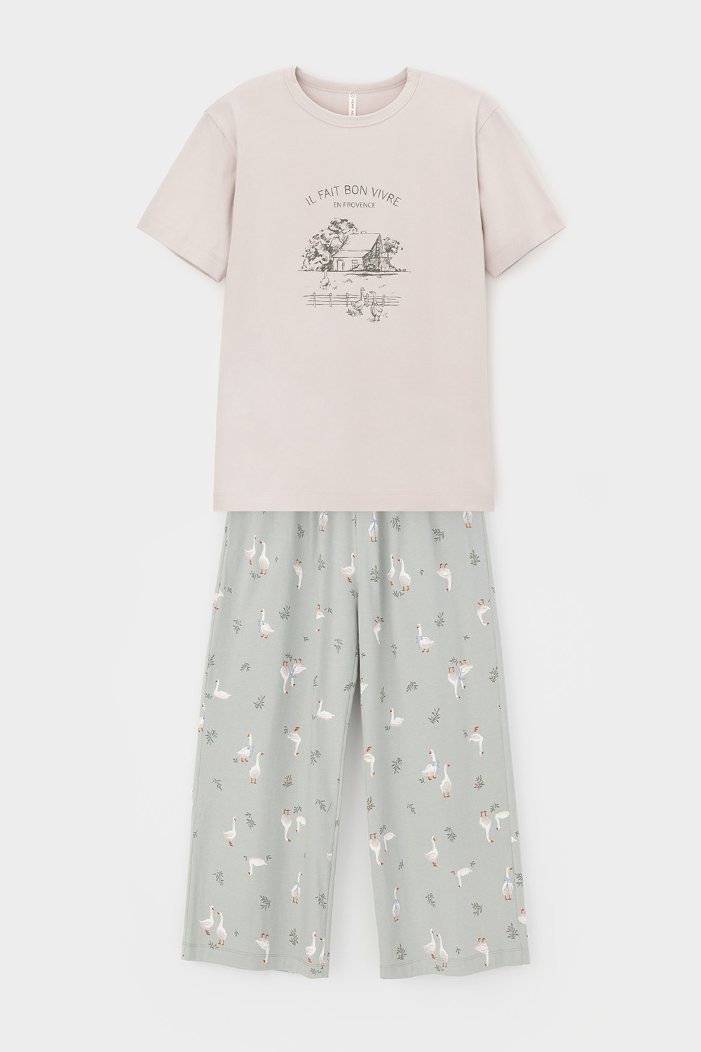 Комплект для сна и отдыха из натурального хлопка с добавлением лайкры. Футболка стандартной длины комфортно садится по фигуре. Укороченные просторные брюки с карманами из набивного трикотажа с мягким поясом на резинке.