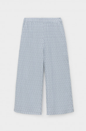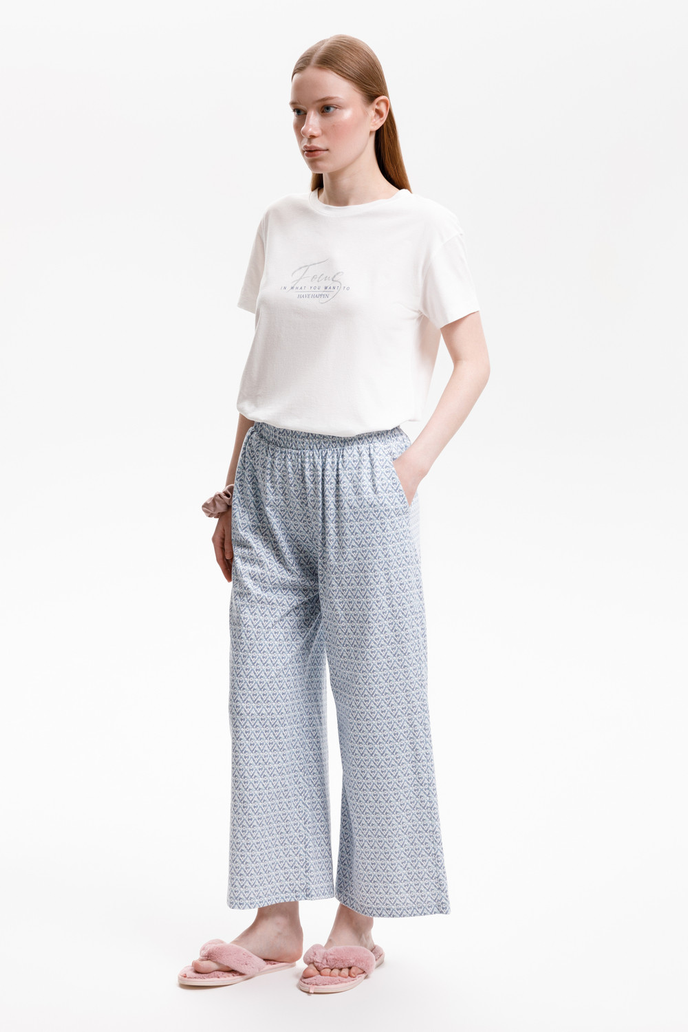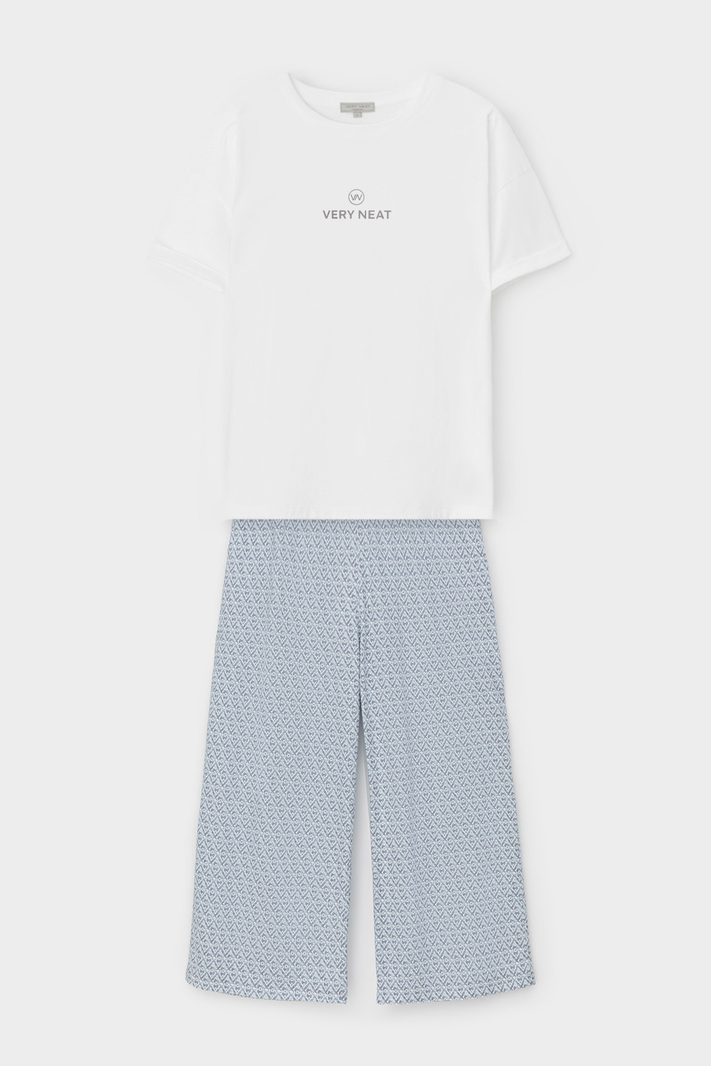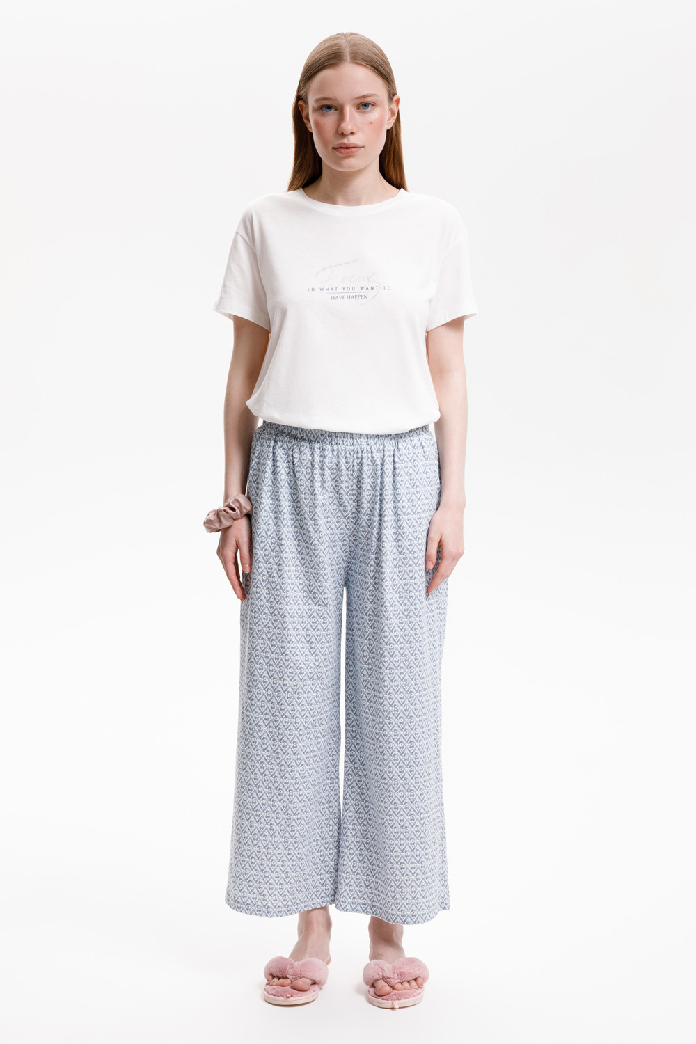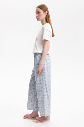 Комплект из высококачественного гребенного хлопка. Мягкий на ощупь принт на футболке выполнен на основе водных красок, что обеспечивает устойчивость к многократным стиркам. Брюки длины 7/8 с удобным поясом на резинке и практичными карманами добавляют практичности и удобства.