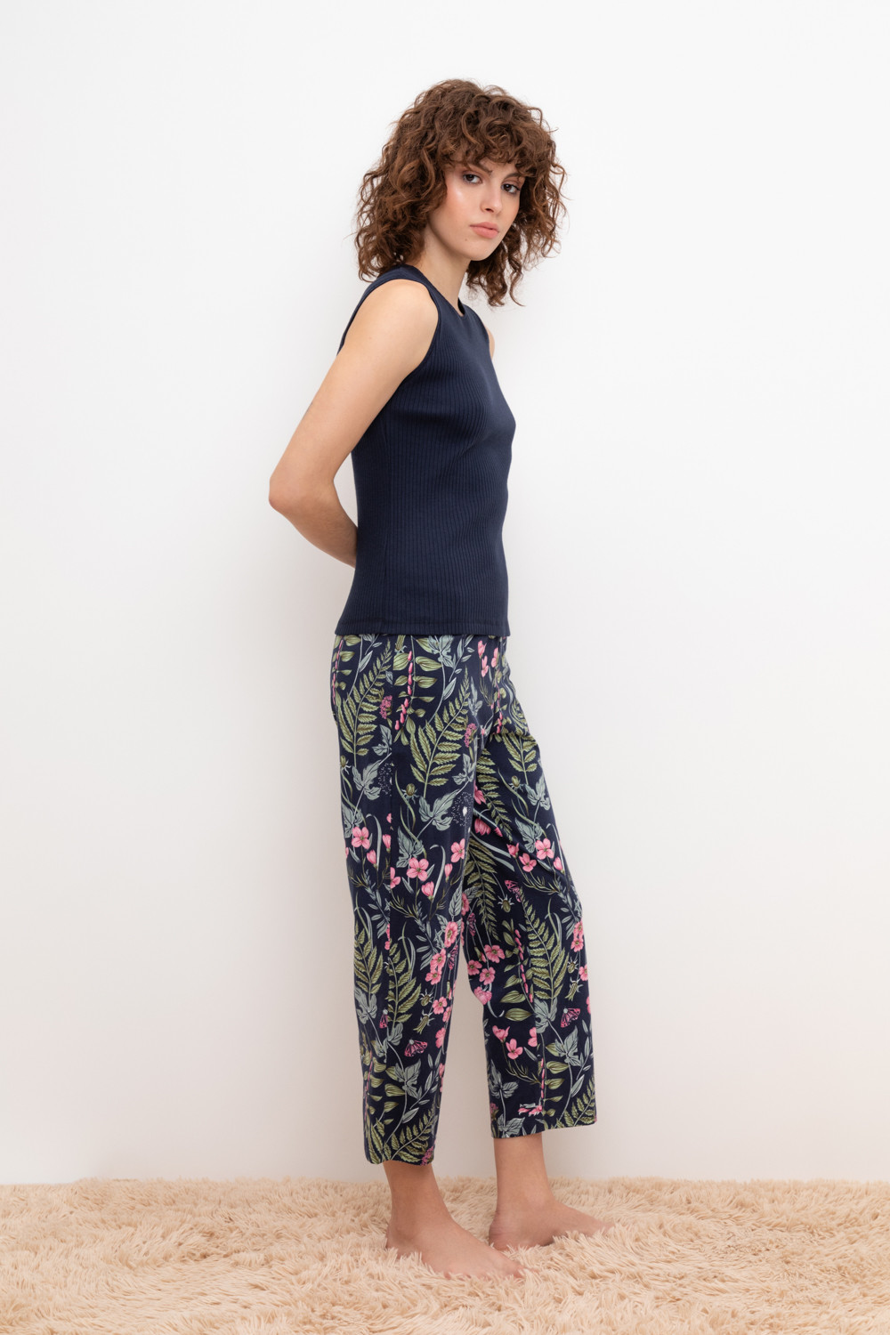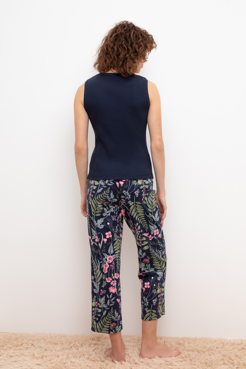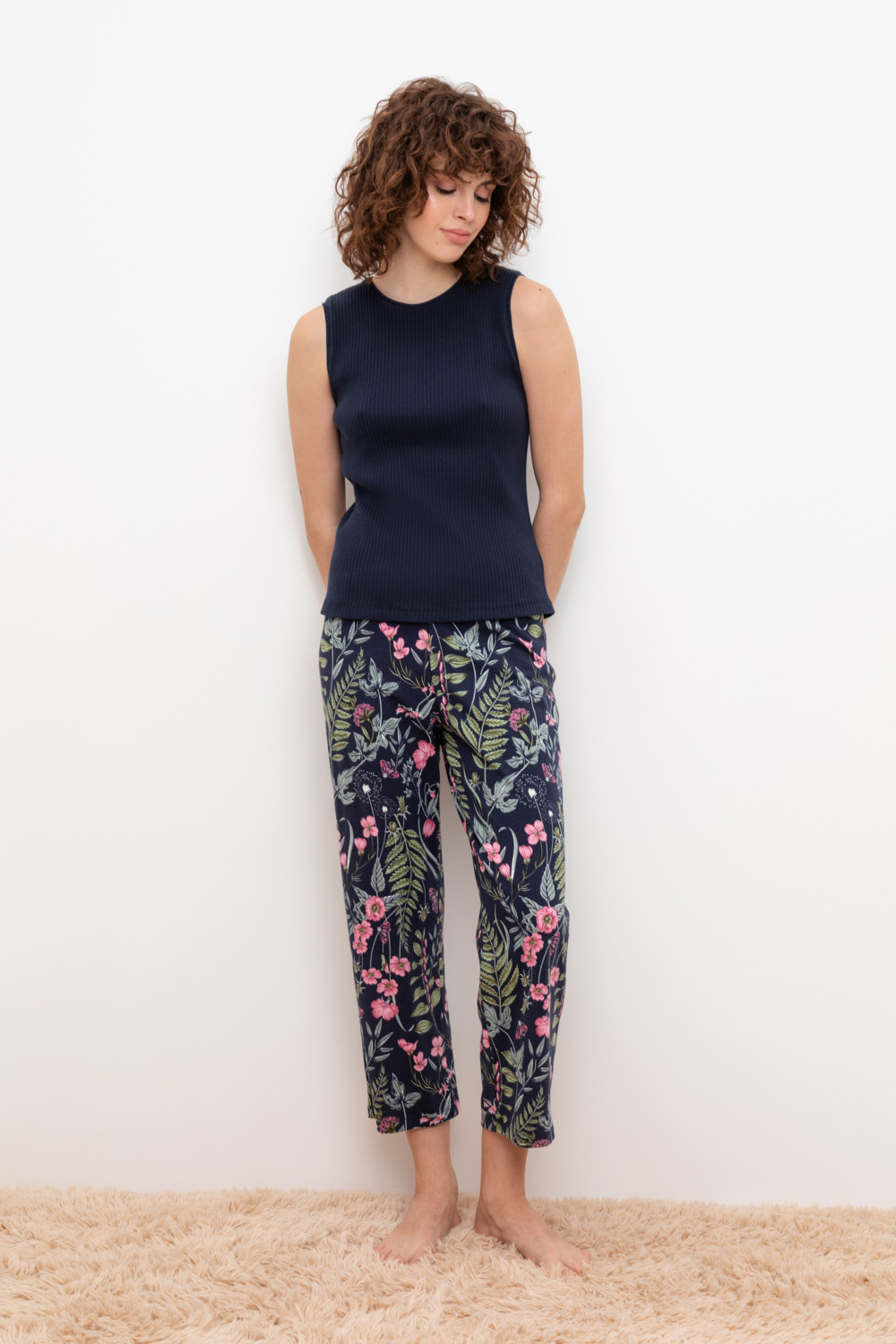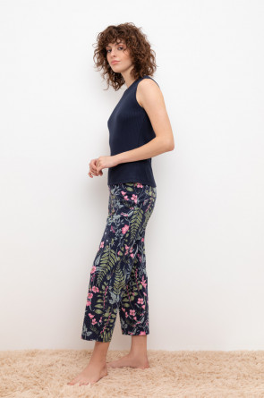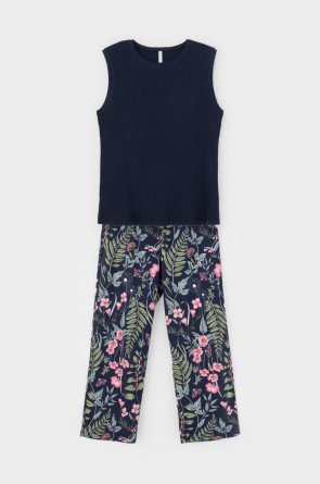 Комплект для комфортного сна из трикотажного полотна с набивным рисунком. Майка из эластичного трикотажа с добавлением лайкры в рубчик. Брюки с мягким поясом на резинке удобно садятся по фигуре. Гладкий материал приятен к телу, не теряет форму и позволяет коже дышать.