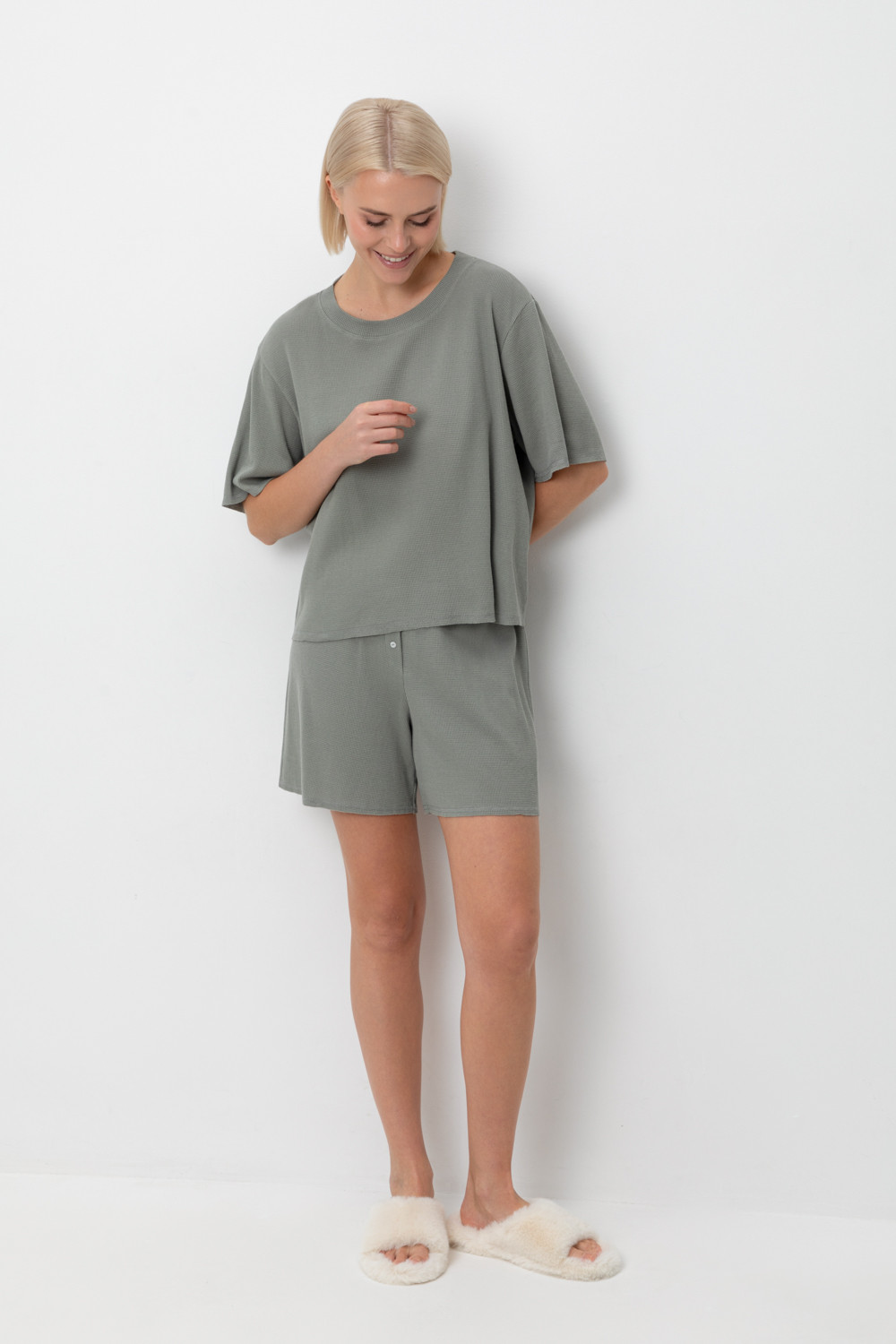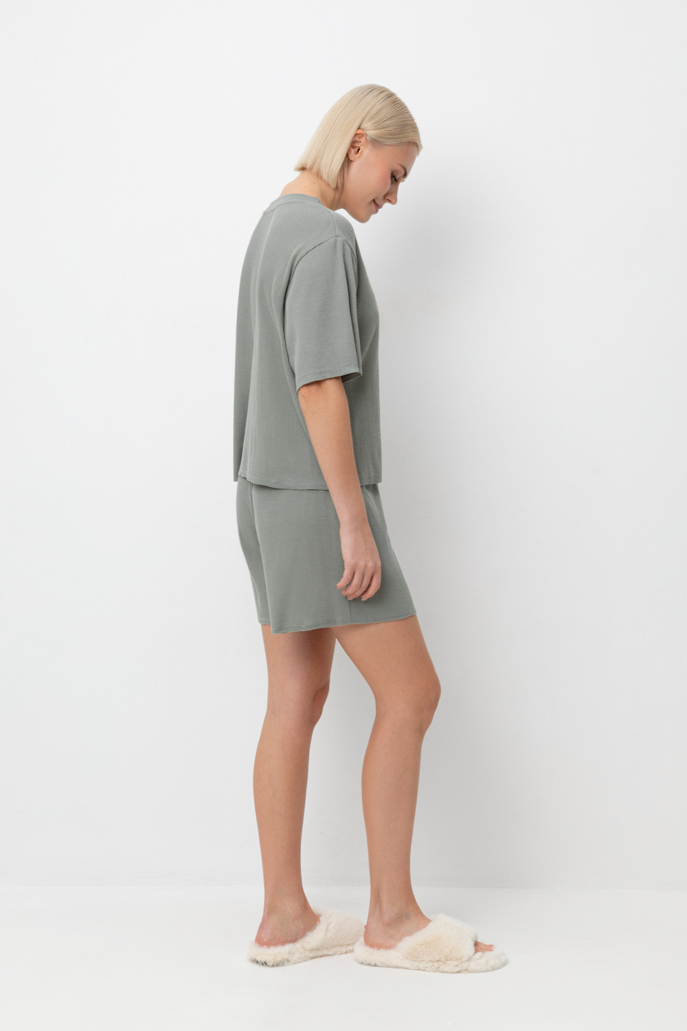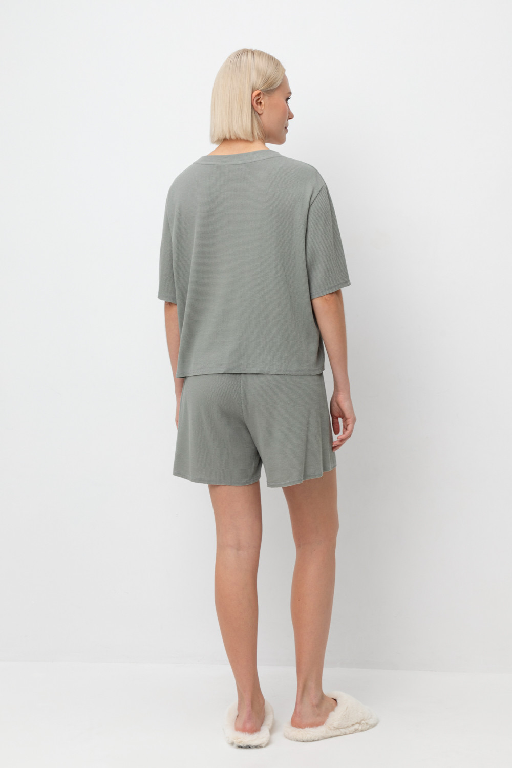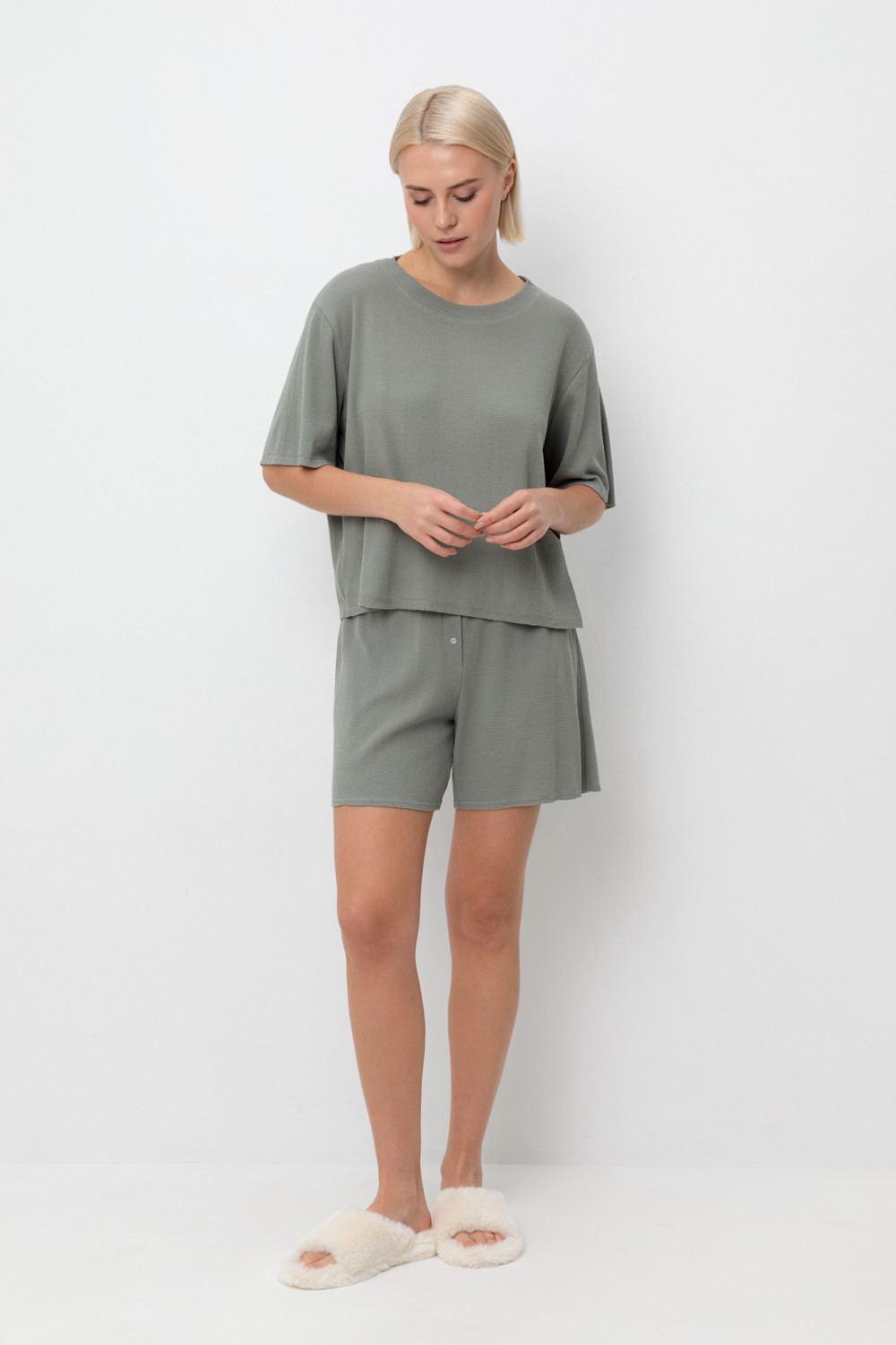Комплект из объемного трикотажа с добавлением эластичных волокон. Свободный силуэт и мягкий пояс обеспечат комфорт во время сна и отдыха.