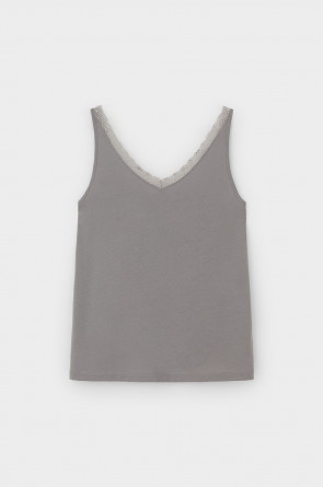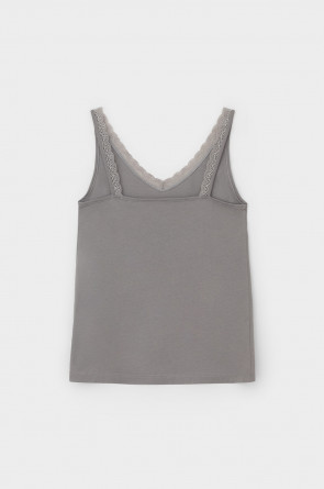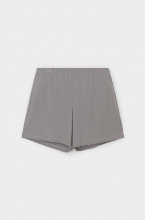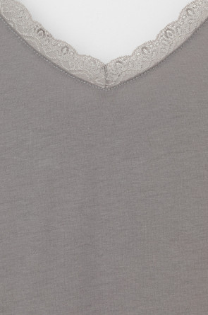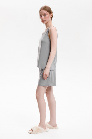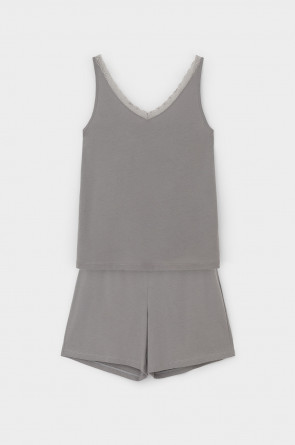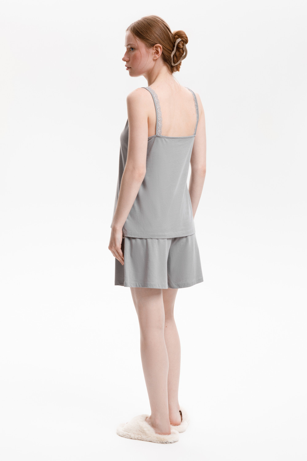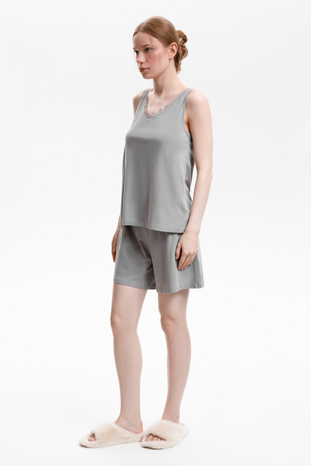 Легкий комплект приглушенного зеленого оттенка выполнен из хлопка с нежнейшим модалом. Свободный крой топа декорированный эластичным кружевом и мягкий пояс шорт обеспечивают легкость и свободу движений.