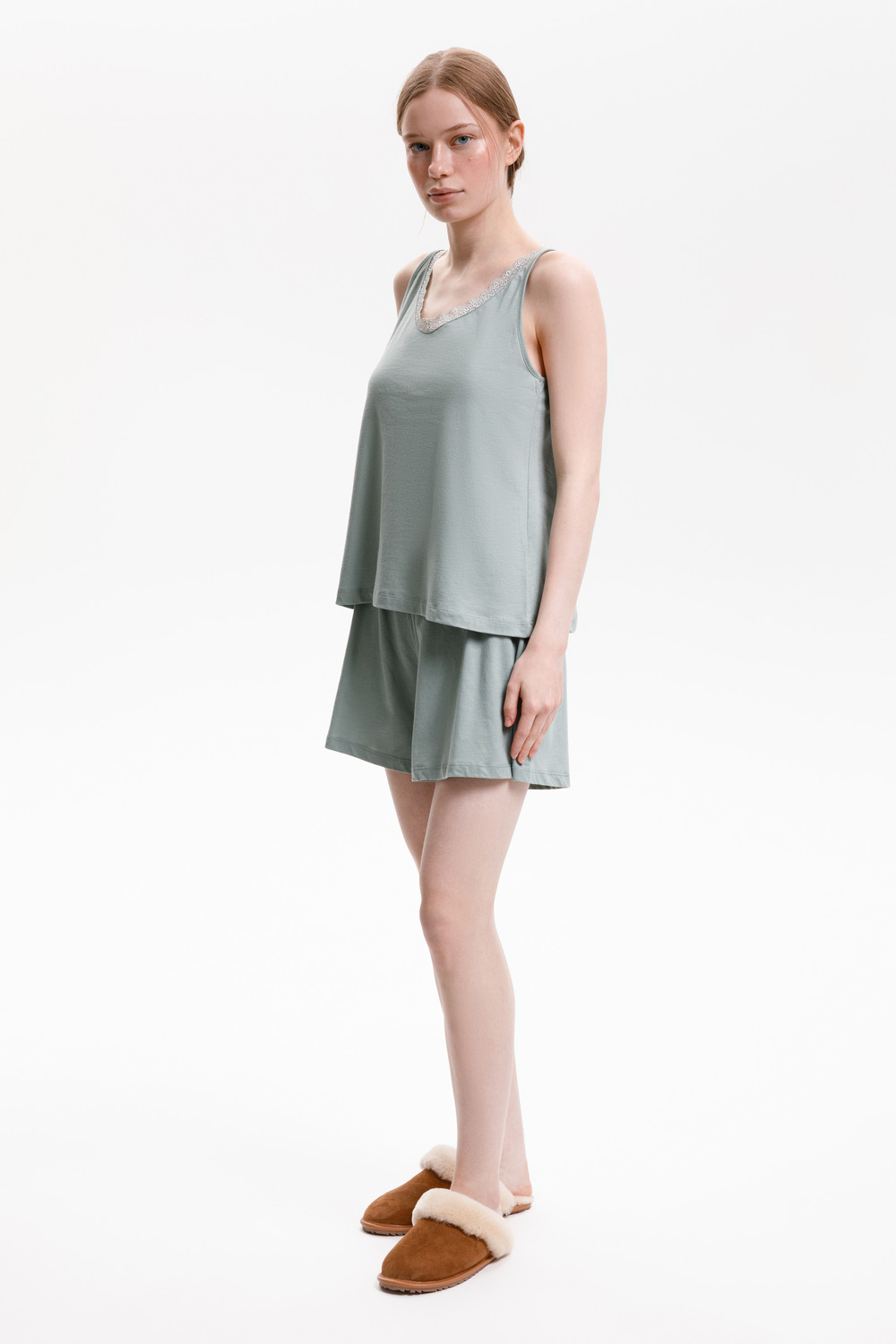 Легкий комплект приглушенного зеленого оттенка выполнен из хлопка с нежнейшим модалом. Свободный крой топа декорированный эластичным кружевом и мягкий пояс шорт обеспечивают легкость и свободу движений.