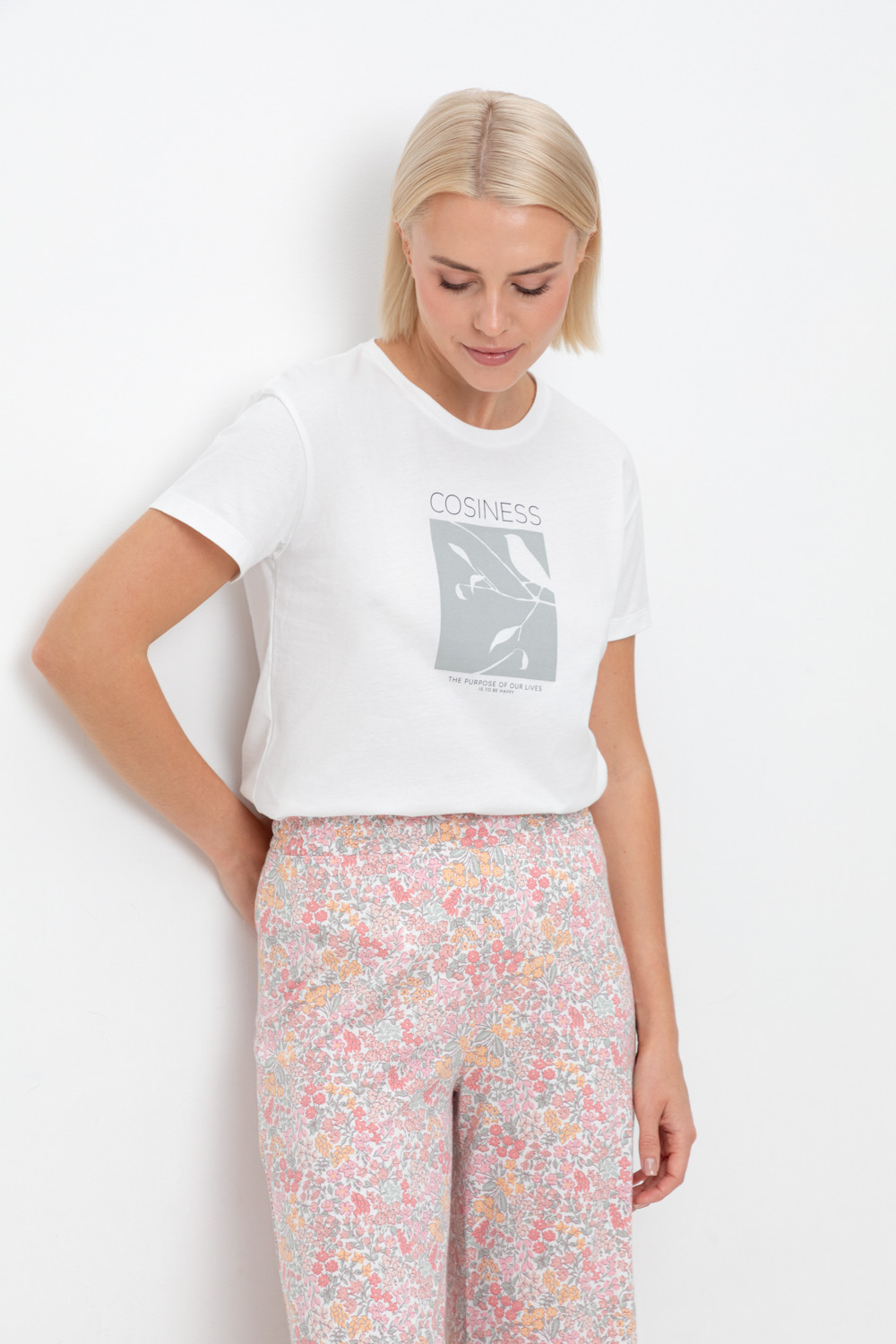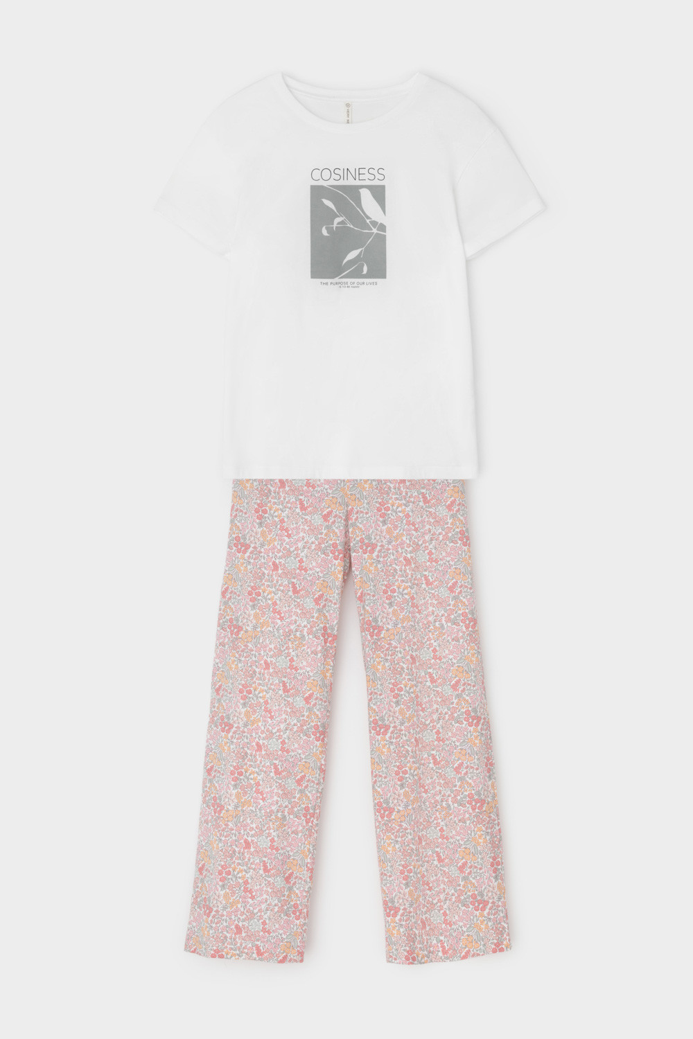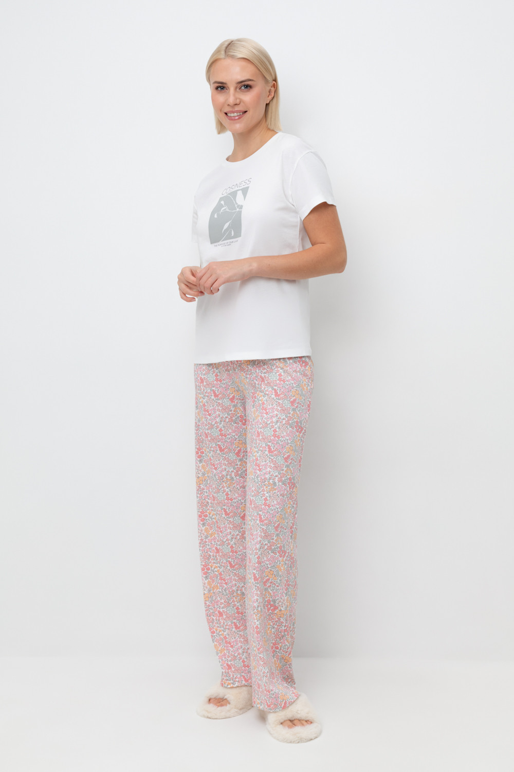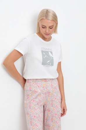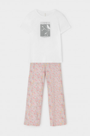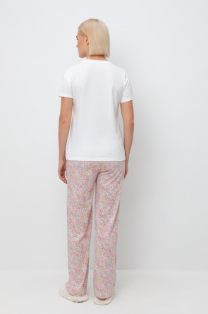Комплект из высококачественного гребенного хлопка. Свободный крой брюк дополнен широким, удобным поясом, а футболку молочного цвета украшает мягкий на ощупь принт, который выполнен на основе водных красок, что обеспечивает устойчивость к многократным стиркам.