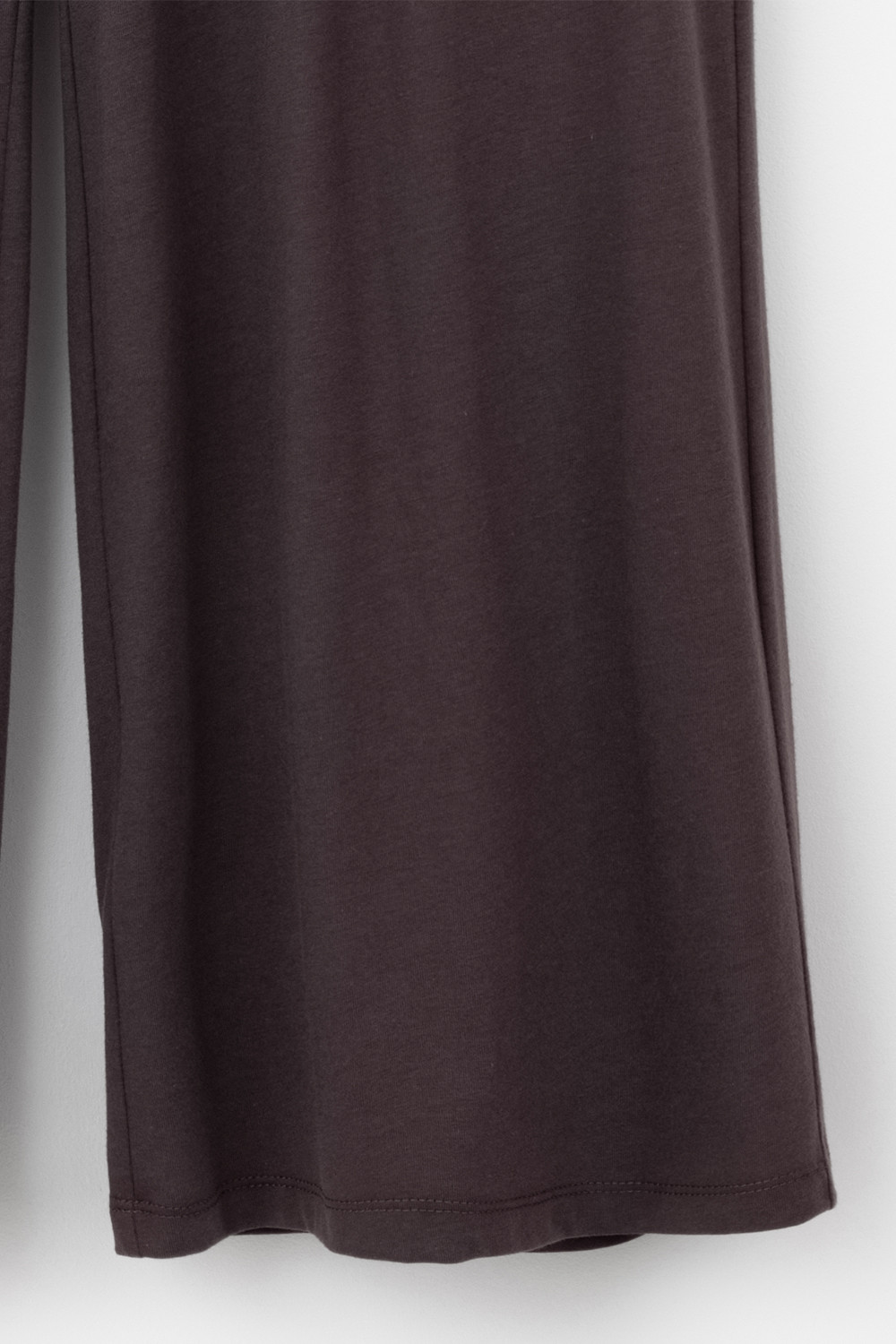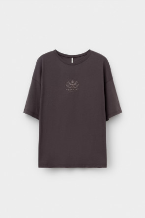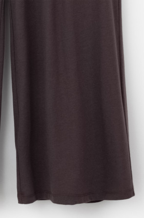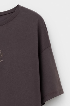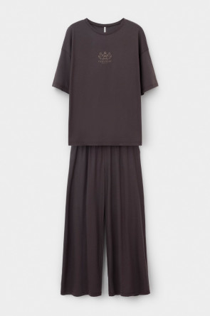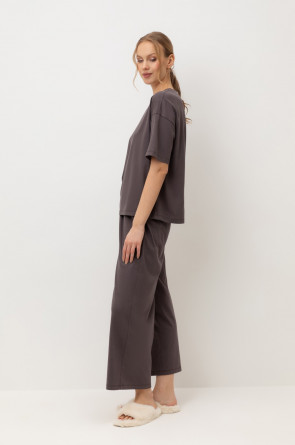 Комплект приглушенного оттенка выполнен из хлопка с нежнейшим модалом. Свободный крой футболки и мягкий пояс брюк обеспечивают легкость и свободу движений.