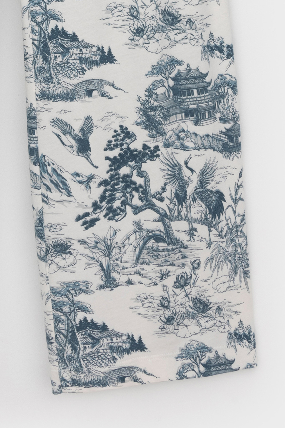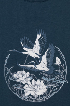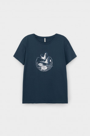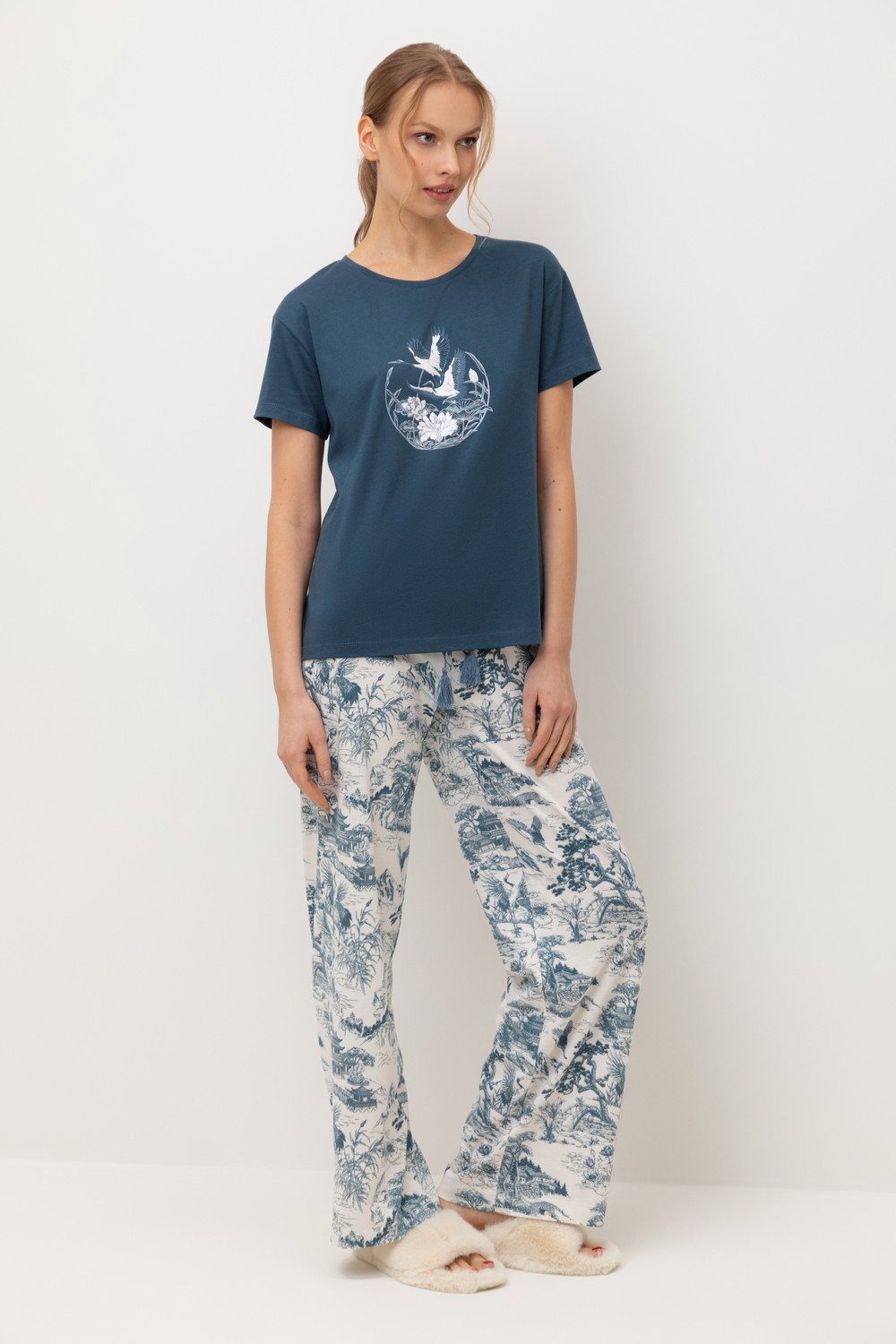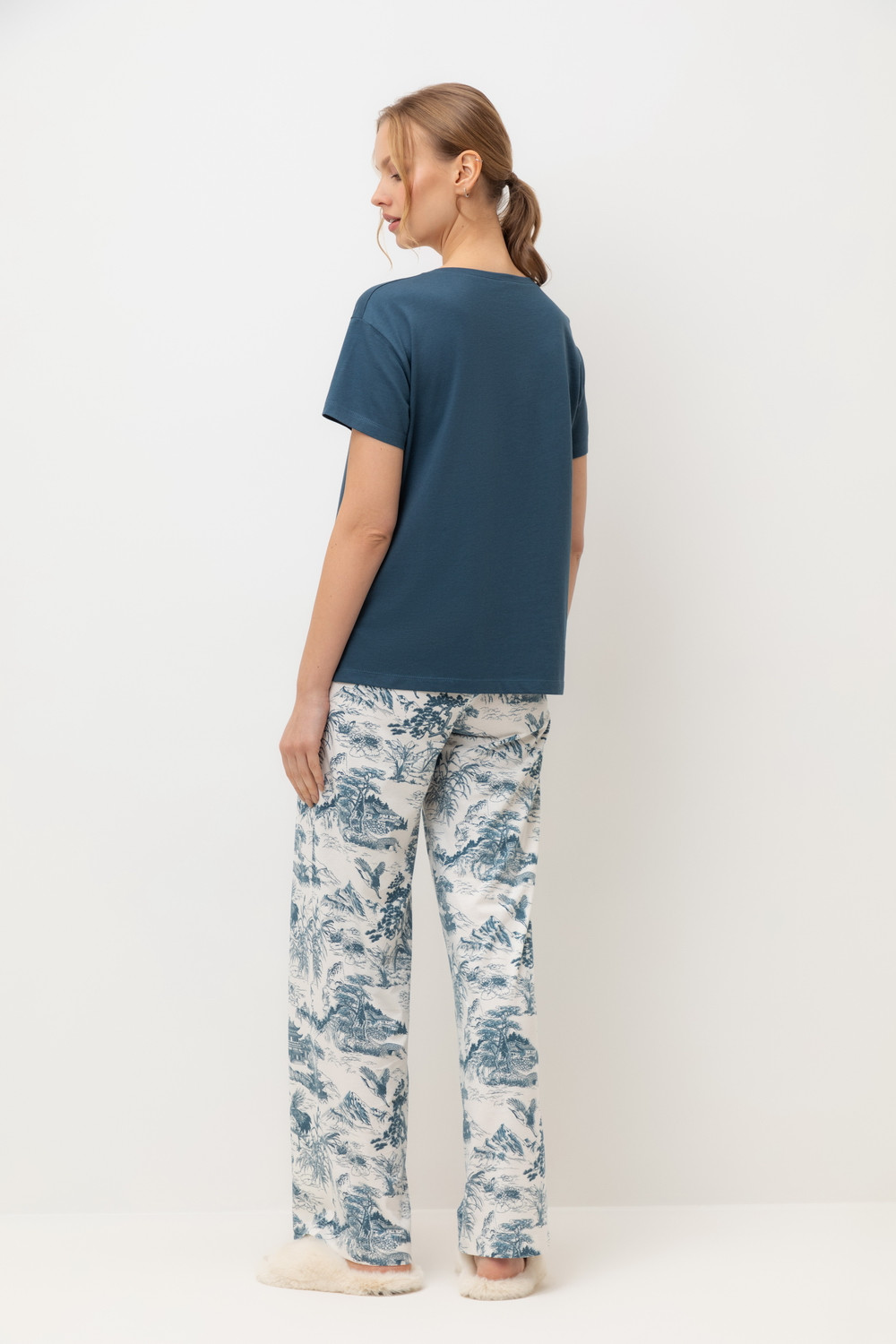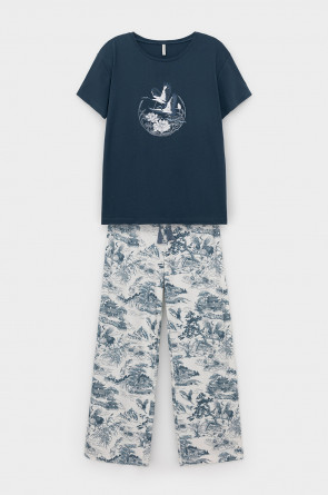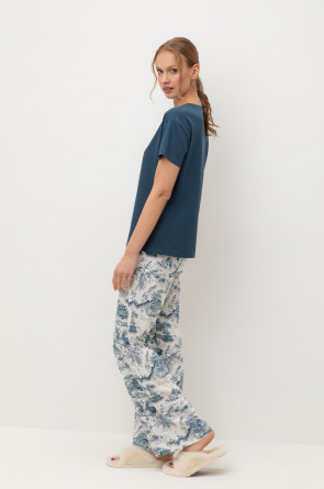 Комплект приглушенного синего оттенка выполнен из хлопка с нежнейшим модалом. Свободный крой футболки и мягкий пояс брюк обеспечивают легкость и свободу движений.