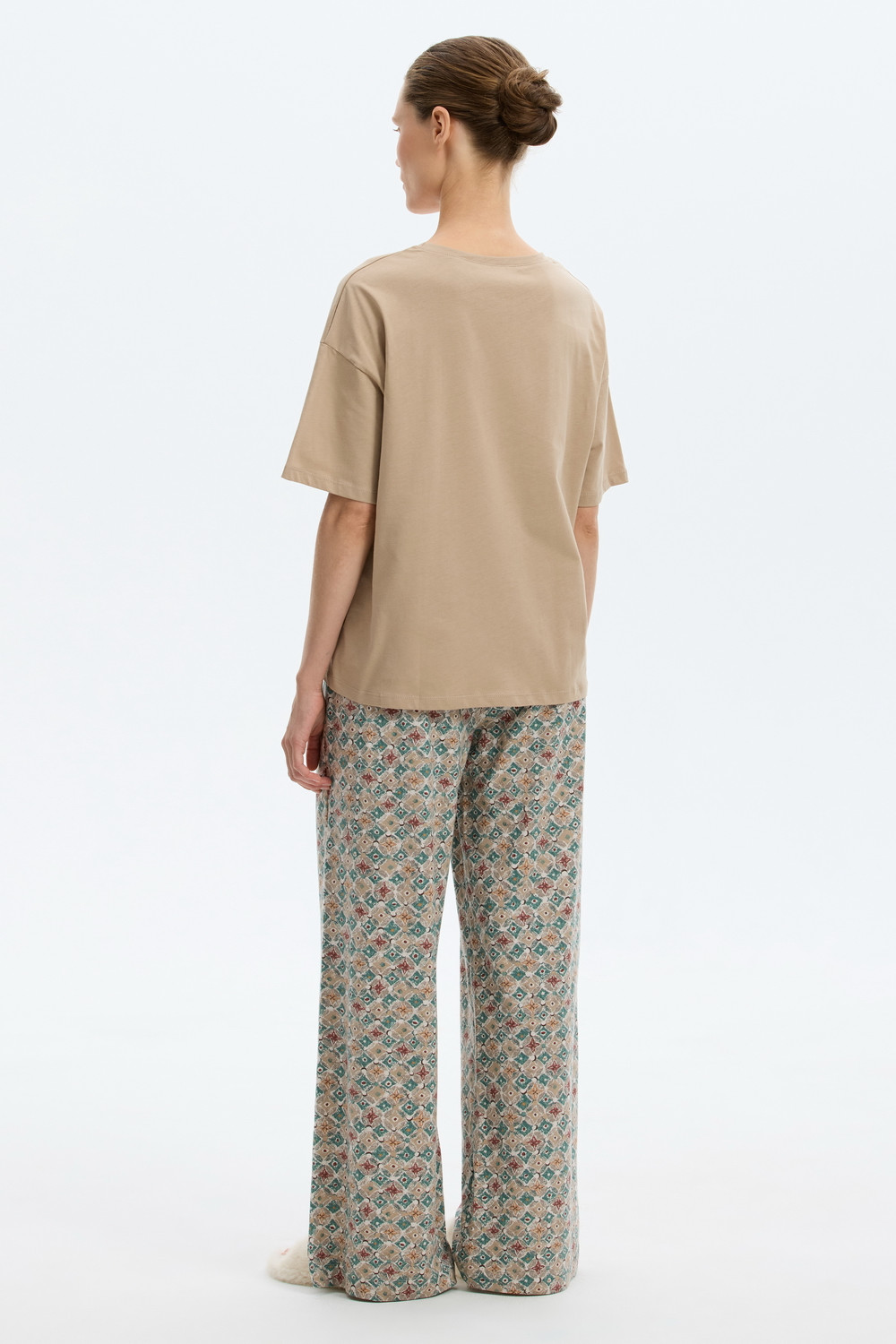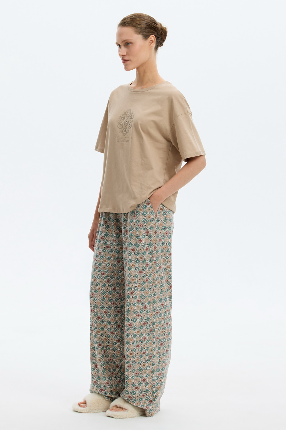 Комплект из высококачественного гребенного хлопка. Широкие брюки с удобным поясом на резинке и практичными карманами добавляют практичности и удобства.