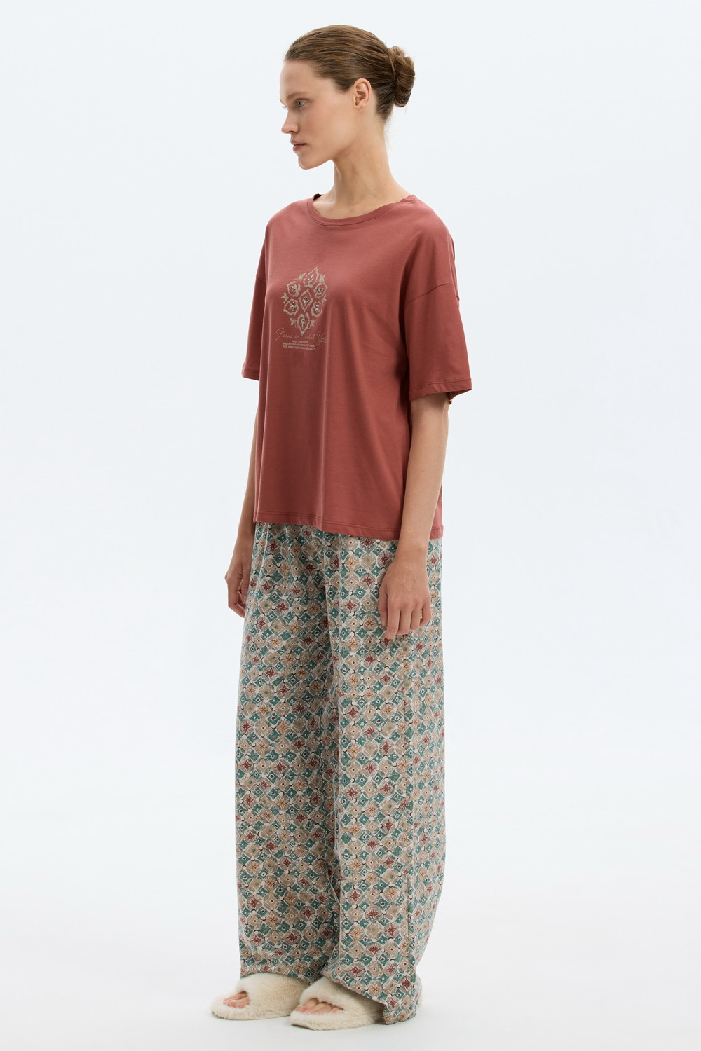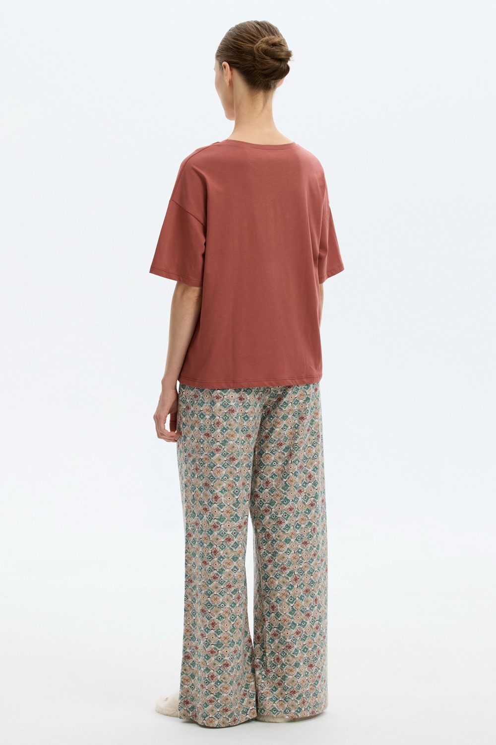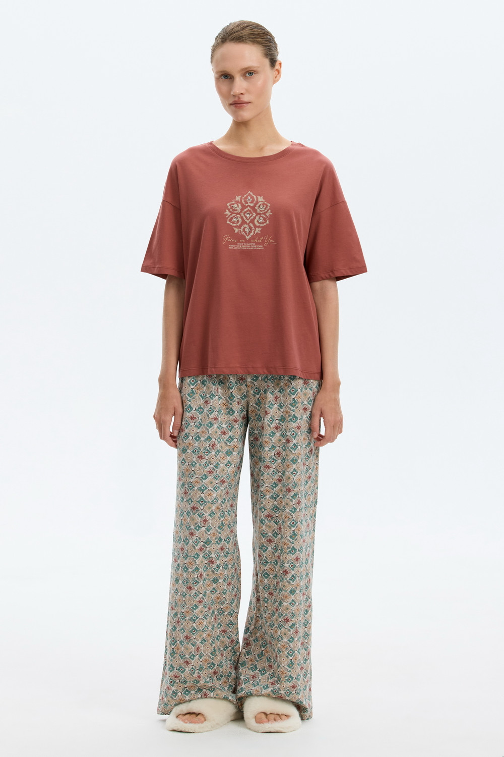 Комплект из высококачественного гребенного хлопка. Широкие брюки с удобным поясом на резинке и практичными карманами добавляют практичности и удобства.