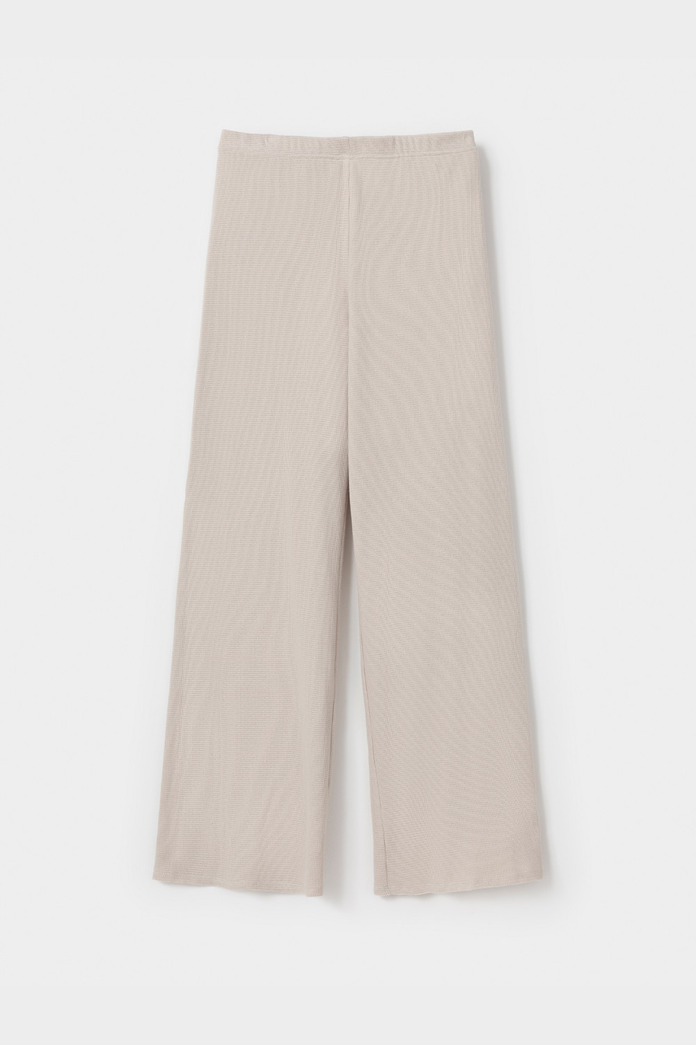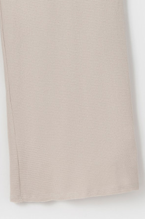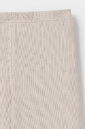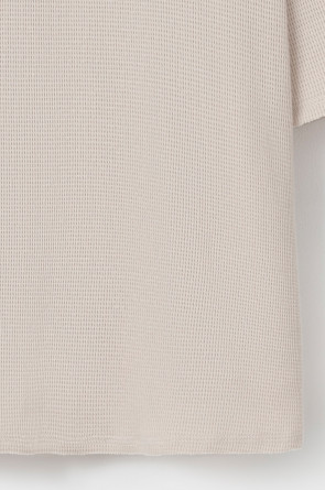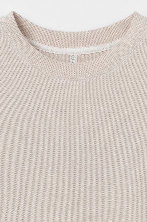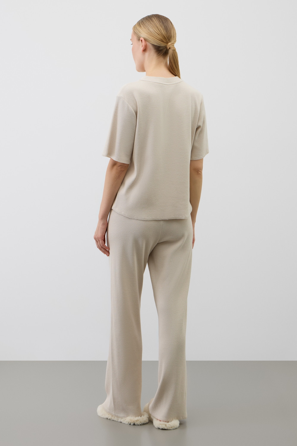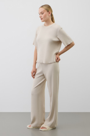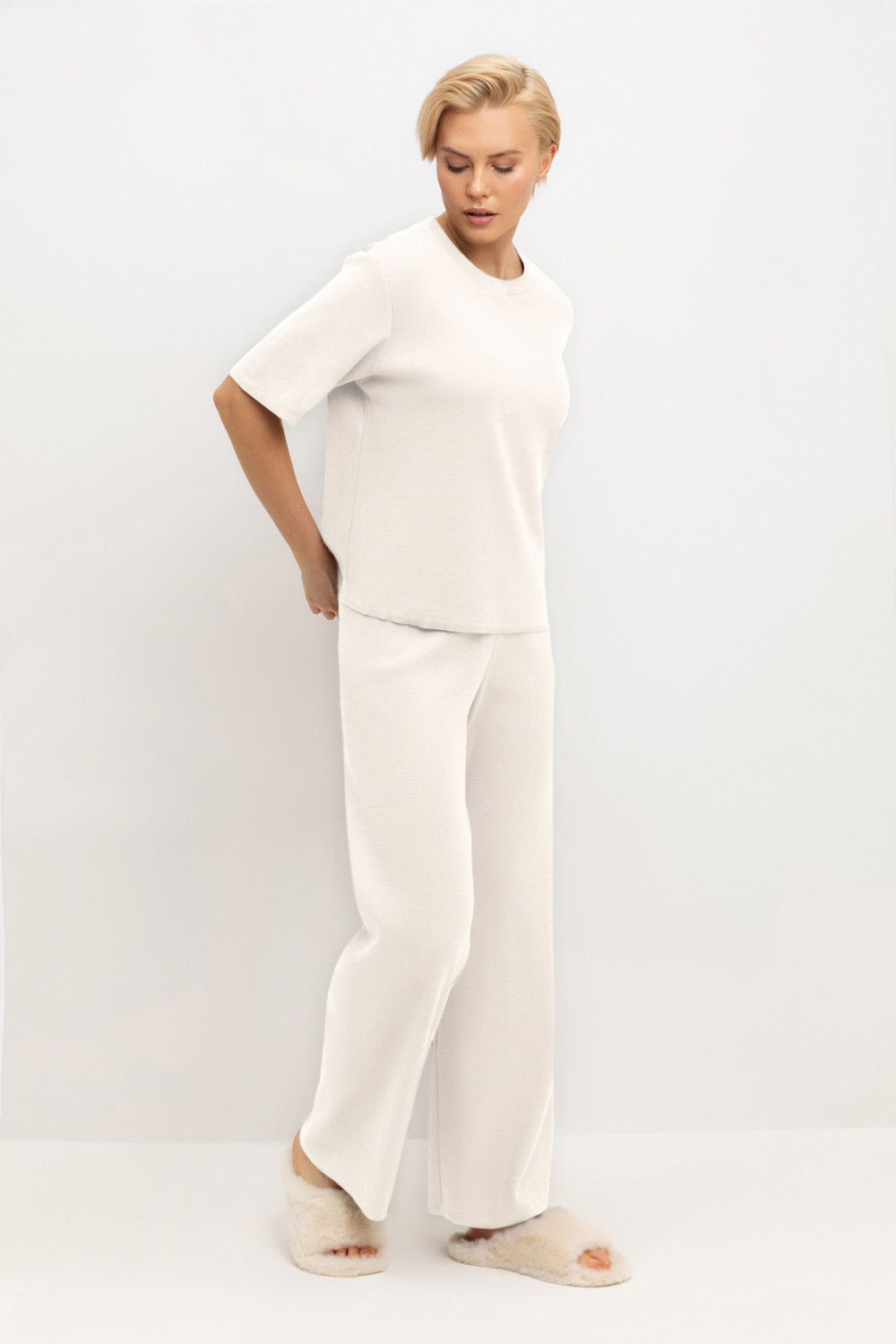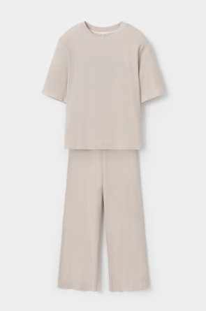 Комплект из объемного трикотажа с добавлением эластичных волокон. Свободный силуэт и мягкий пояс брюк обеспечат комфорт во время сна и отдыха.