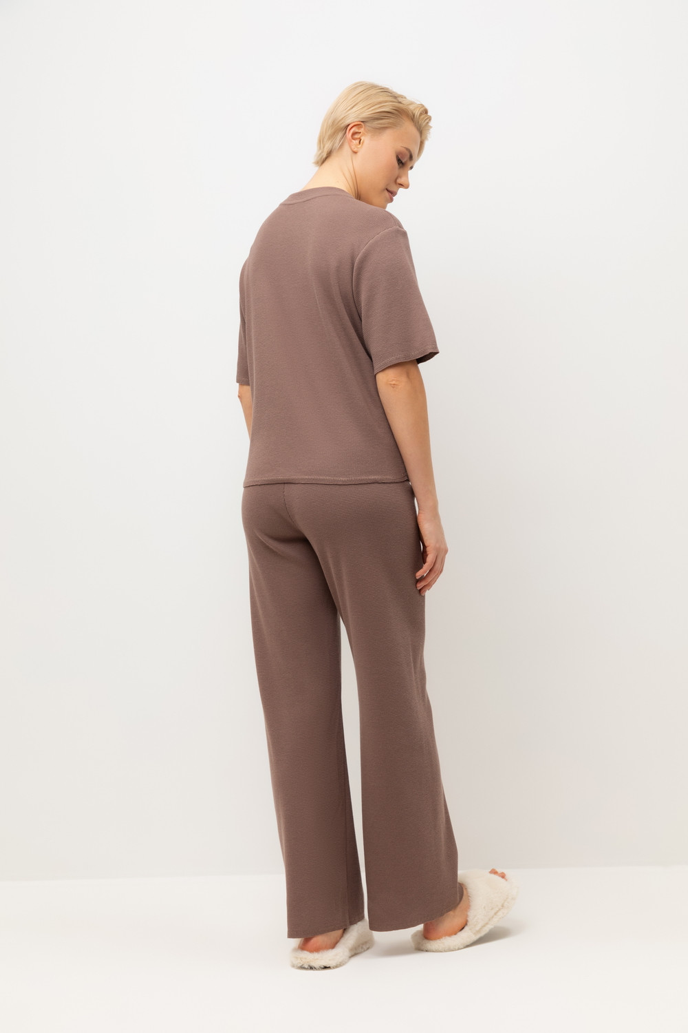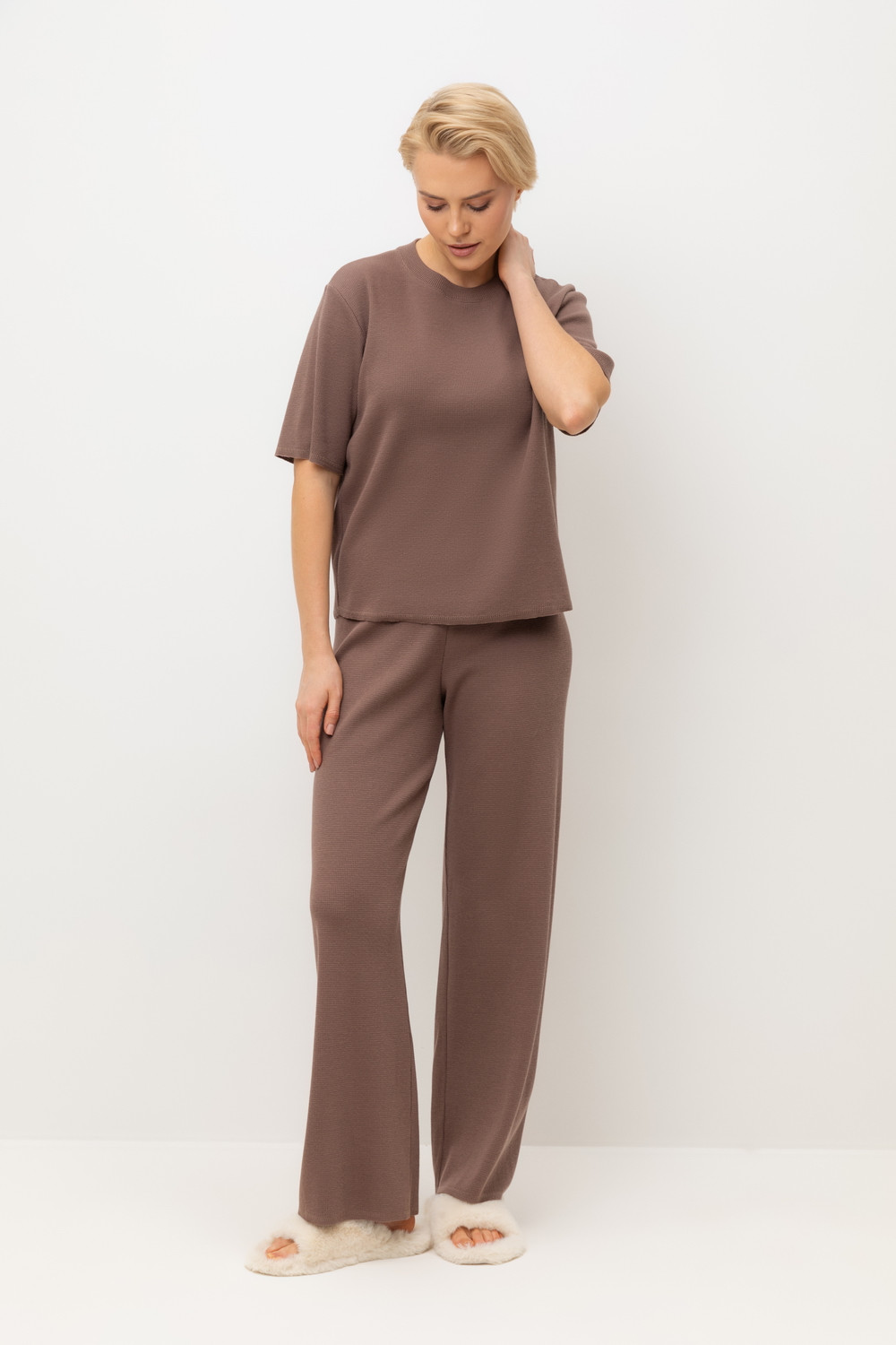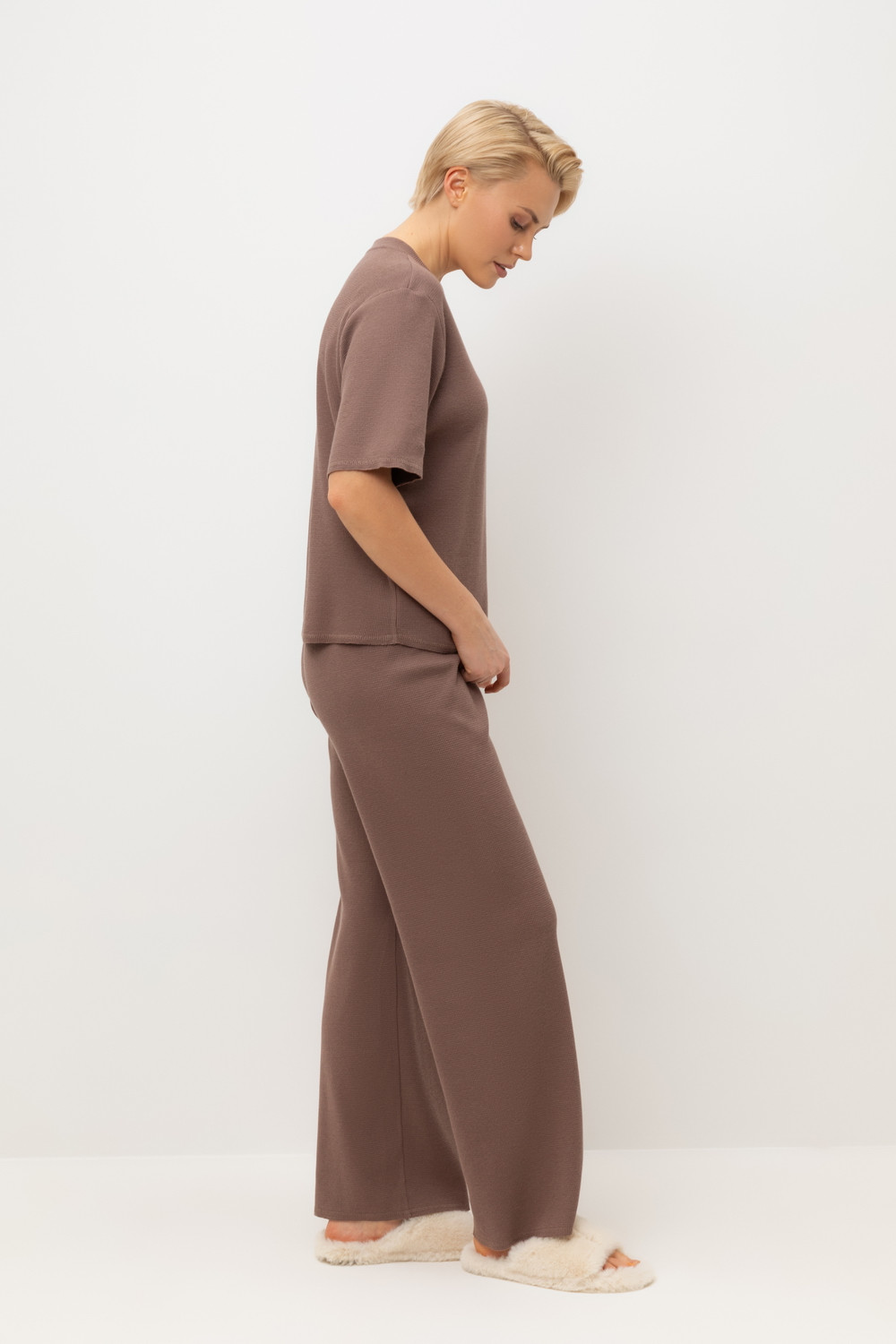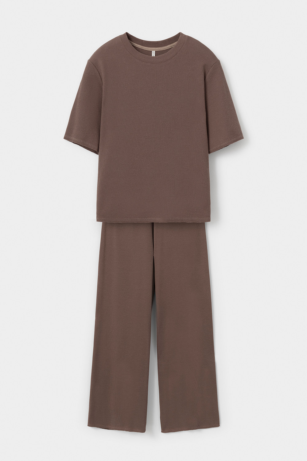 Комплект из объемного трикотажа с добавлением эластичных волокон. Свободный силуэт и мягкий пояс брюк обеспечат комфорт во время сна и отдыха.