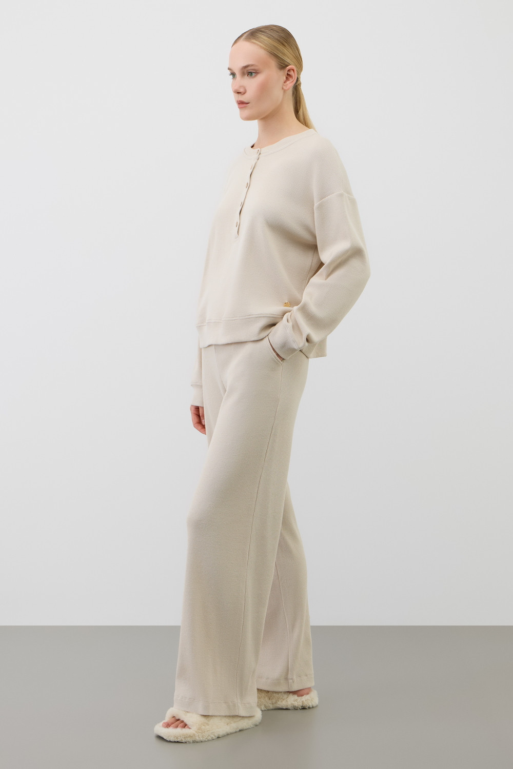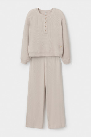 Комплект из объемного трикотажа с добавлением эластичных волокон. Свободный крой обеспечивает легкость и свободу движений.