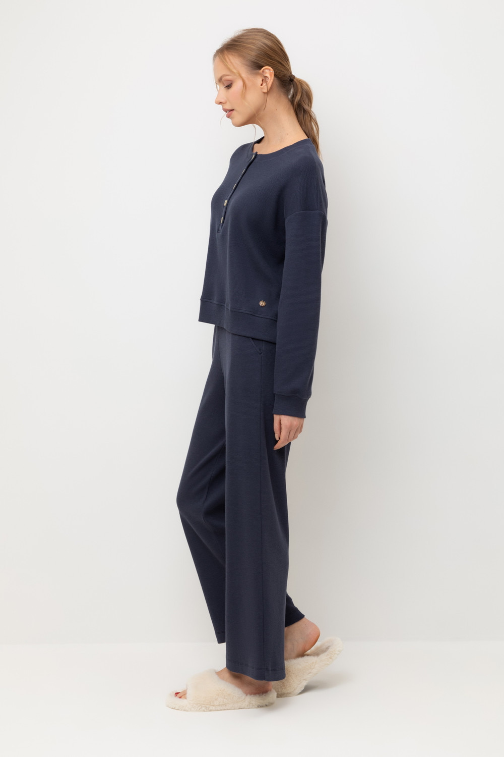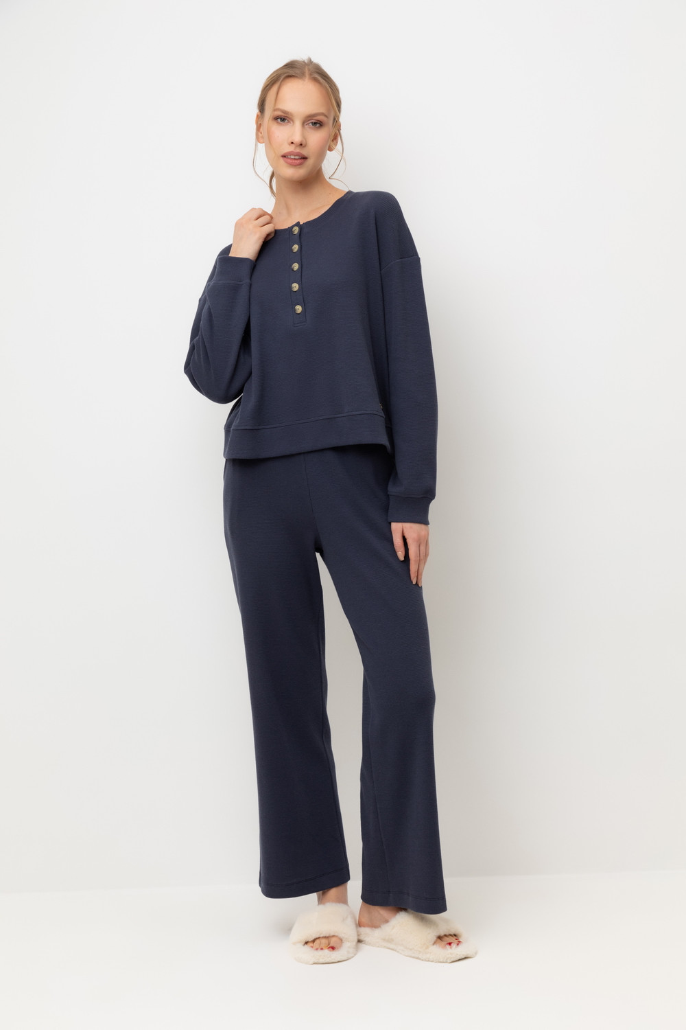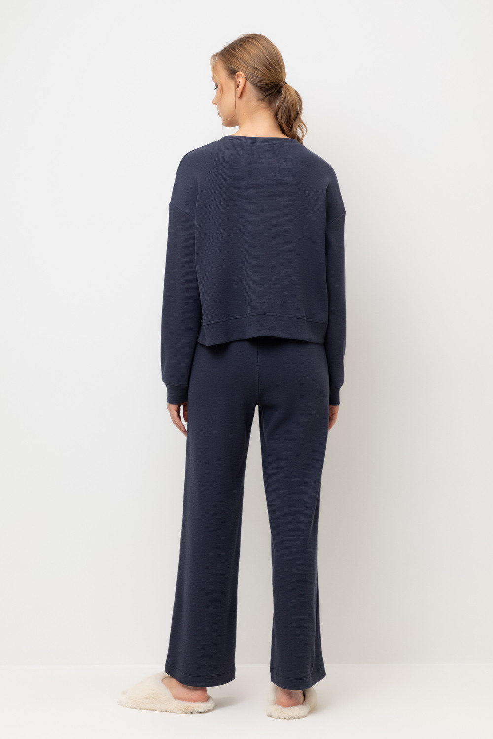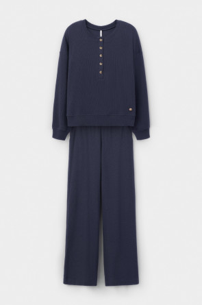 Комплект из объемного трикотажа с добавлением эластичных волокон. Свободный крой обеспечивает легкость и свободу движений.