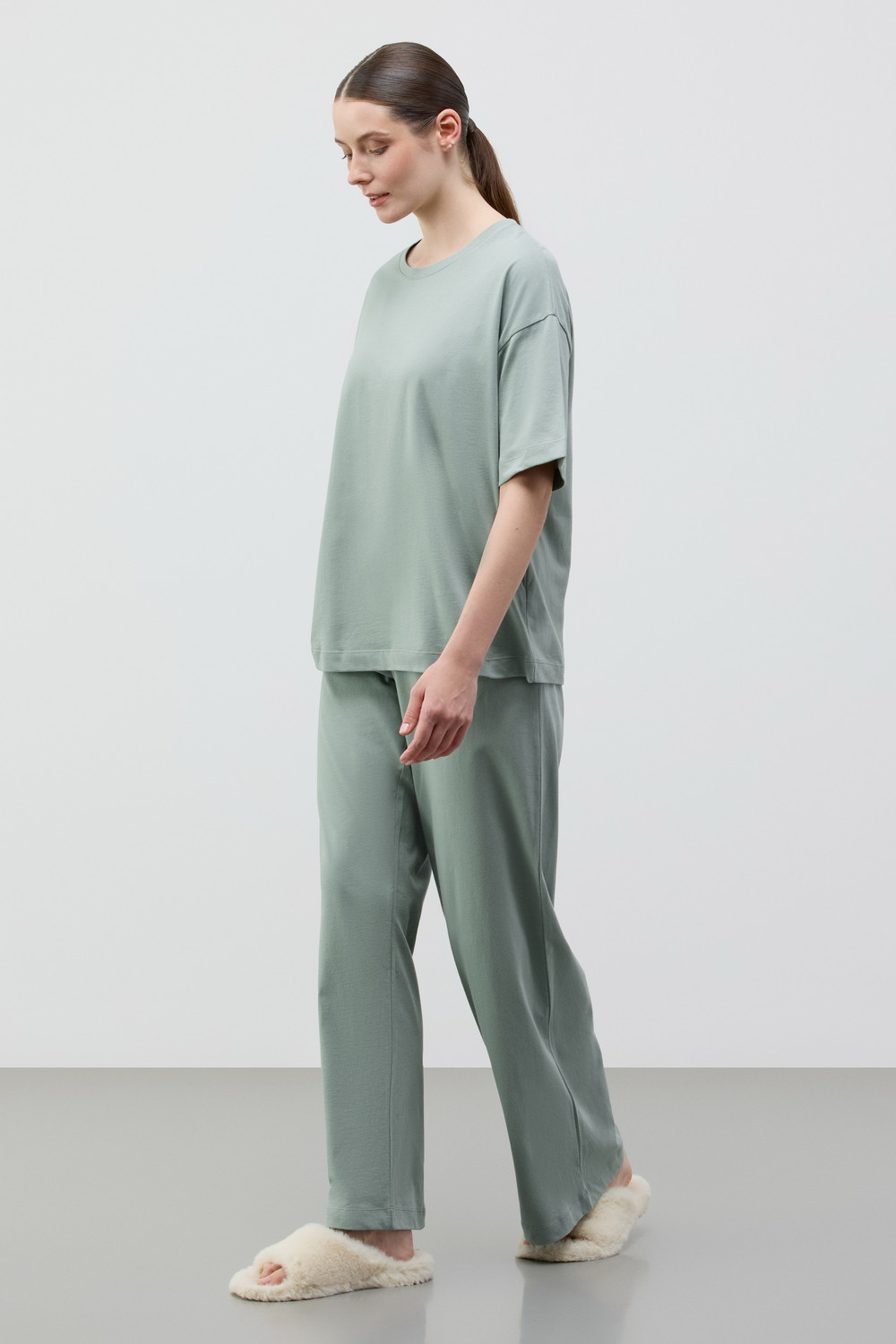 Комплект из высококачественного гребенного хлопка. Широкие брюки с удобным поясом на резинке и практичными карманами добавляют практичности и удобства.