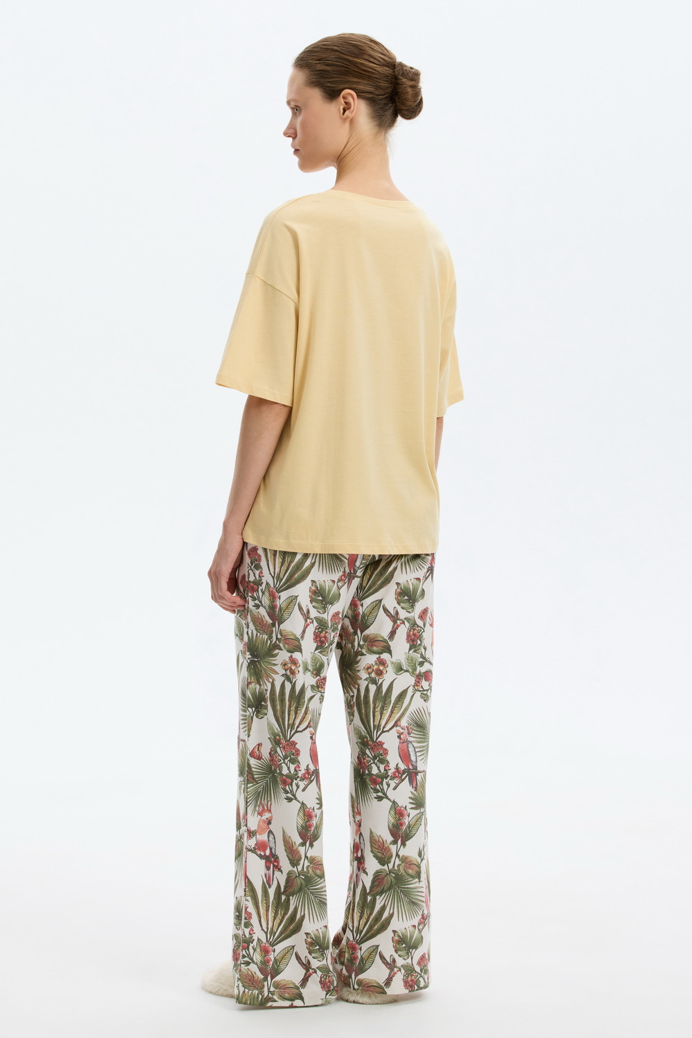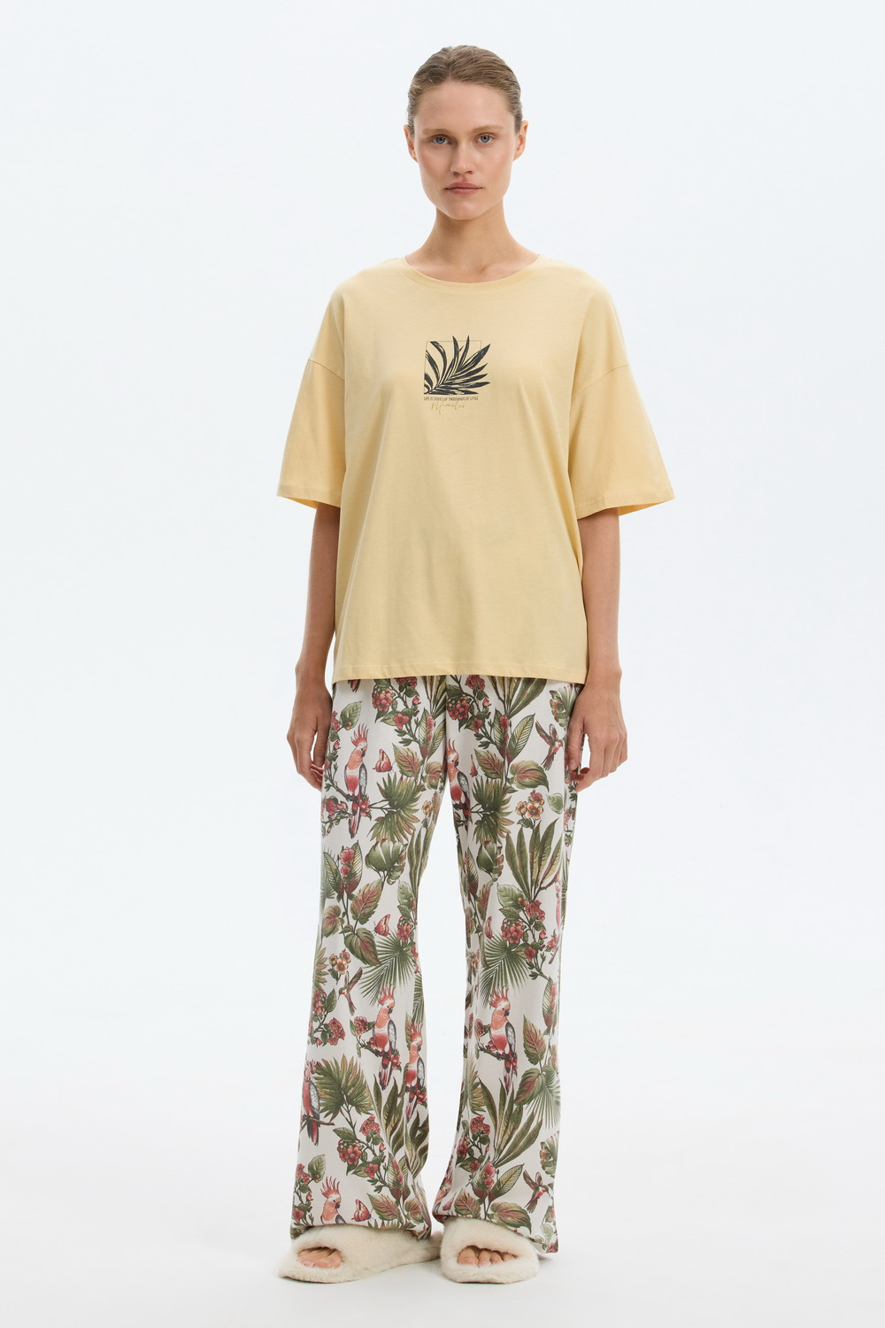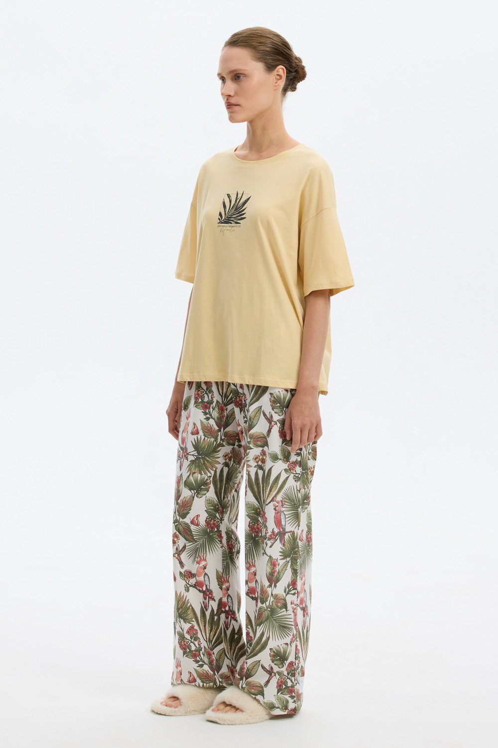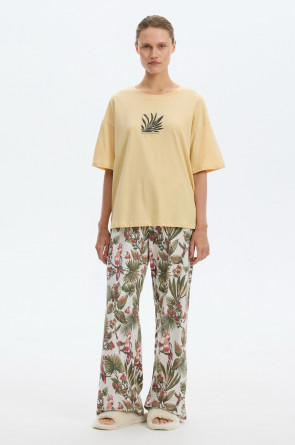 Комплект из высококачественного гребенного хлопка. Широкие брюки с удобным поясом на резинке и практичными карманами добавляют практичности и удобства.