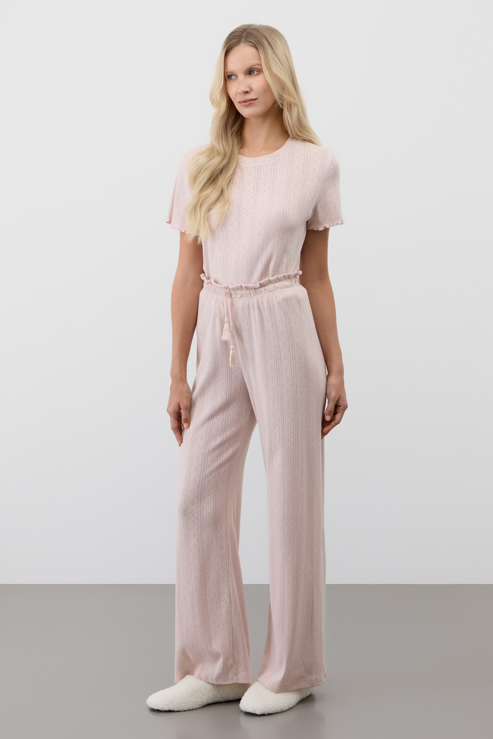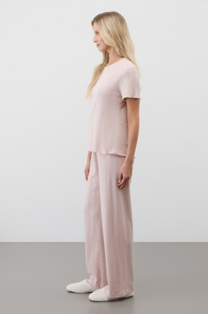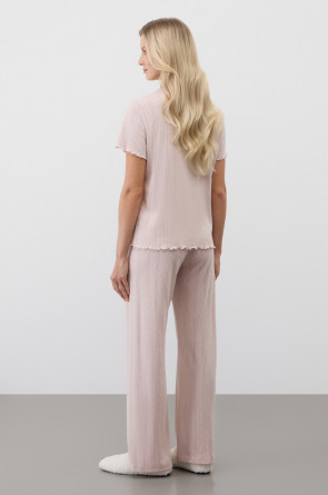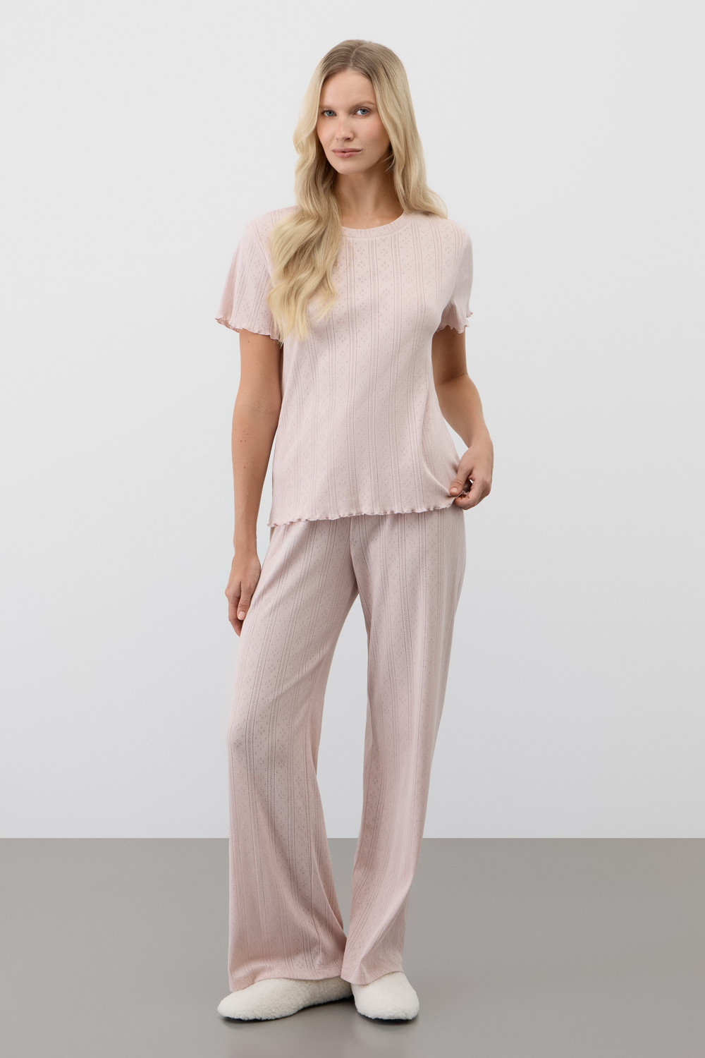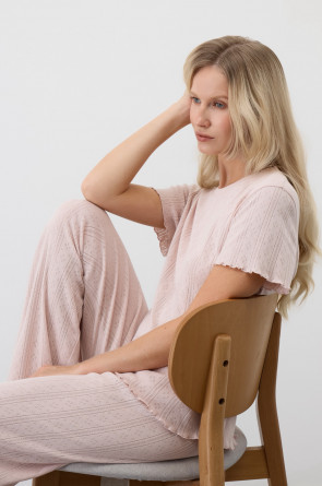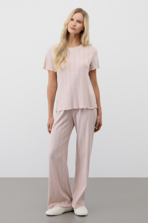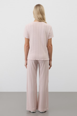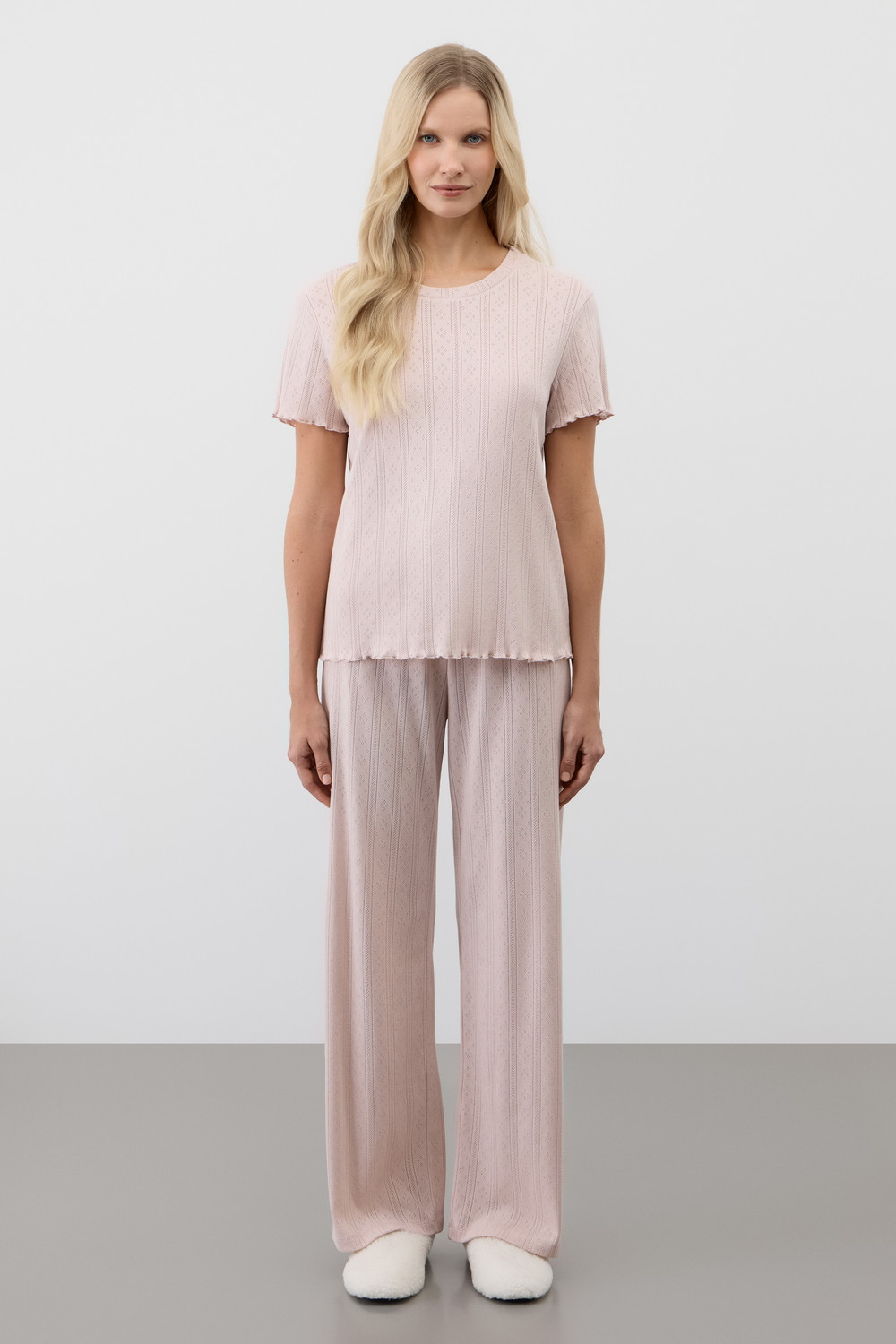 Комплект из высококачественного ажурного хлопка. Брюки выполнены без боковых швов для максимального комфорта. Края футболки обработаны мягким волнистым швом