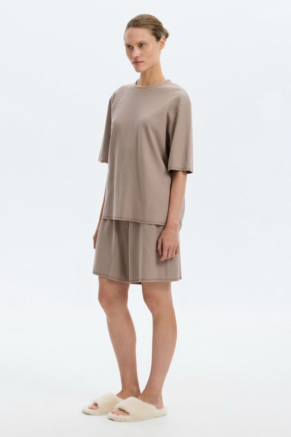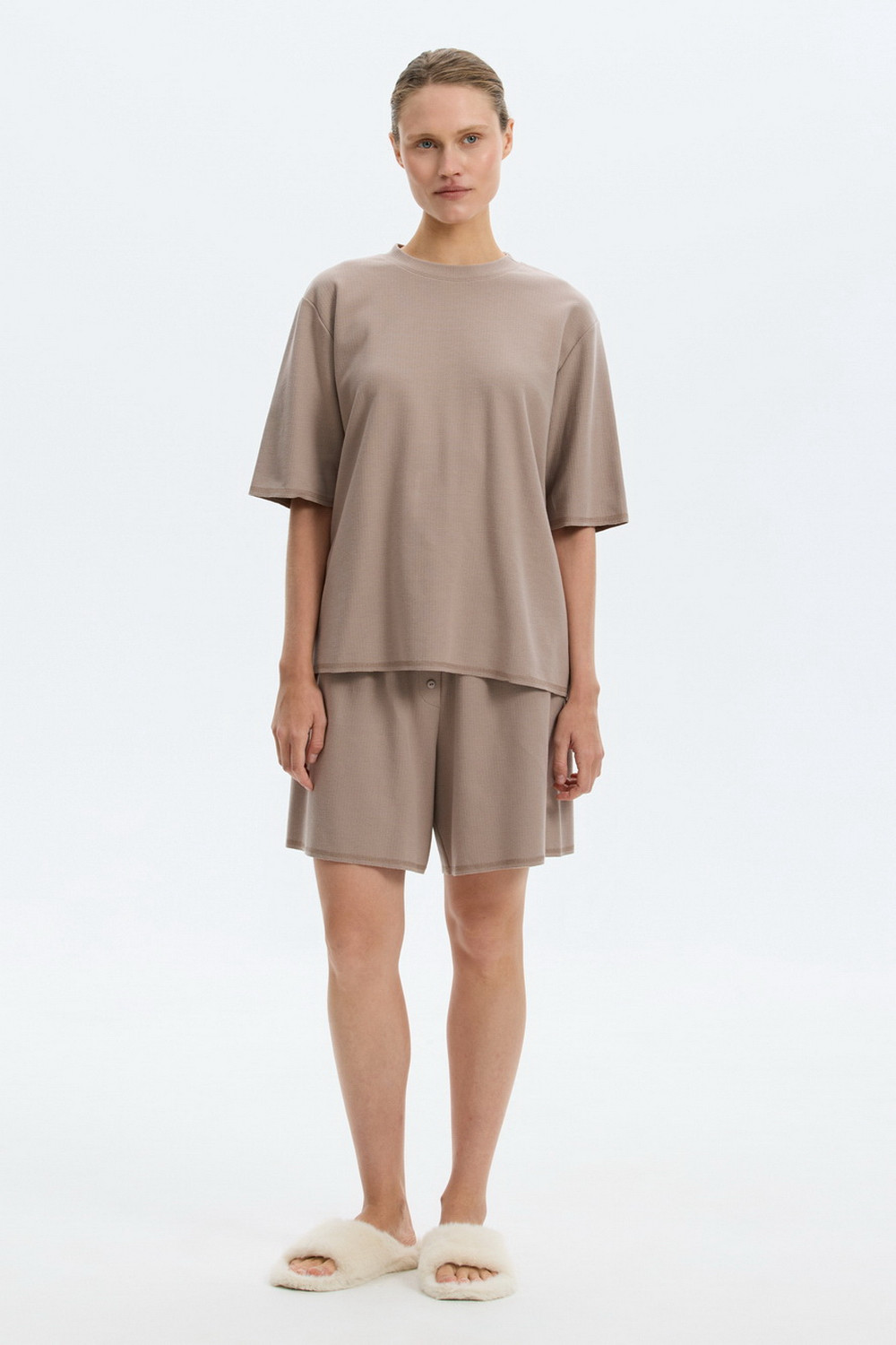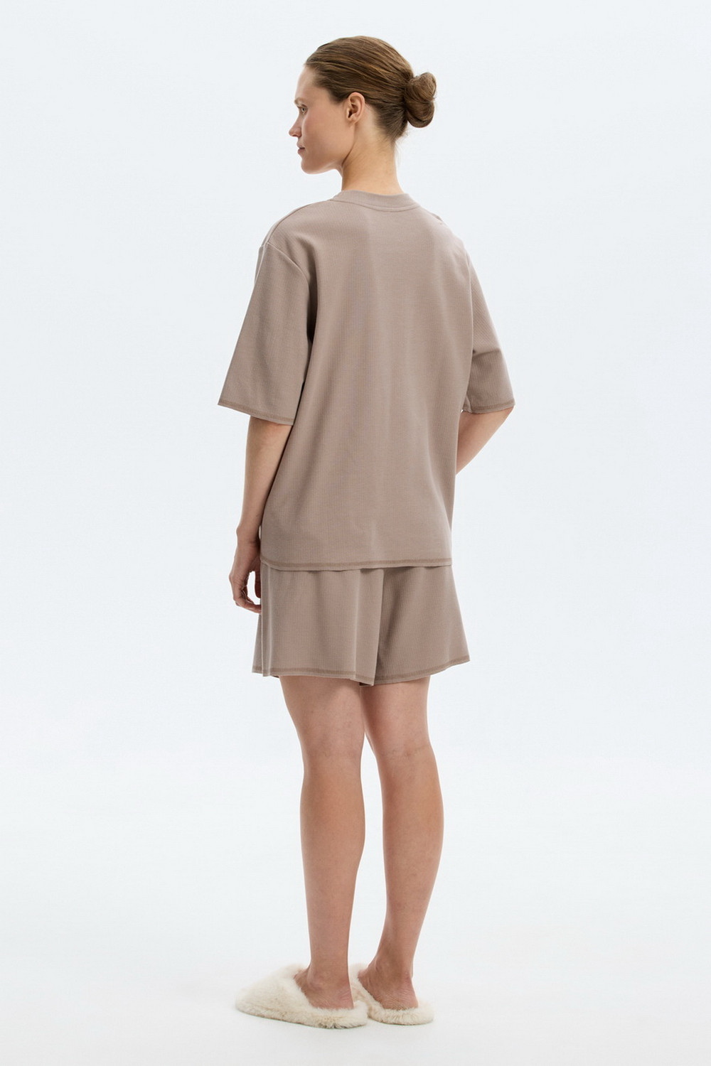 Комплект из вафельного 100% хлопка. Брюки без боковых швов и удобная посадка обеспечат комфорт во время сна и отдыха.