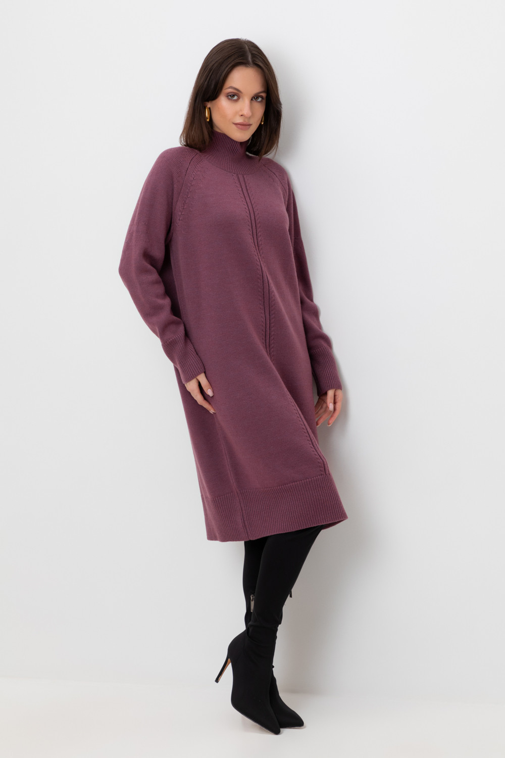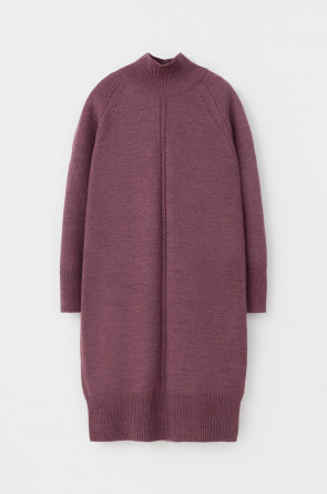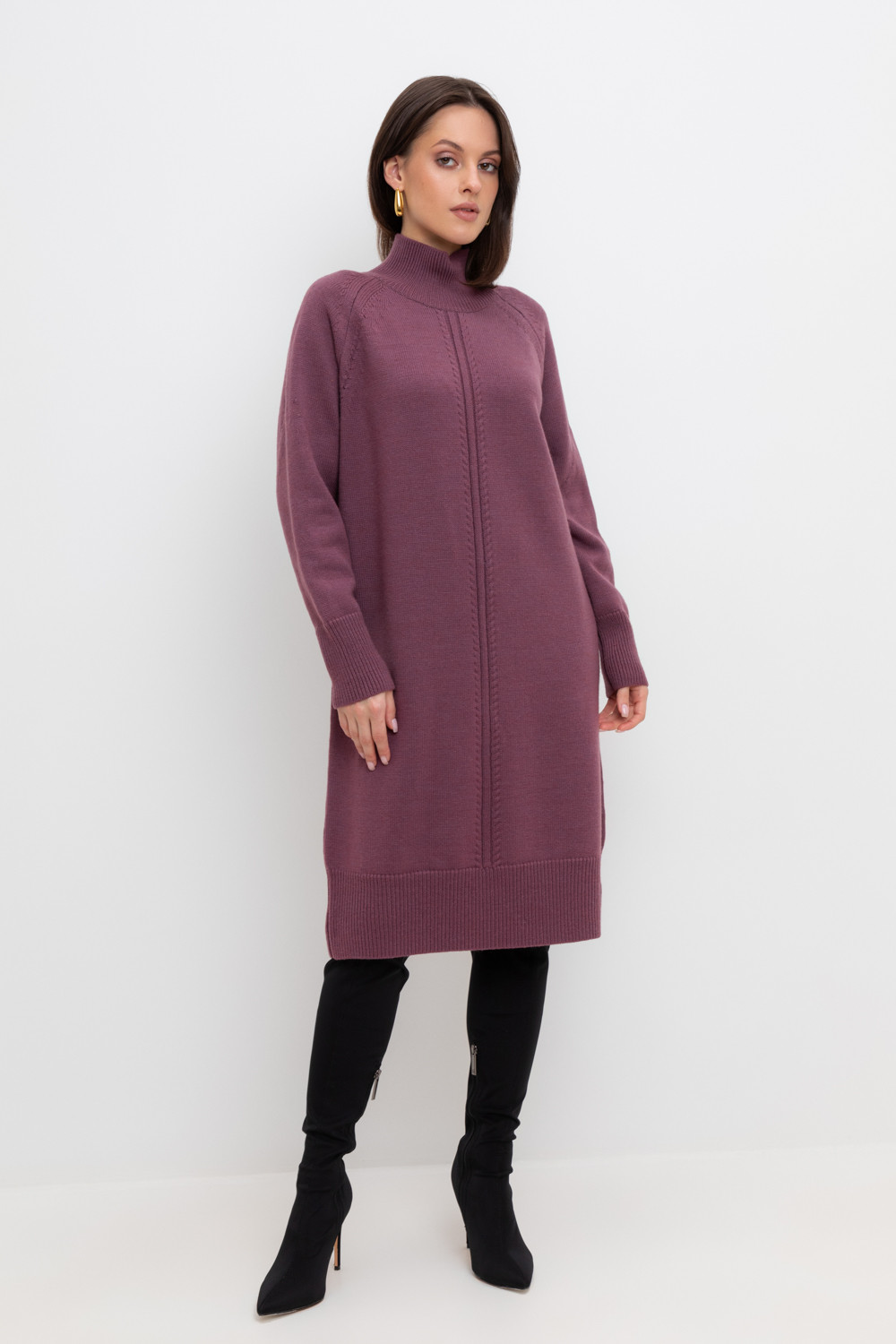 Вязаное платье длины миди с длинными рукавами с рукавами реглан из полушерсти. Выполнено гладью. Прямой силуэт хорошо садится по фигуре. Манжеты и низ изделия вывязаны широкой резинкой, благодаря которой края не растягиваются.