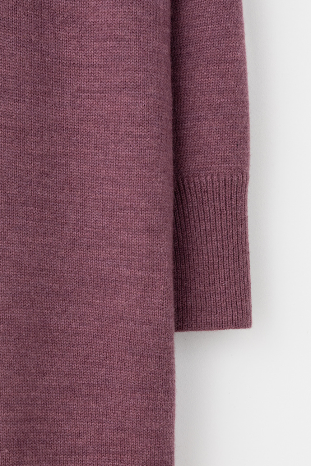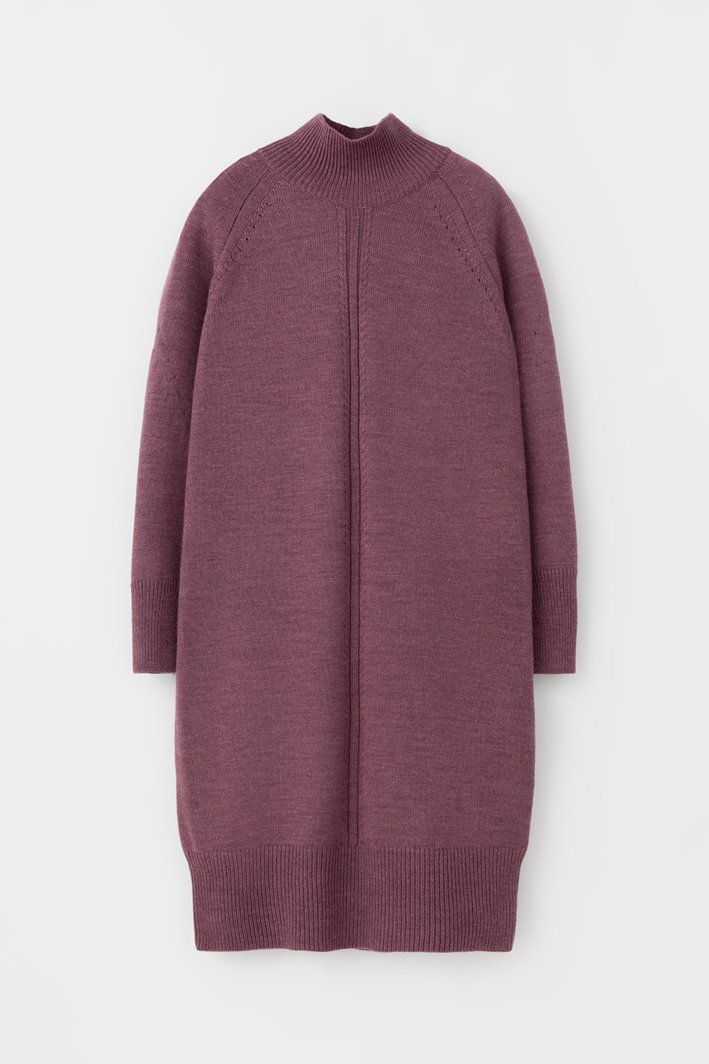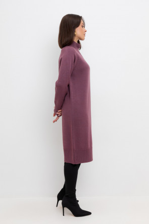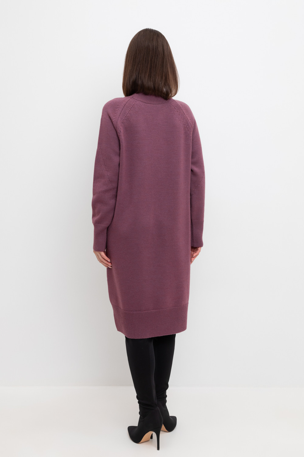 Вязаное платье длины миди с длинными рукавами с рукавами реглан из полушерсти. Выполнено гладью. Прямой силуэт хорошо садится по фигуре. Манжеты и низ изделия вывязаны широкой резинкой, благодаря которой края не растягиваются.