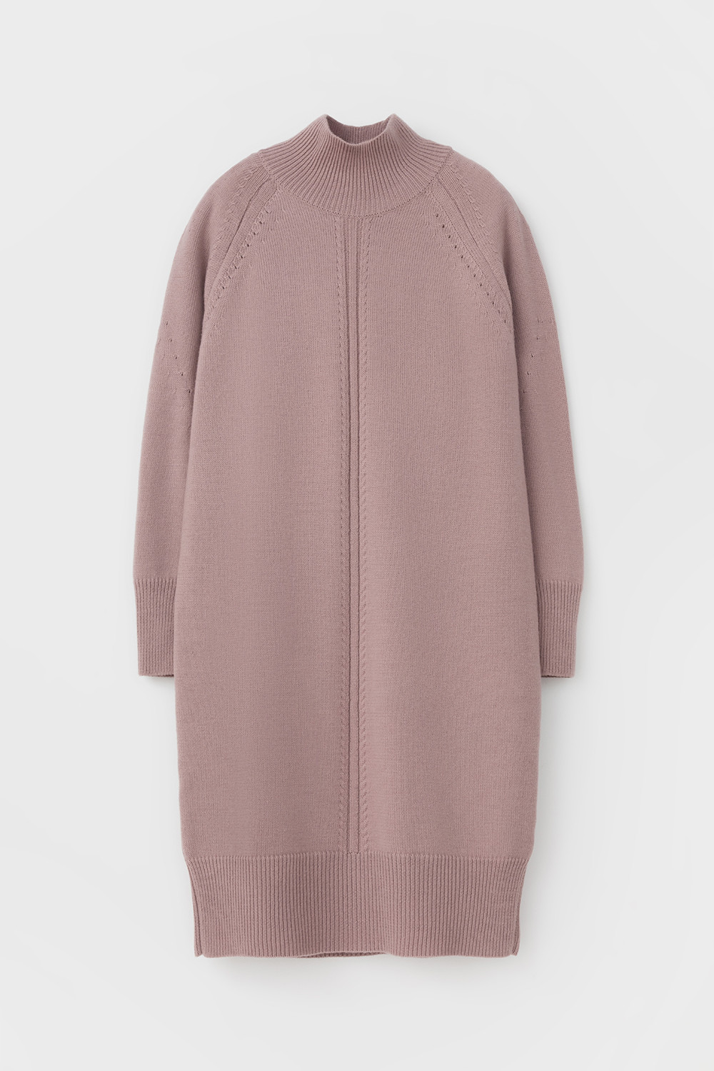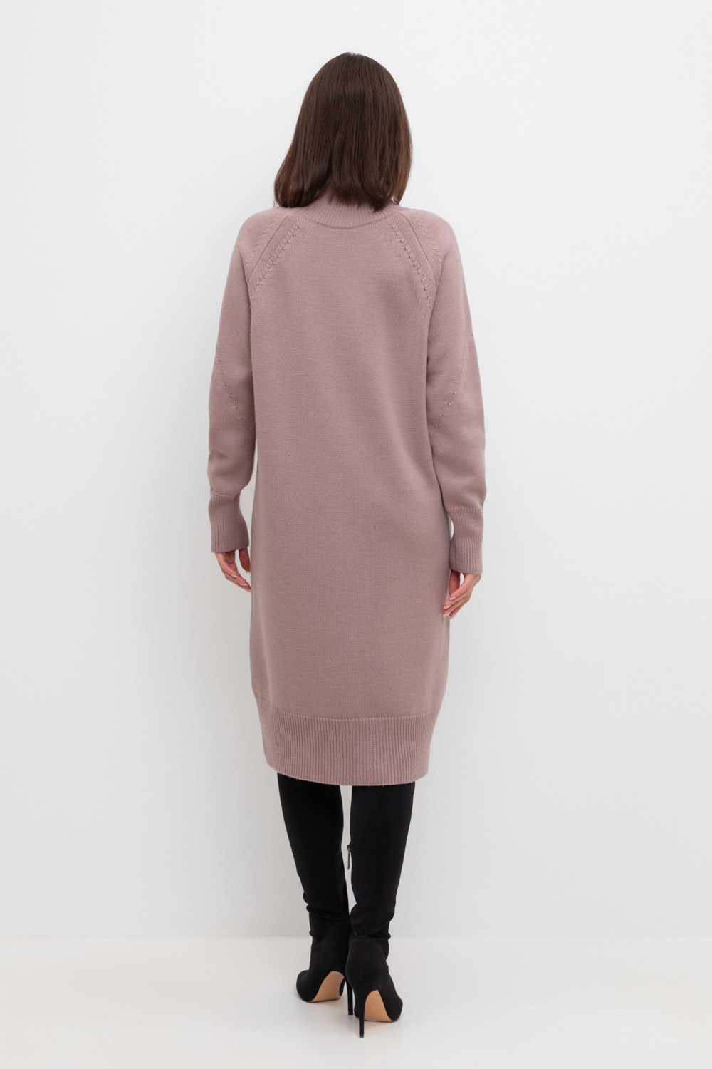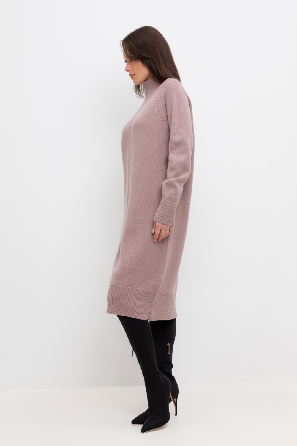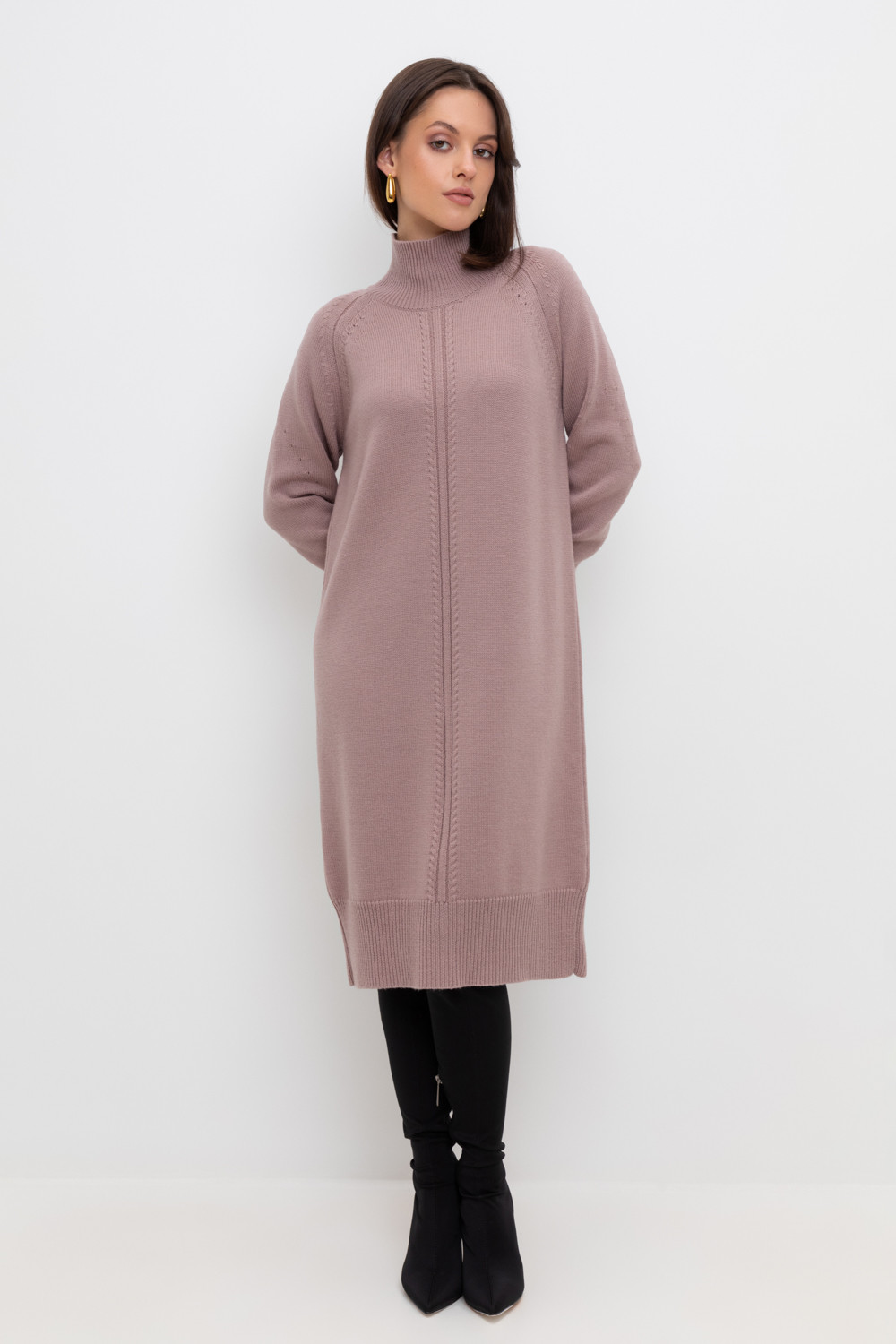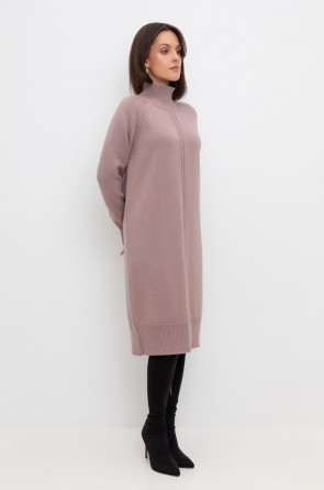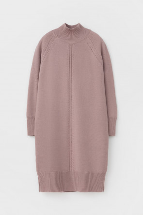 Вязаное платье длины миди с длинными рукавами с рукавами реглан из полушерсти. Выполнено гладью. Прямой силуэт хорошо садится по фигуре. Манжеты и низ изделия вывязаны широкой резинкой, благодаря которой края не растягиваются.