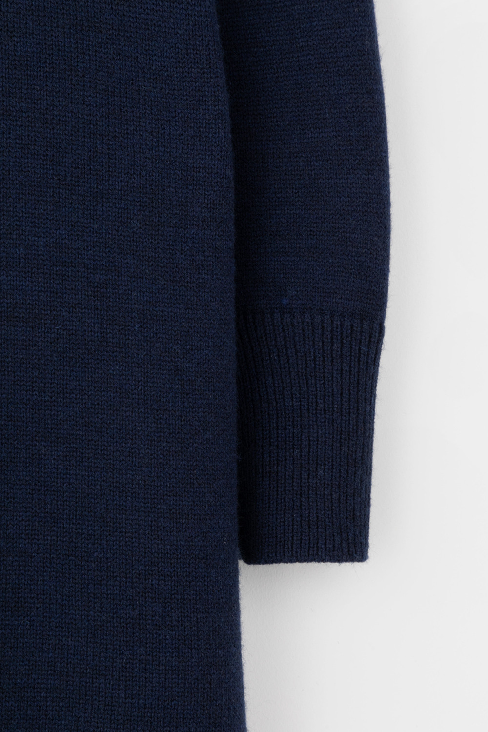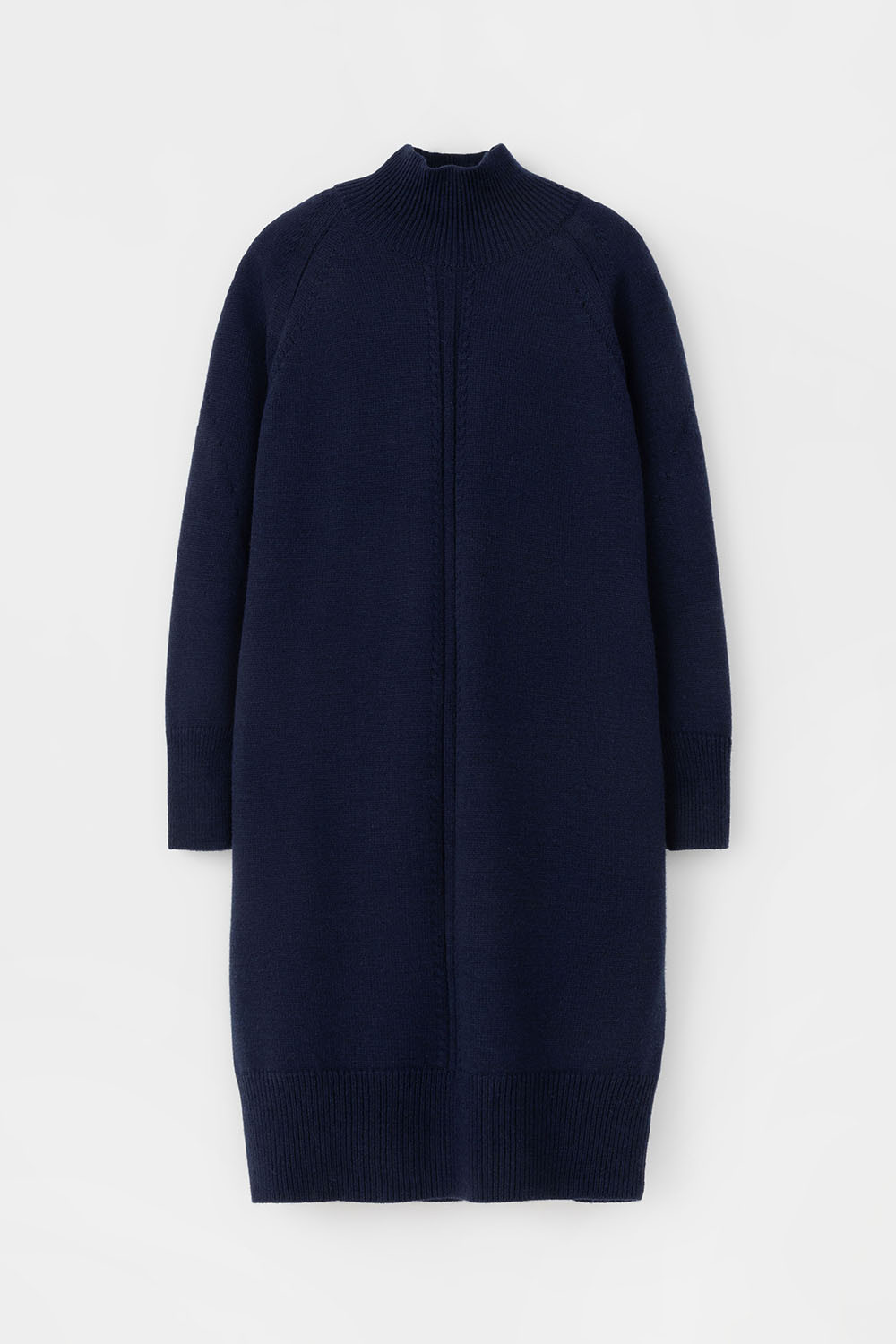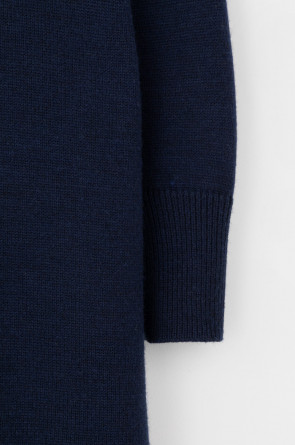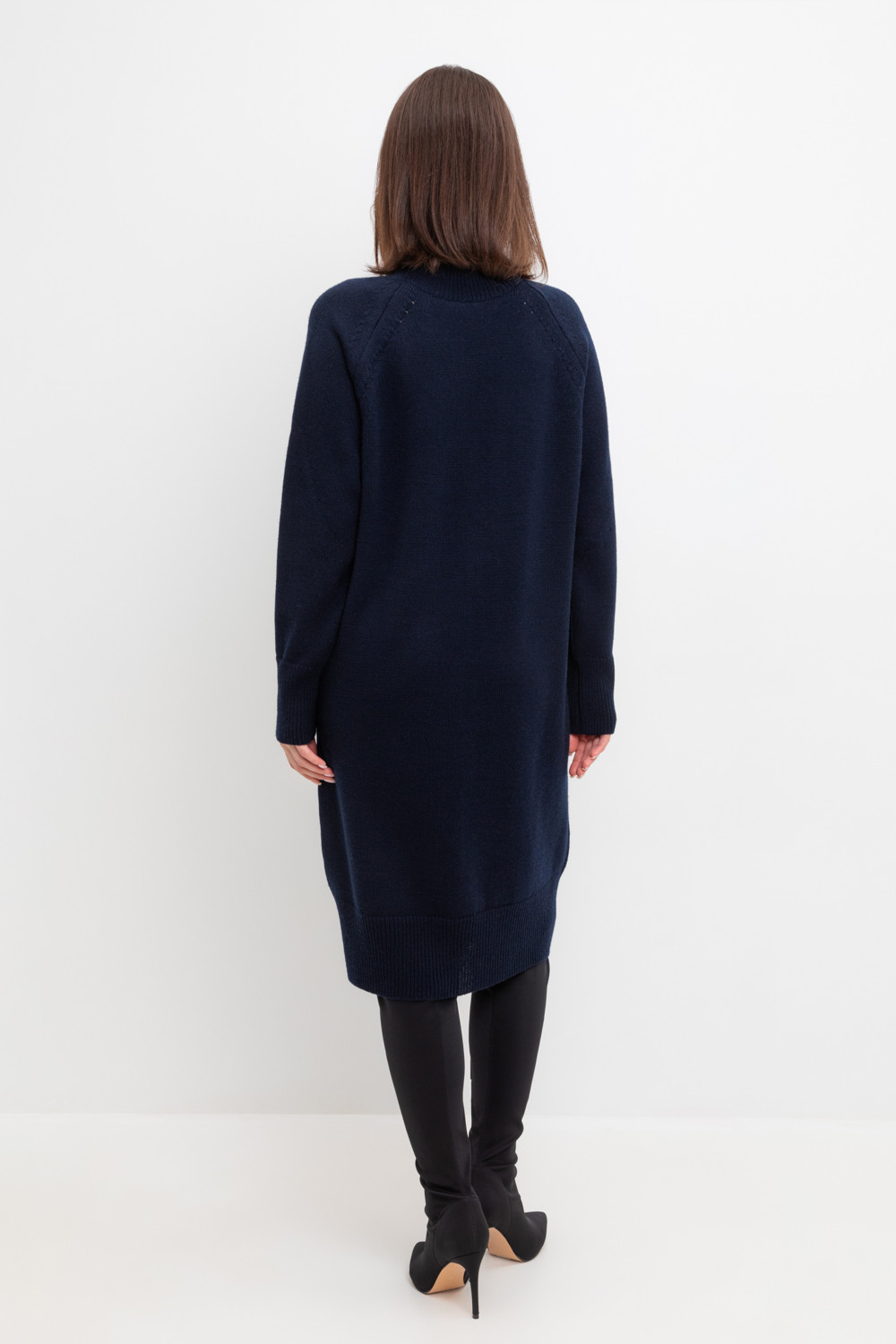 Вязаное платье длины миди с длинными рукавами реглан из полушерсти. Выполнено гладью. Прямой силуэт хорошо садится по фигуре. Манжеты и низ изделия вывязаны широкой резинкой, благодаря которой края не растягиваются.