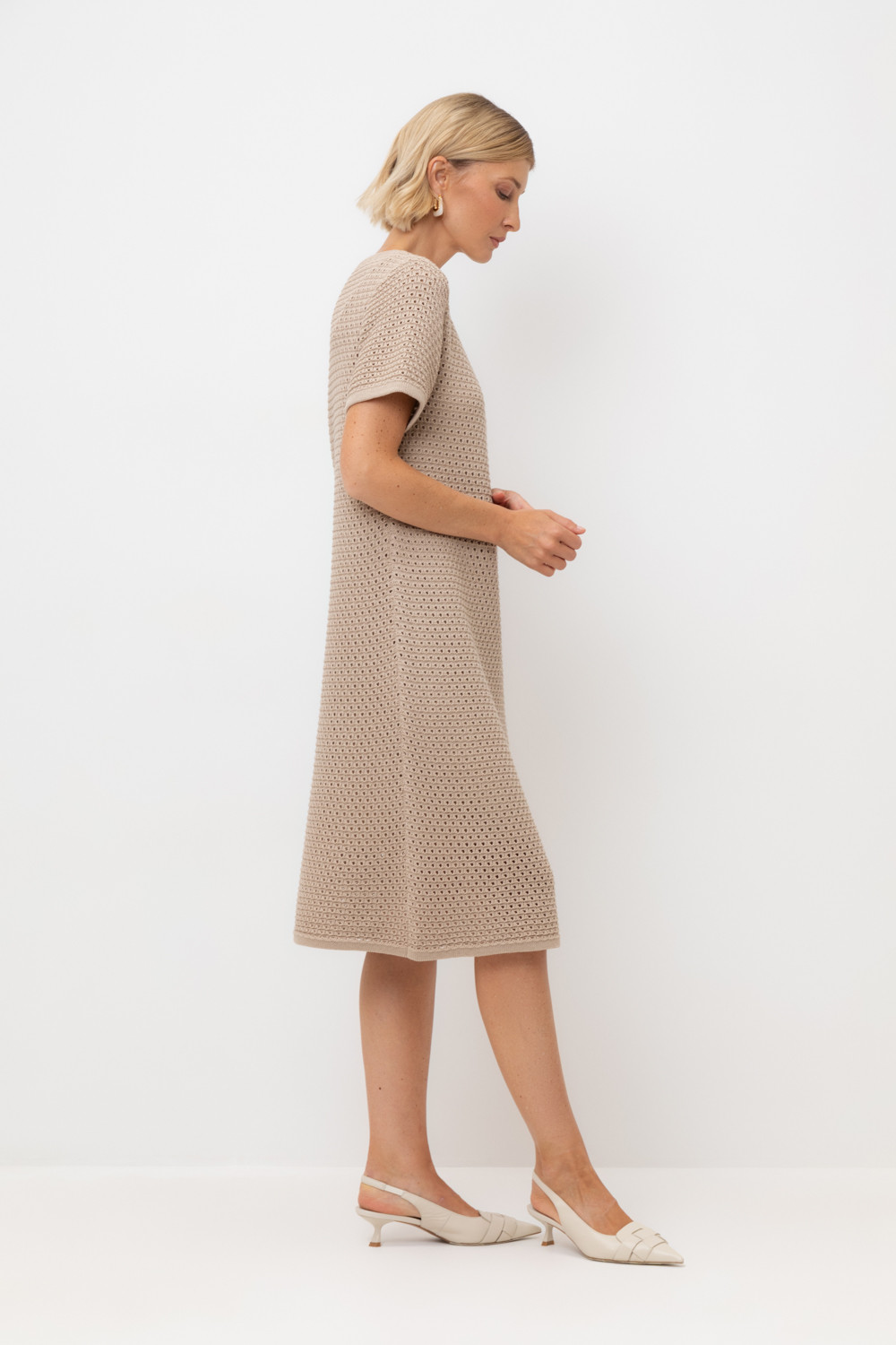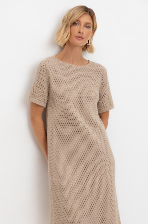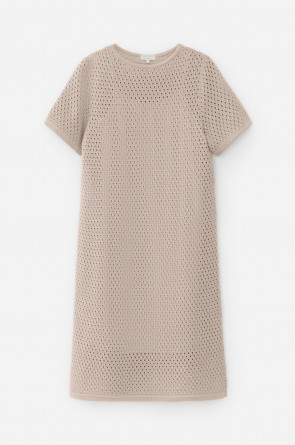 Платье ажурной вязки в универсальном бежевом цвете из итальянского хлопка. Дополняет изделие внутренний невесомый подклад из премиального бифлекса телесного цвета. Хлопок в составе сохраняет форму и дарит ощущение комфорта во время носки.