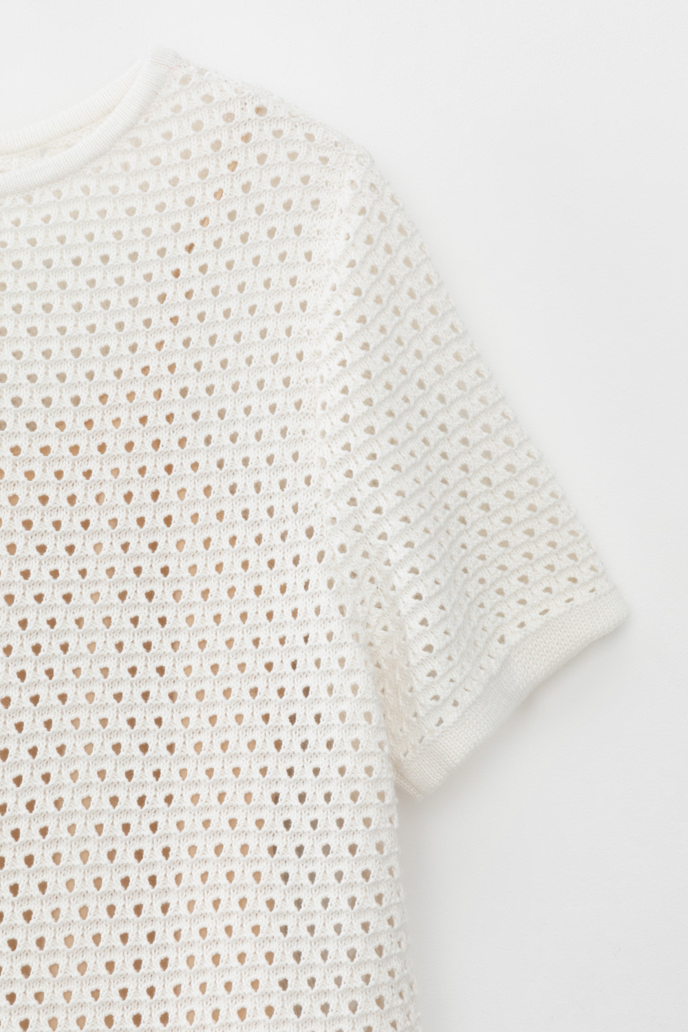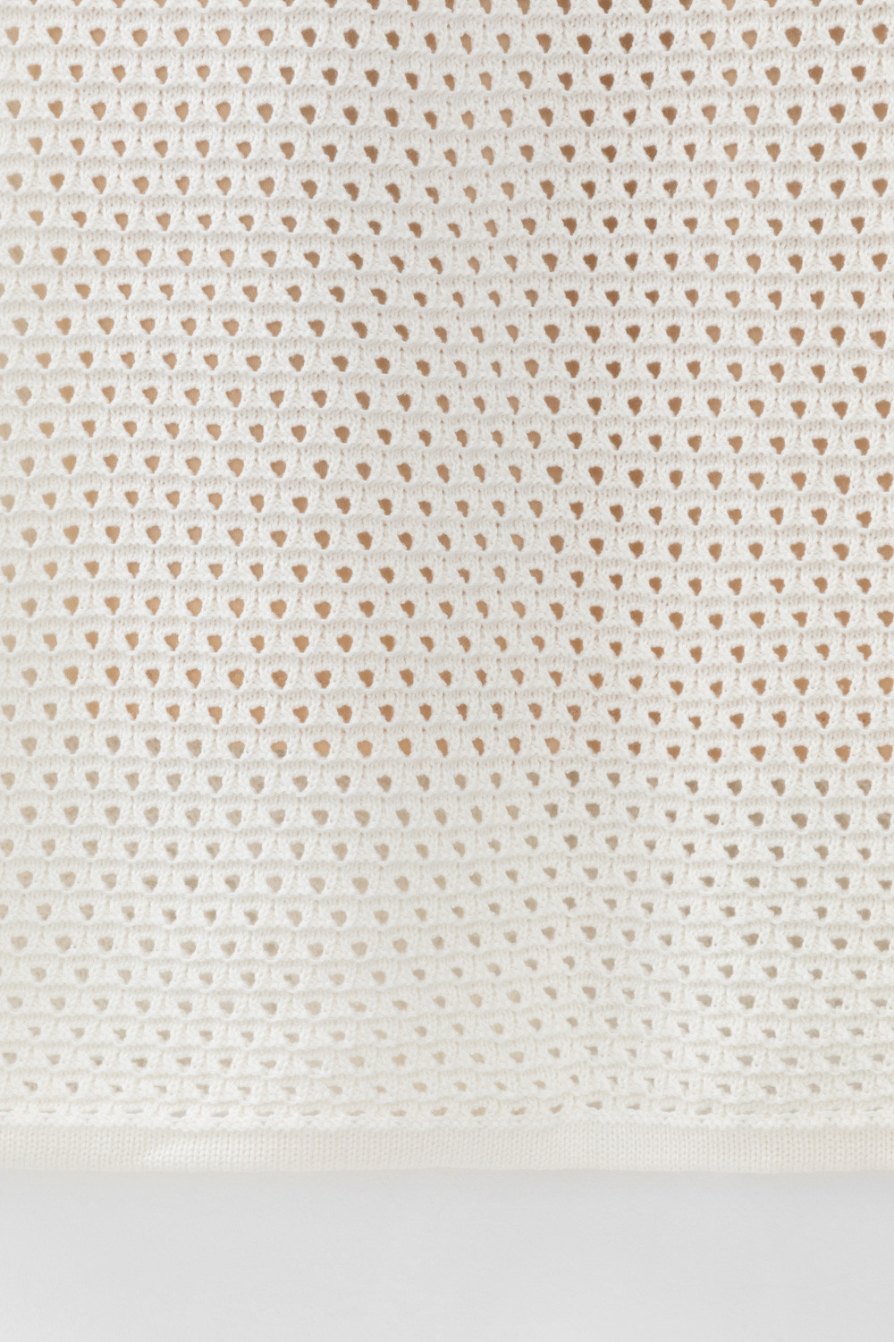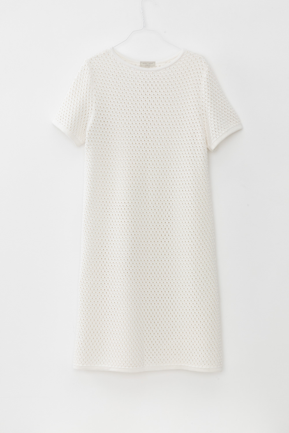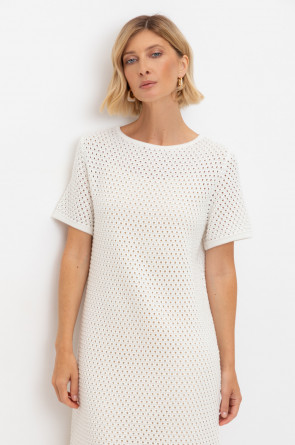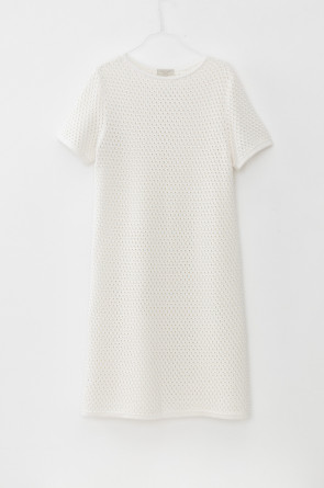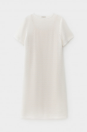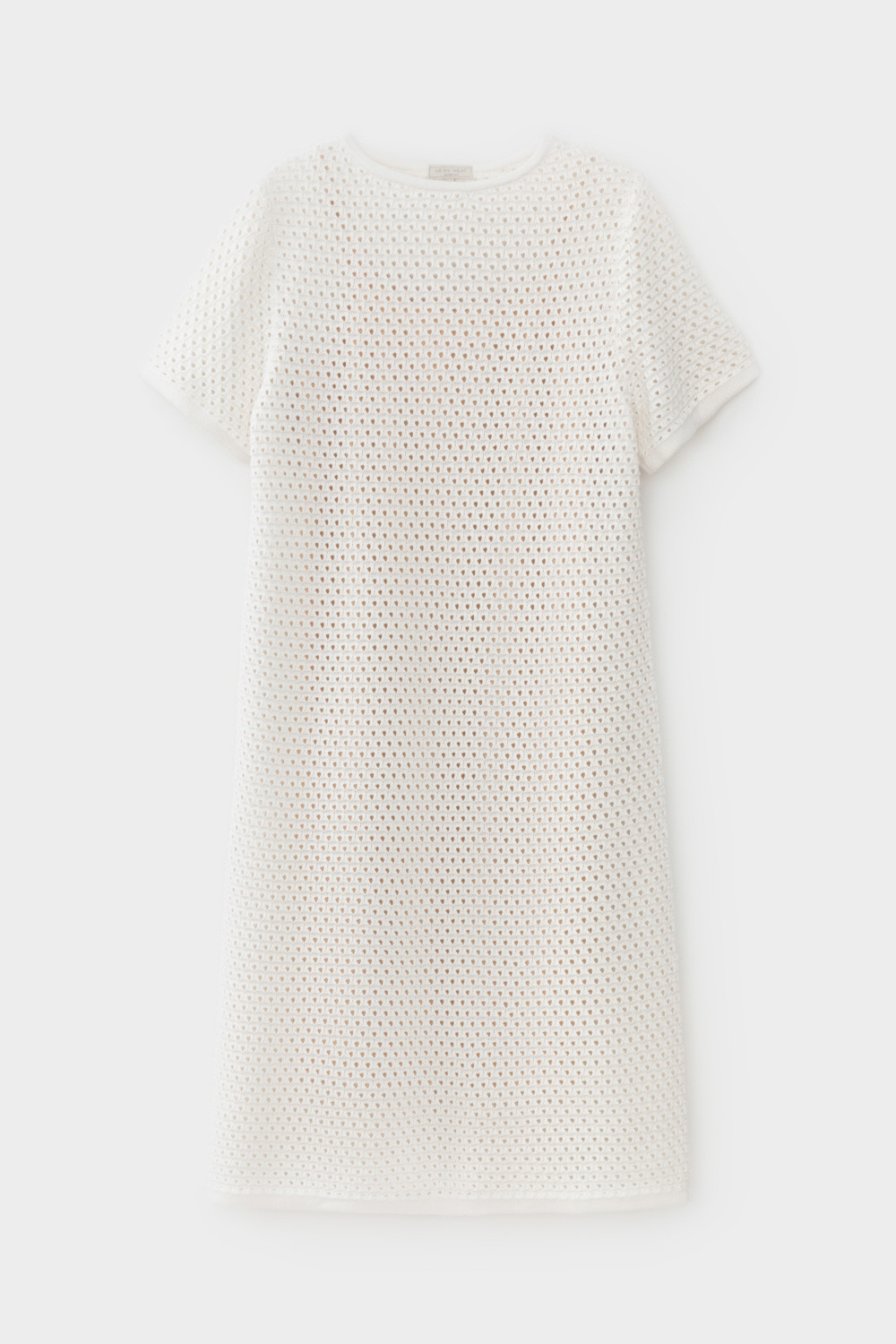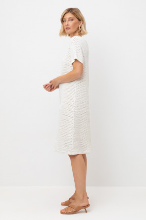 Платье ажурной вязки в молочном оттенке из итальянского хлопка. Дополняет изделие внутренний невесомый подклад из премиального бифлекса телесного цвета. Хлопок в составе сохраняет форму и дарит ощущение комфорта во время носки.