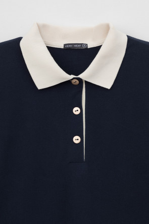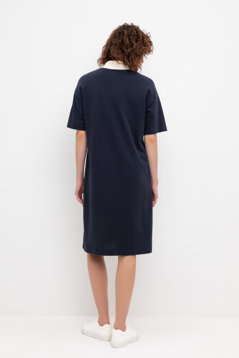 Трикотажное платье-поло из длинноволокнистого гребенного хлопка. Спущенное плечо придает изделию свободный силуэт.