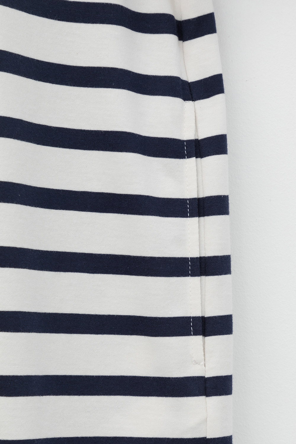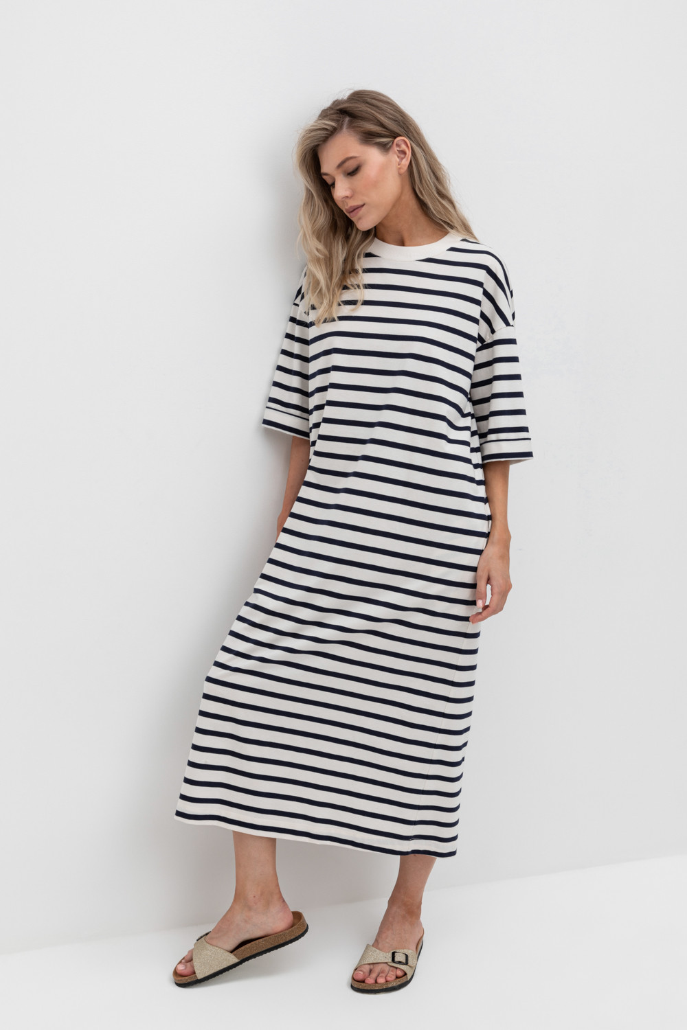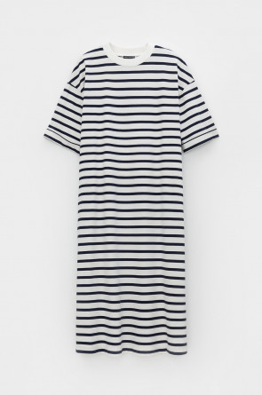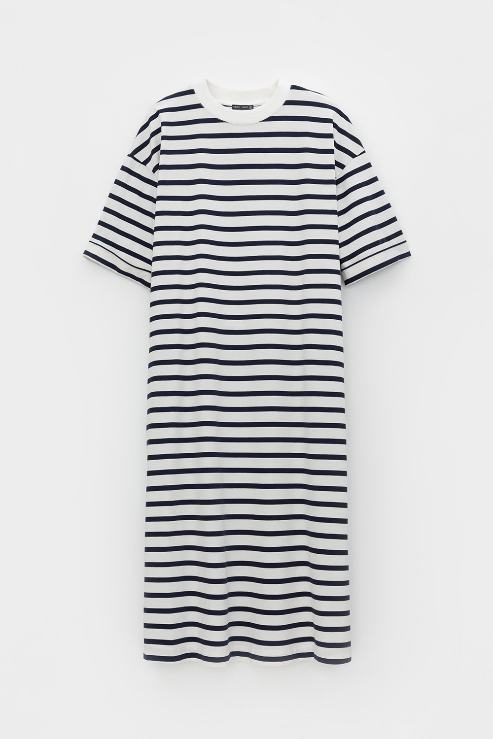 Трикотажное платье в полоску из длинноволокнистого гребенного хлопка. Спущенное плечо придает изделию свободный силуэт.