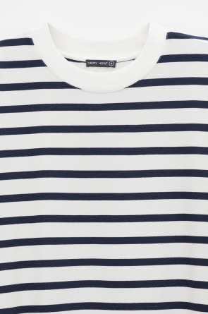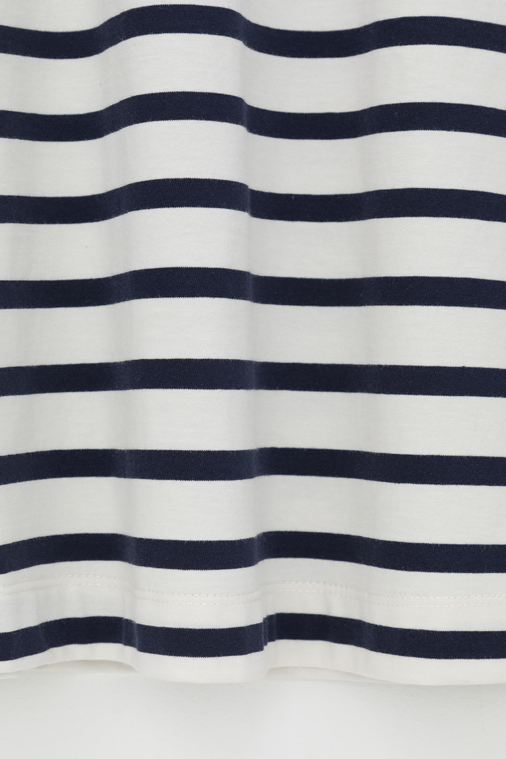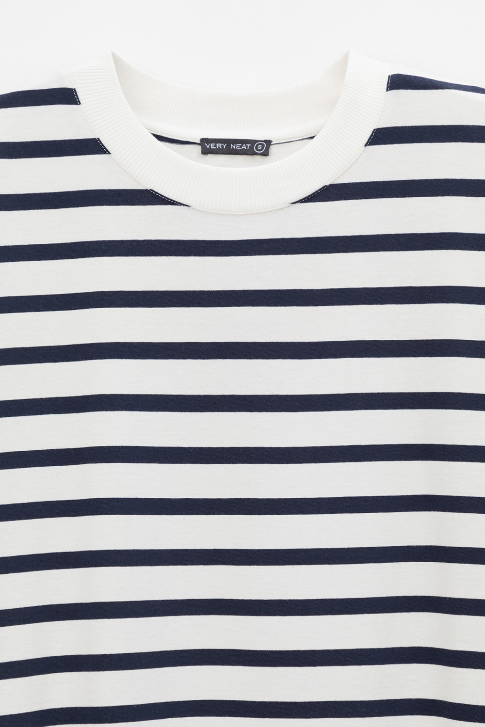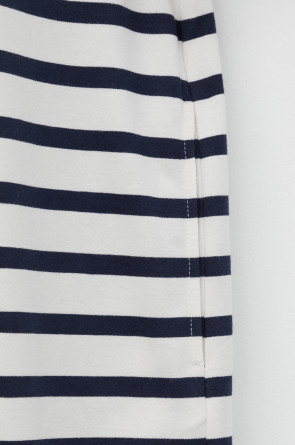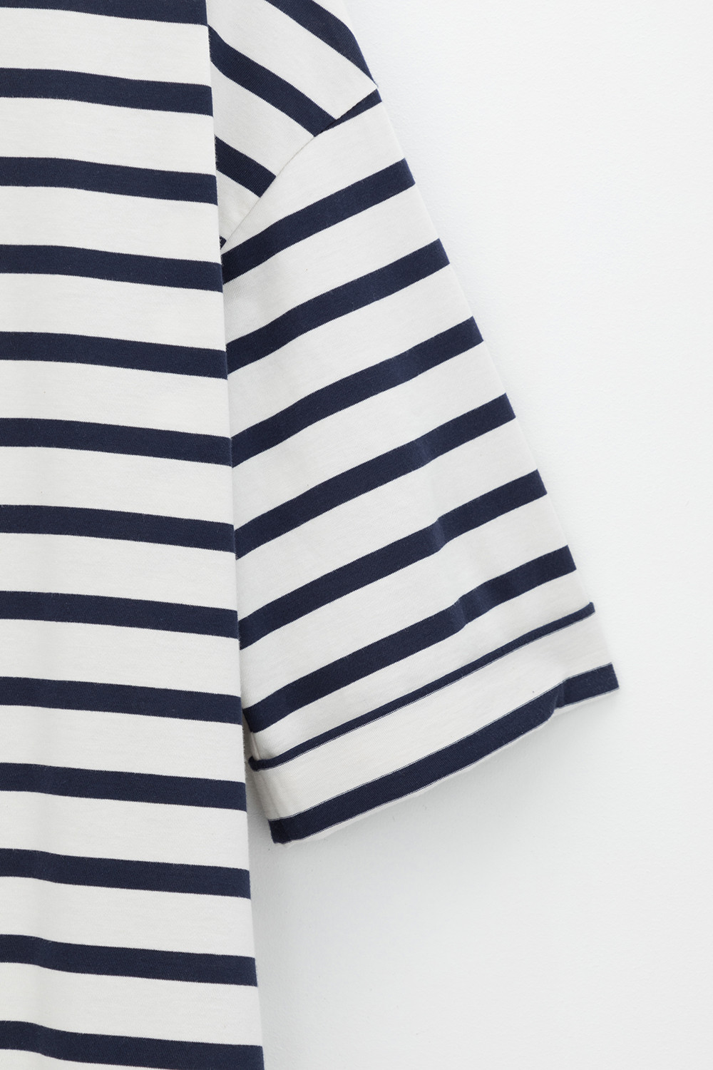 Трикотажное платье в полоску из длинноволокнистого гребенного хлопка. Спущенное плечо придает изделию свободный силуэт.