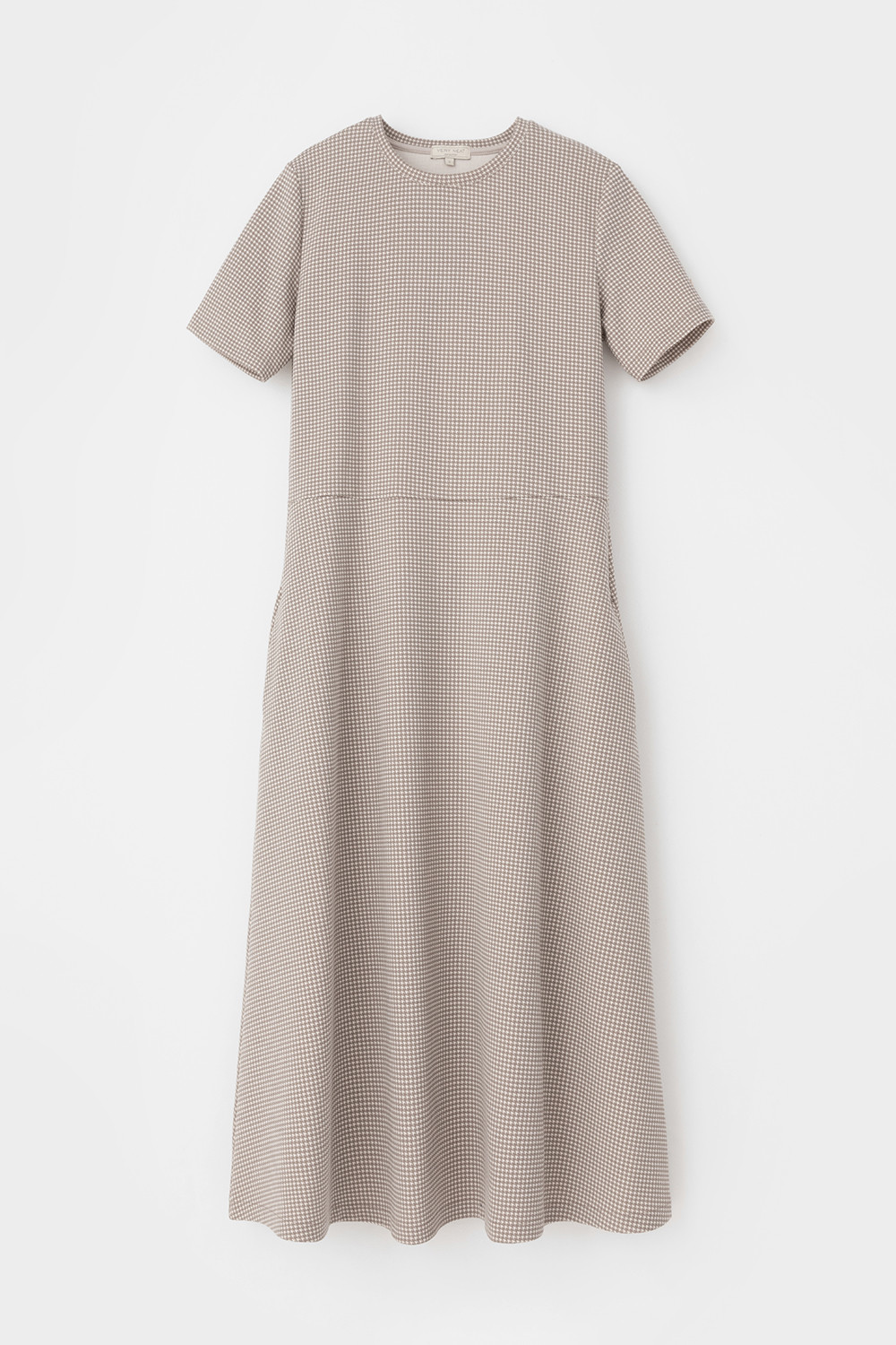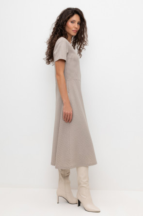 Платье с круглым вырезом и короткими рукавами из плотного набивного трикотажа интерлок. Модель с трапециевидной юбкой и боковыми карманами.